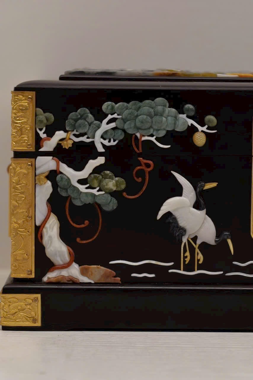Bề mặt ứng dụng kỹ nghệ bách bảo khảm tinh xảo, kết hợp ngọc thạch, ốc trai tạo nên cảnh hạc bay, tùng vươn tuyệt đẹp.