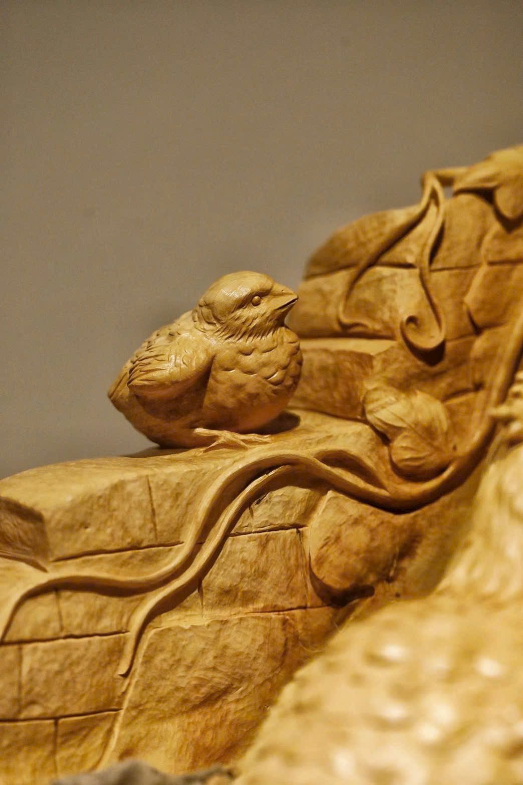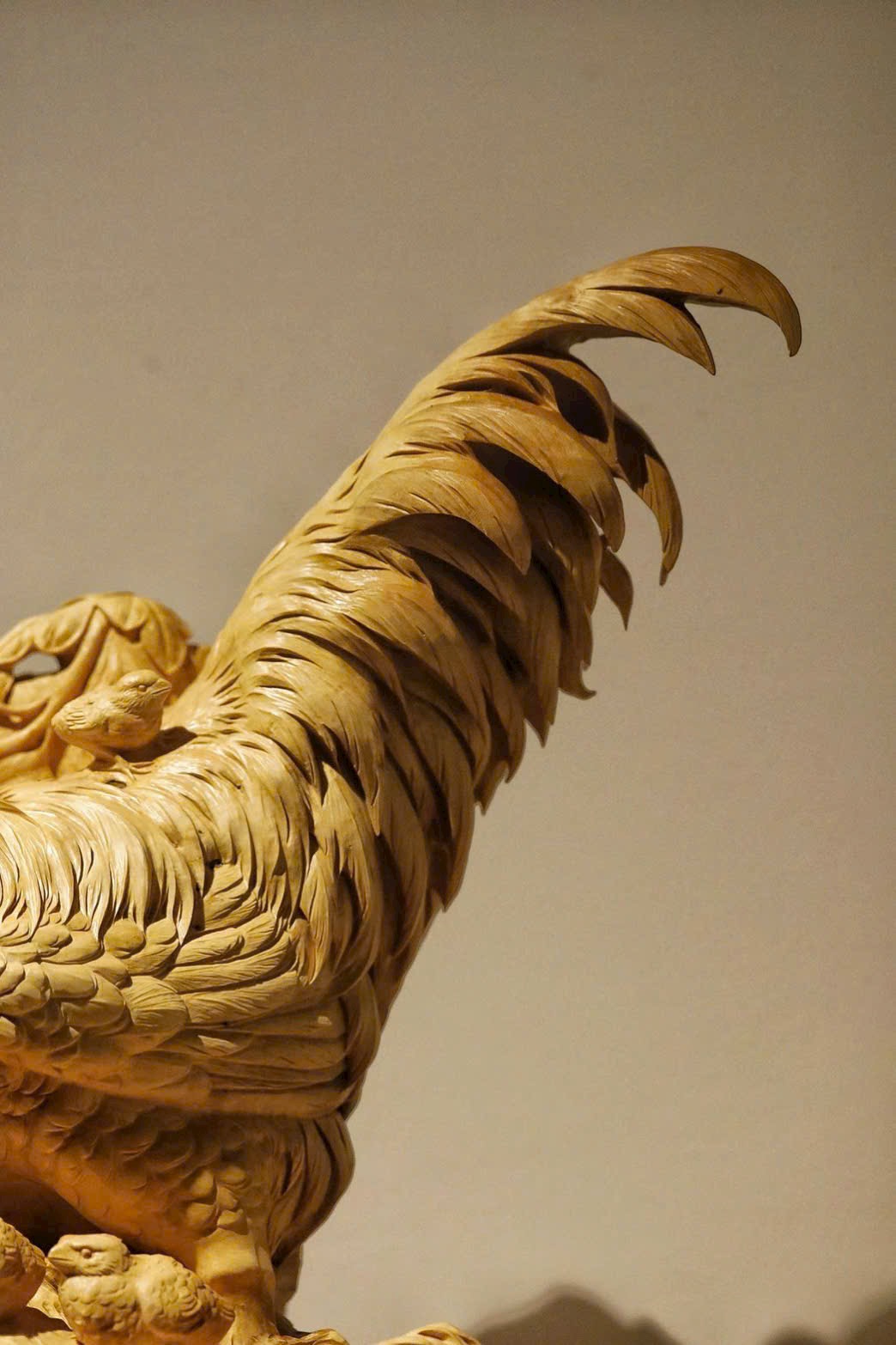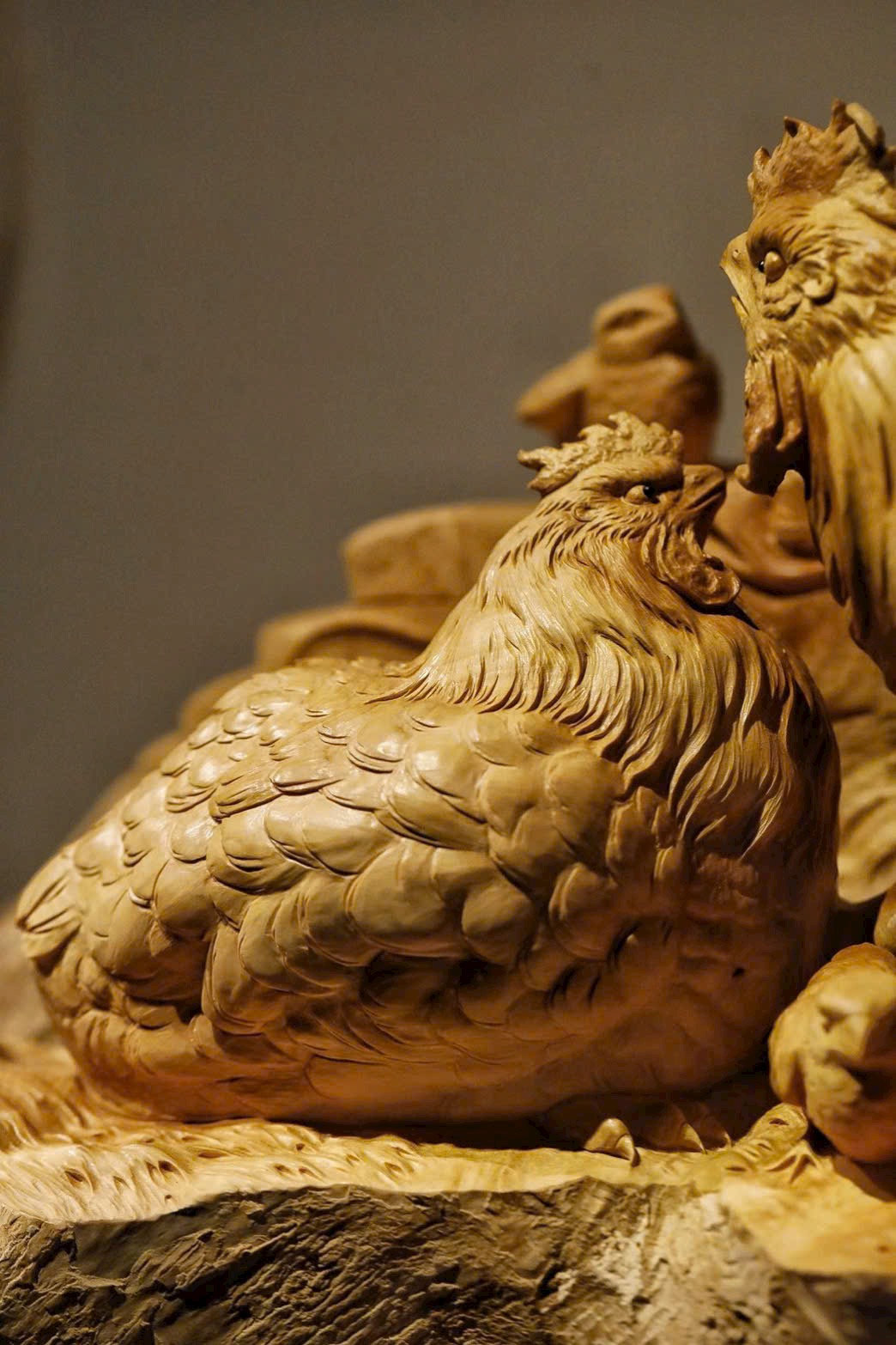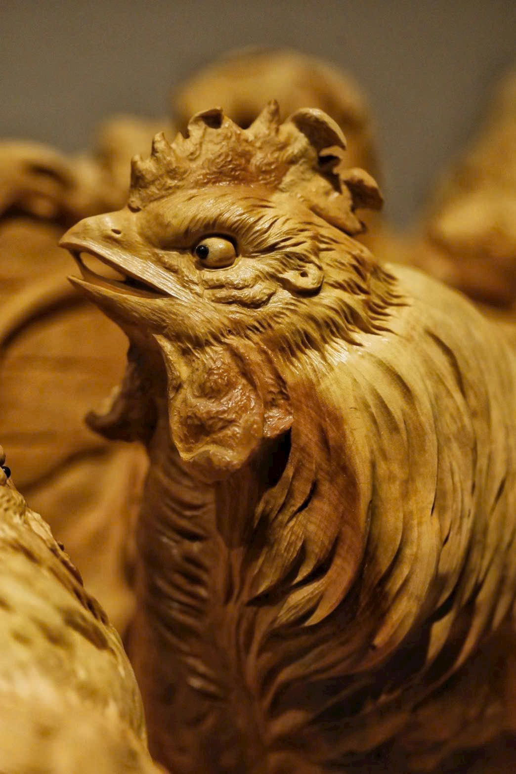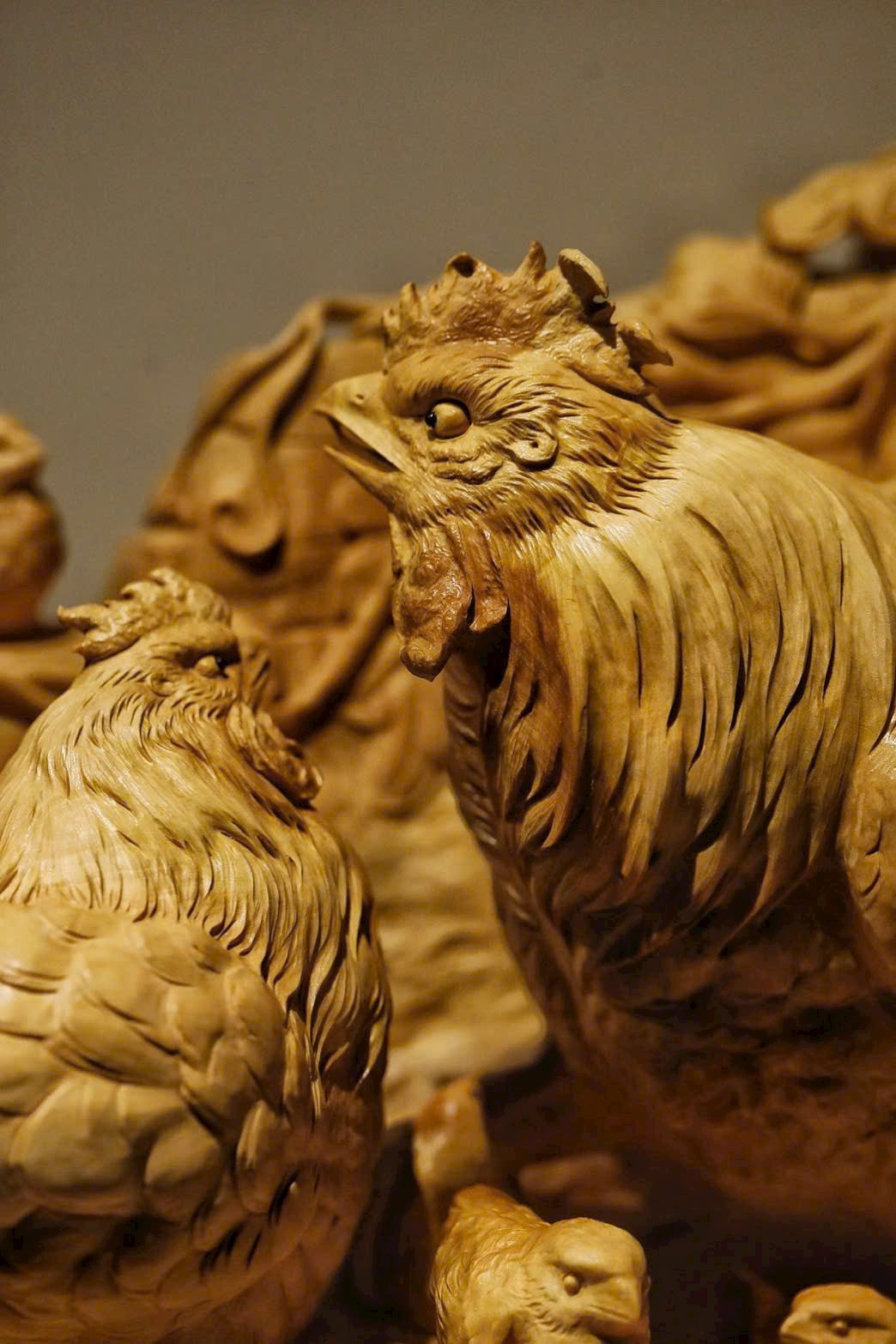 Tác phẩm chạm khắc thủ công từ một khối gỗ duy nhất, đường nét uyển chuyển mà ẩn chứa cốt lực. Quần gà được khắc họa sinh động, thần thái rõ nét: gà trống ngẩng đầu rung cánh oai phong, gà mái hiền hòa che chở đàn con, gà con ríu rít vui đùa. Chữ “鸡” (gà) đồng âm với “吉” (cát), mượn lối chơi chữ gửi gắm ý nghĩa cát tường, gia đình sum vầy hạnh phúc. Bày tại phòng khách hay án kỷ, mang lại trọn vẹn thú vui thiên luân, ấm áp và trang nhã.