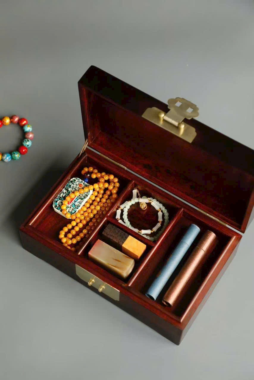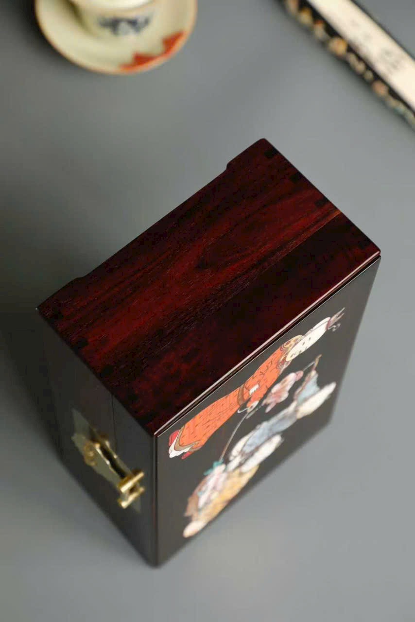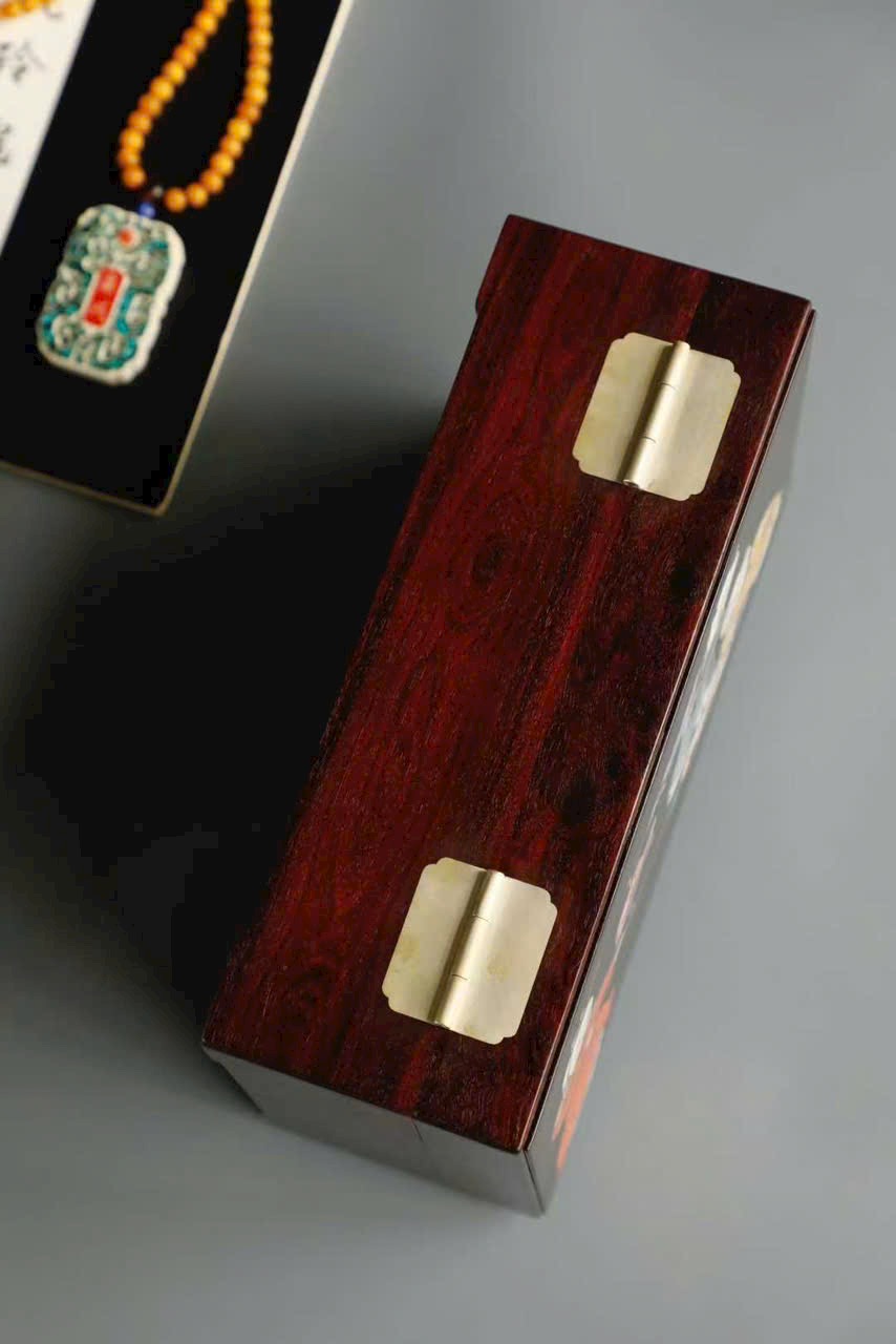 Chế tác từ gỗ tử đàn tiểu diệp Ấn Độ theo kỹ thuật mộng ghép cổ truyền, sử dụng ván dày nặng, không gian bên trong bo tròn tinh tế, không chia sẵn định dạng. Chất gỗ chọn lọc với mật độ cao, viền đồng đính phẳng thủ công tinh xảo. Kiểu dáng thanh nhã, mặt hộp khảm vỏ trai hoạ tiết “Bình an phú quý”. Là món sưu tầm hữu dụng, bên trong thiết kế nhiều ngăn chứa tiện lợi.