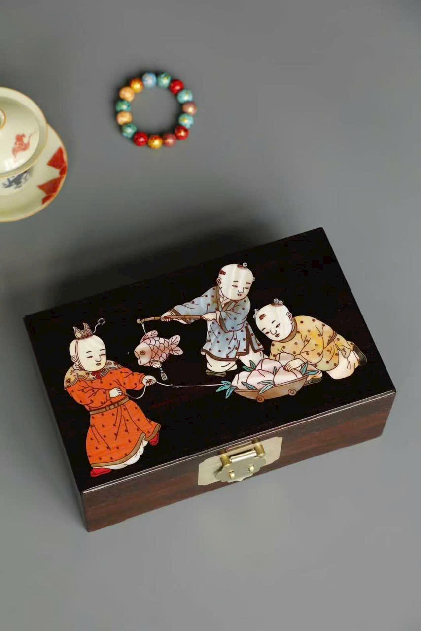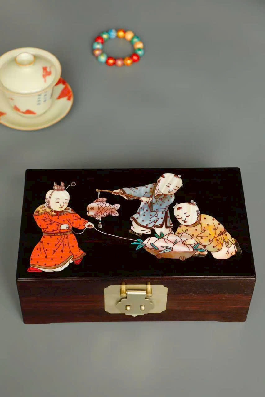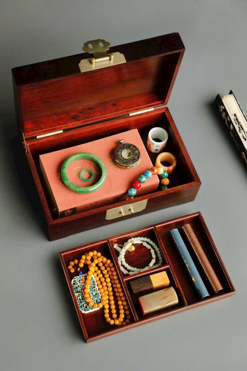 Chế tác từ gỗ tử đàn tiểu diệp Ấn Độ theo kỹ thuật mộng ghép cổ truyền, sử dụng ván dày nặng, không gian bên trong bo tròn tinh tế, không chia sẵn định dạng. Chất gỗ chọn lọc với mật độ cao, viền đồng đính phẳng thủ công tinh xảo. Kiểu dáng thanh nhã, mặt hộp khảm vỏ trai hoạ tiết “Bình an phú quý”. Là món sưu tầm hữu dụng, bên trong thiết kế nhiều ngăn chứa tiện lợi.