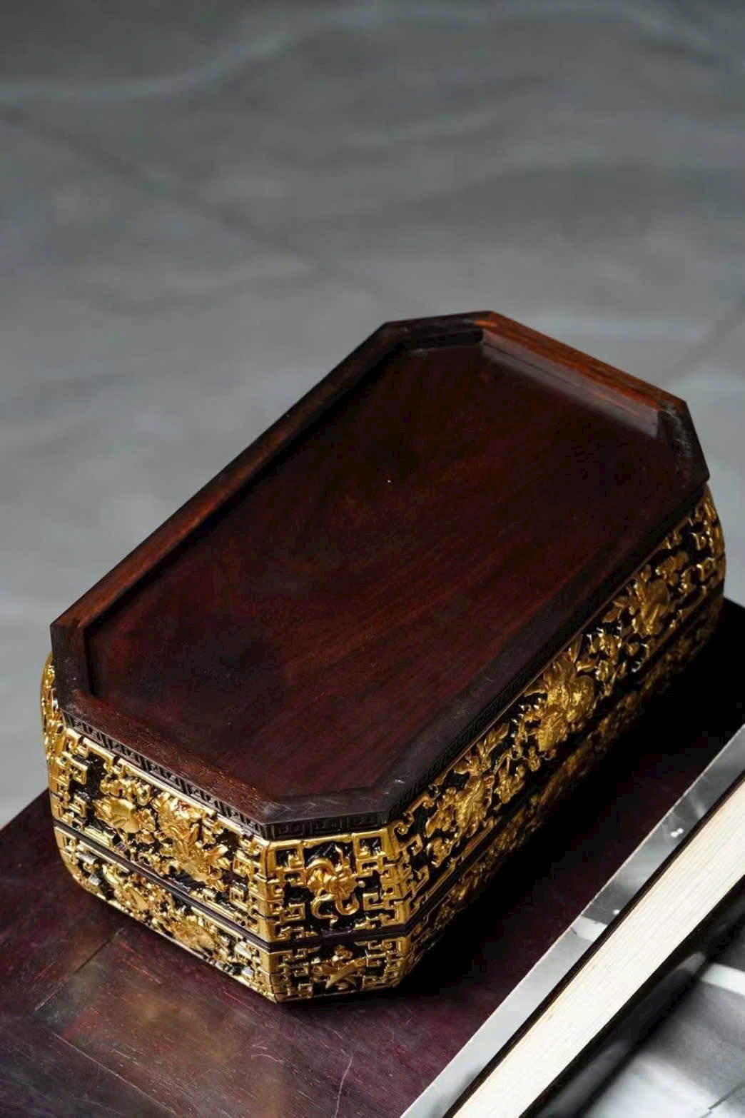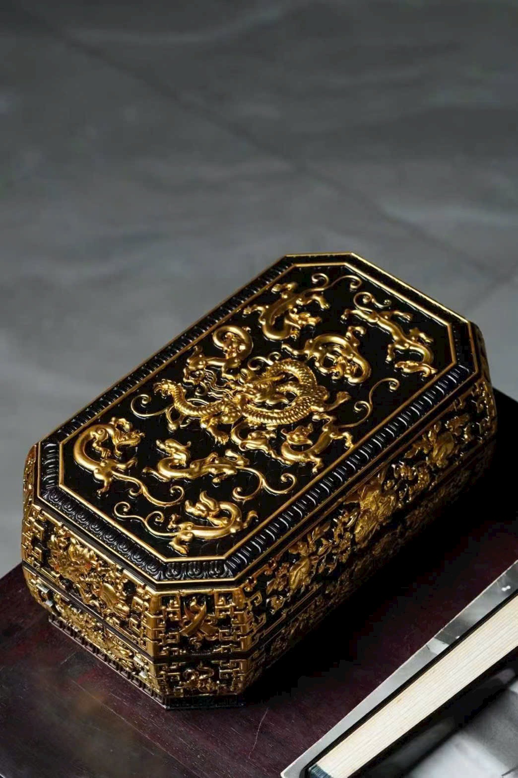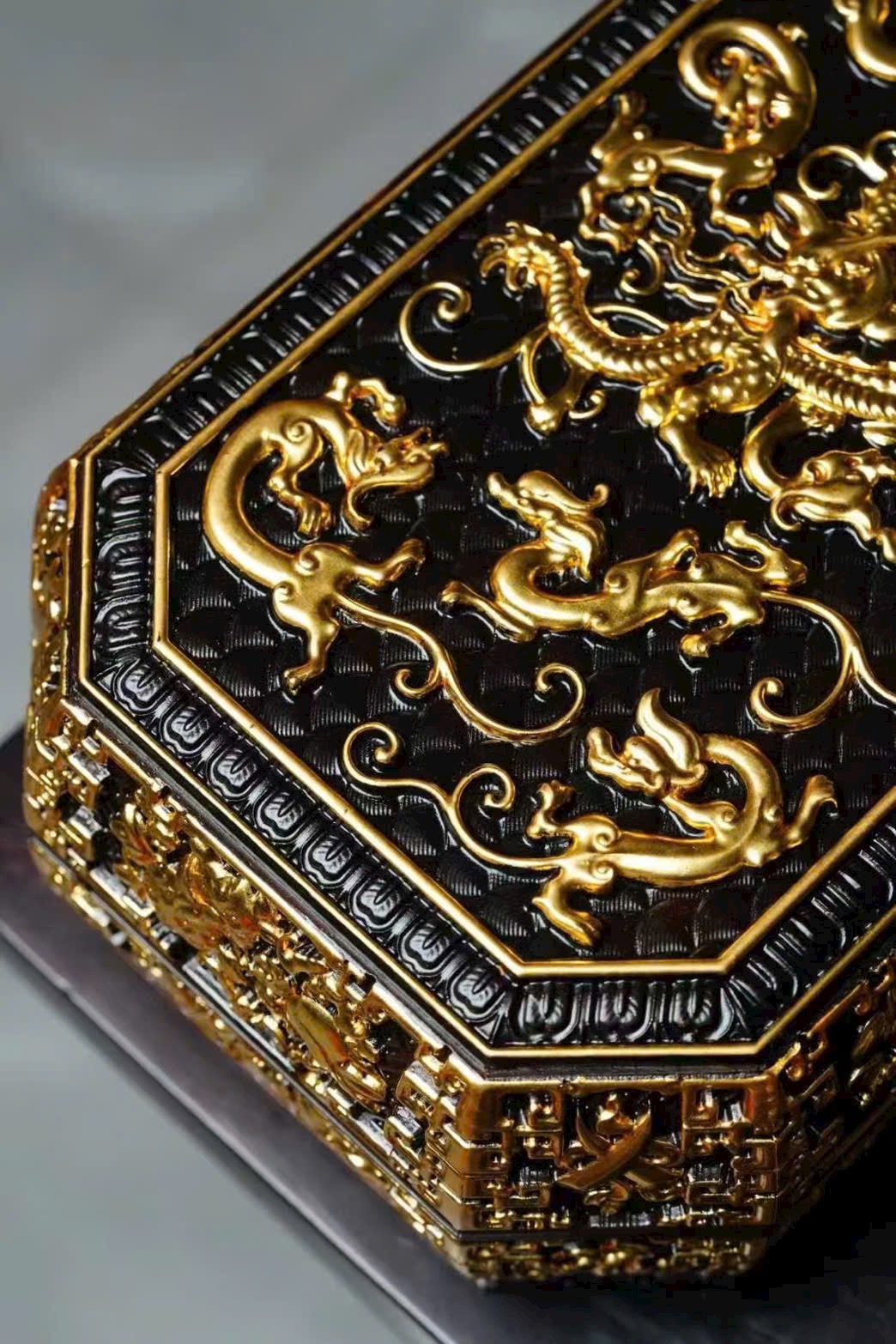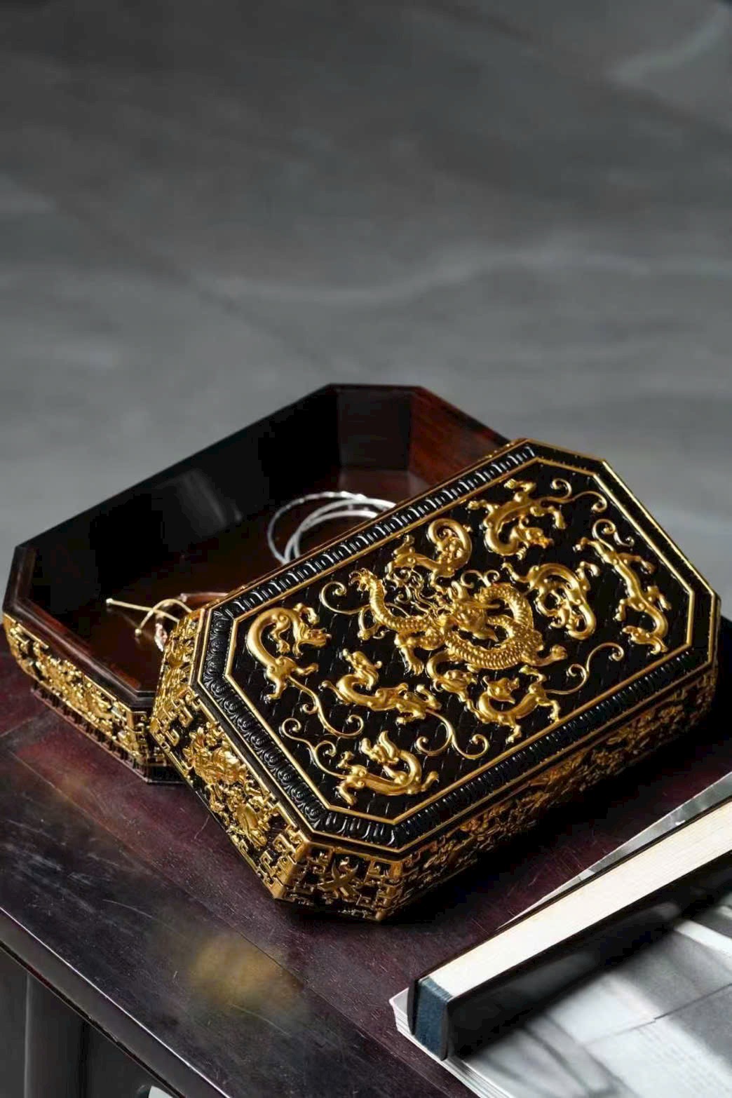 Tác phẩm được chế tác theo phong cách Cố Cung (Tử Cấm Thành), toàn thân dùng gỗ đại hồng toan chi quý hiếm, vân gỗ dày mịn, sắc đỏ trầm sang trọng. Nắp hộp chạm hình rồng dát vàng, uy nghi tinh xảo, biểu trưng cho quyền quý và cát tường. Đường nét chế tác sắc sảo, kết cấu vững chắc, vừa mang giá trị thẩm mỹ, vừa thể hiện khí vận hoàng gia.