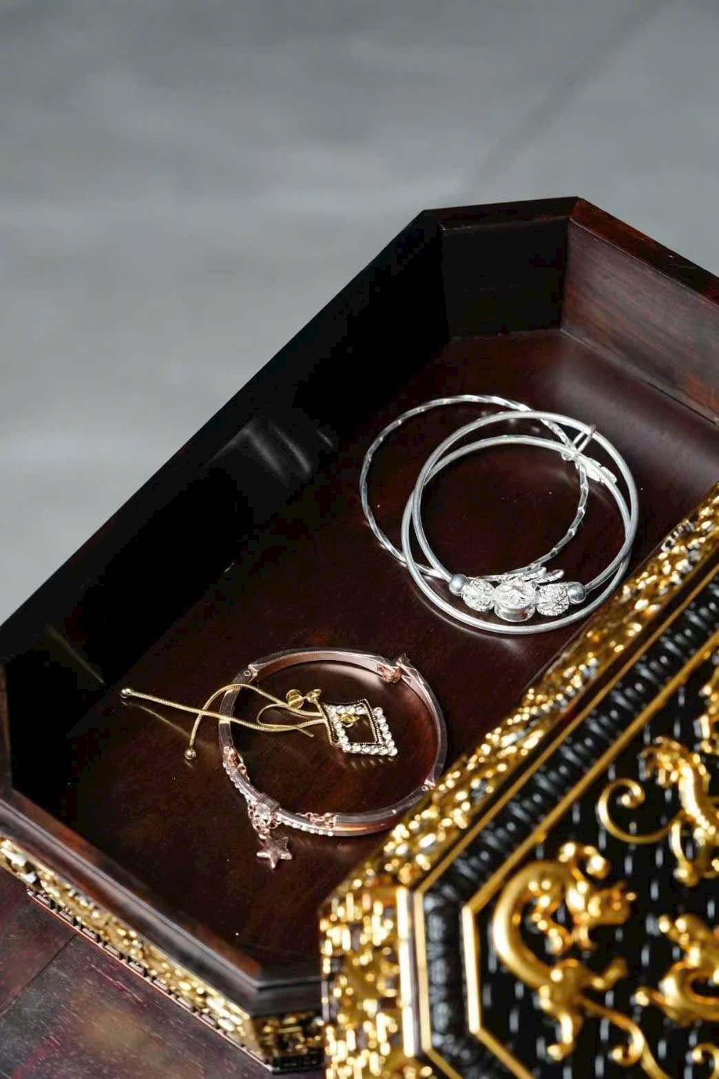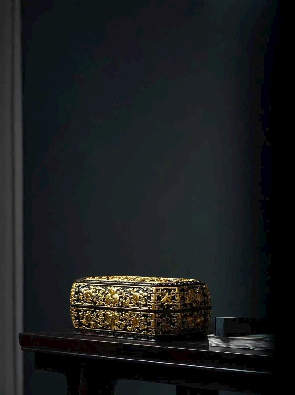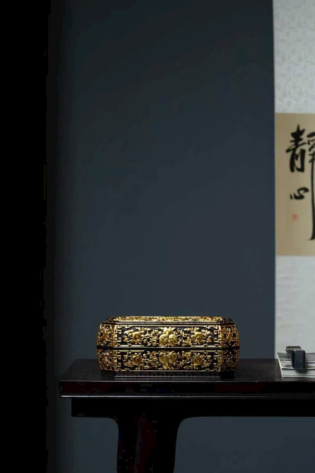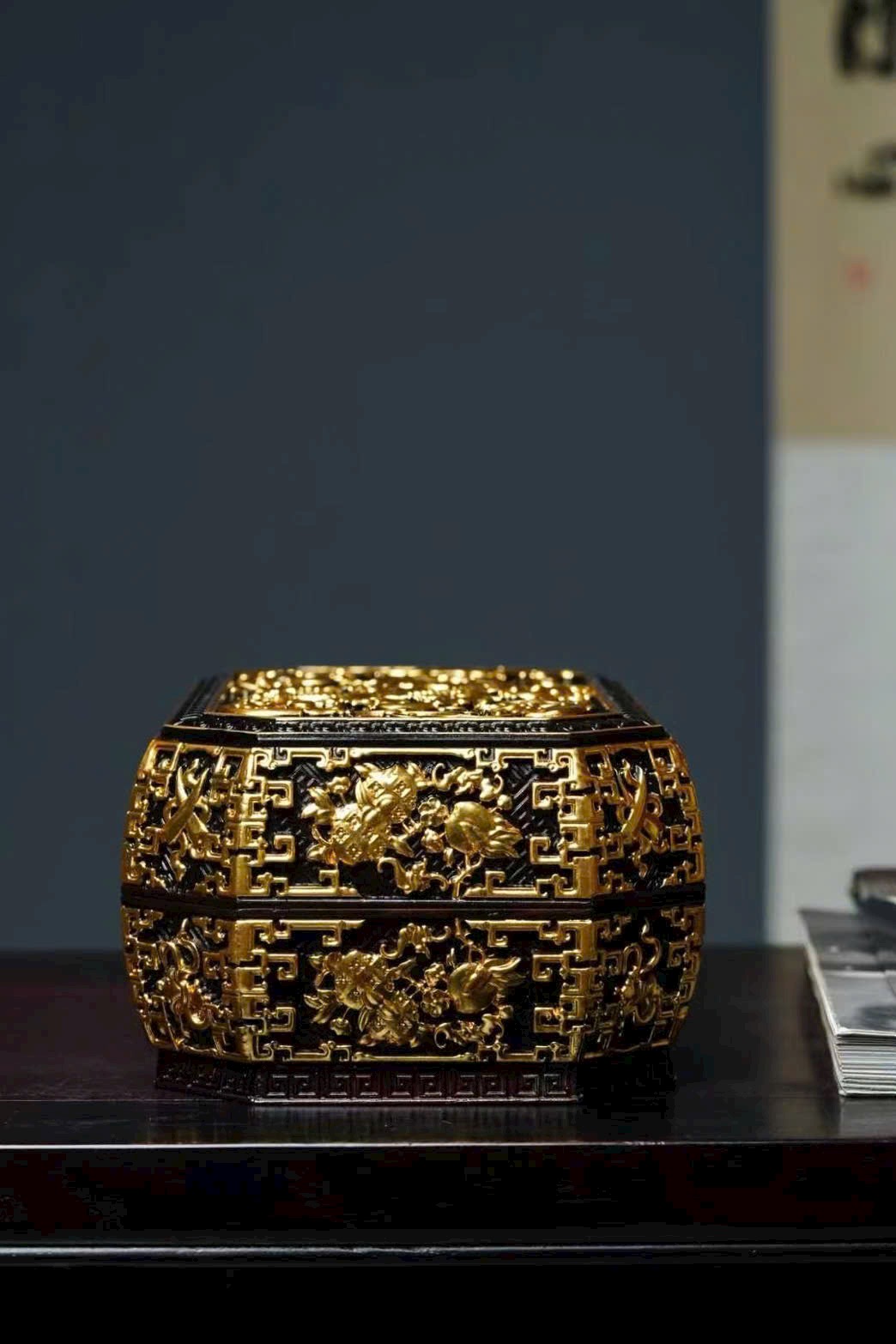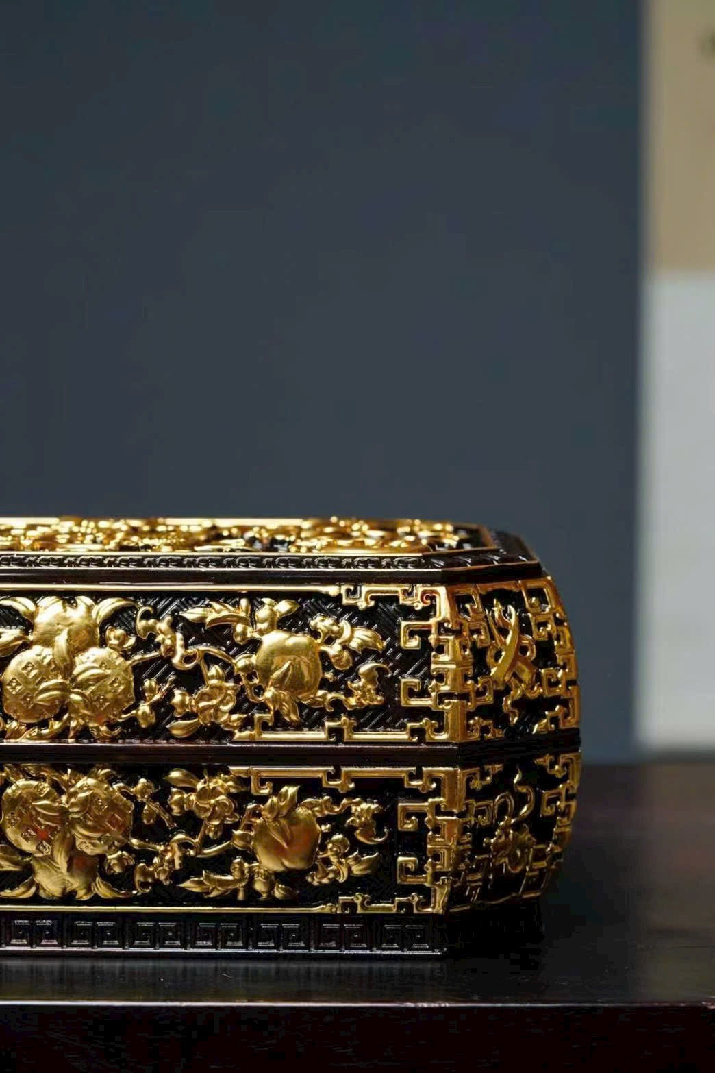 Tác phẩm được chế tác theo phong cách Cố Cung (Tử Cấm Thành), toàn thân dùng gỗ đại hồng toan chi quý hiếm, vân gỗ dày mịn, sắc đỏ trầm sang trọng. Nắp hộp chạm hình rồng dát vàng, uy nghi tinh xảo, biểu trưng cho quyền quý và cát tường. Đường nét chế tác sắc sảo, kết cấu vững chắc, vừa mang giá trị thẩm mỹ, vừa thể hiện khí vận hoàng gia.