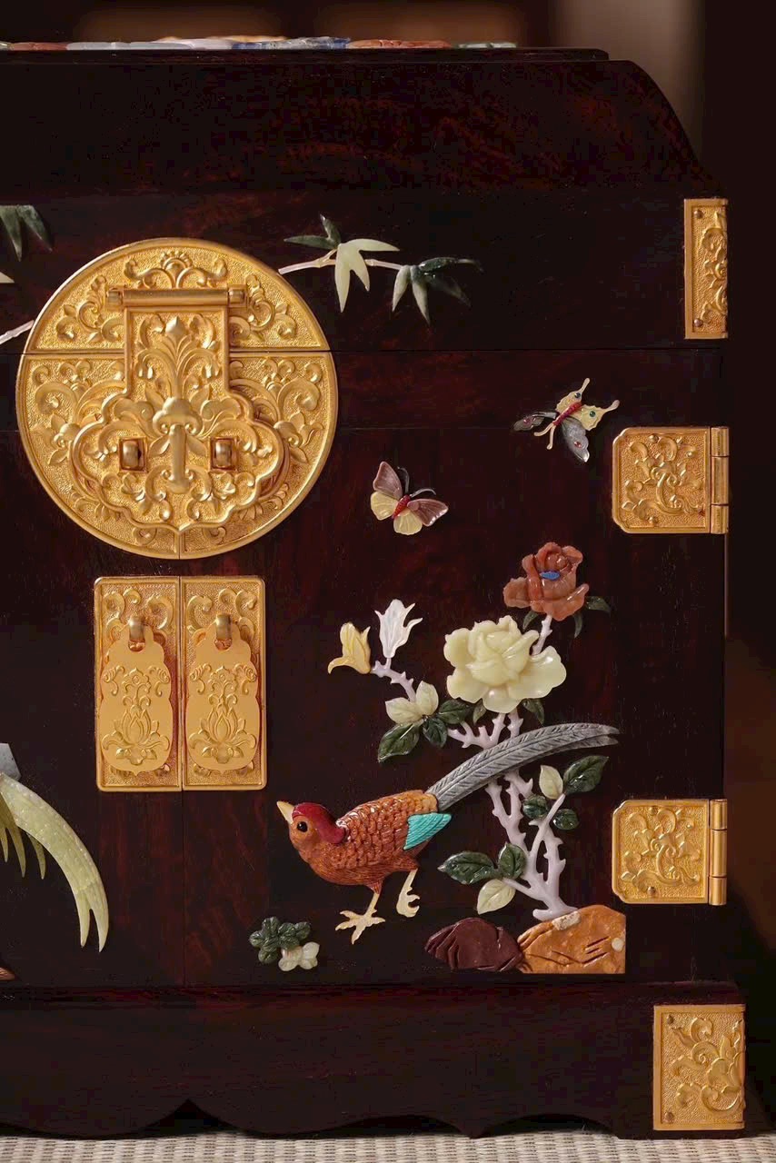 Hộp sử dụng chất liệu gỗ tử đàn lá nhỏ quý hiếm, nổi tiếng với vân gỗ mịn màng, sắc tím trầm sang trọng. Kỹ thuật khảm bách bảo (đá quý, ngọc, san hô, xà cừ…) kết hợp với họa tiết mạ vàng tinh xảo, tạo nên bức tranh “Bình An Phú Quý” sống động, đầy ý nghĩa. Tác phẩm sử dụng nhiều loại đá quý hiếm như: