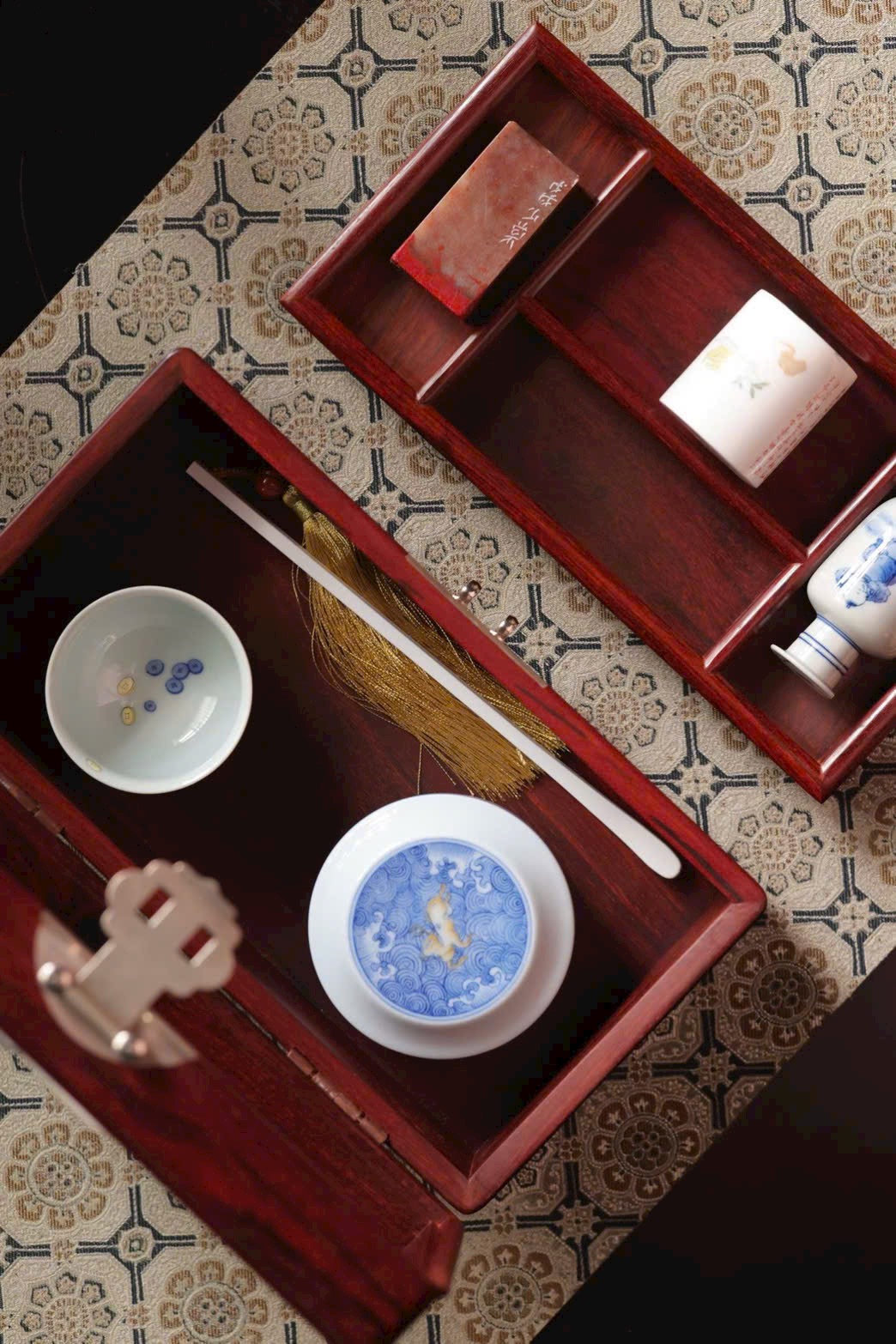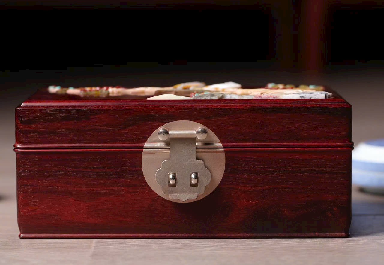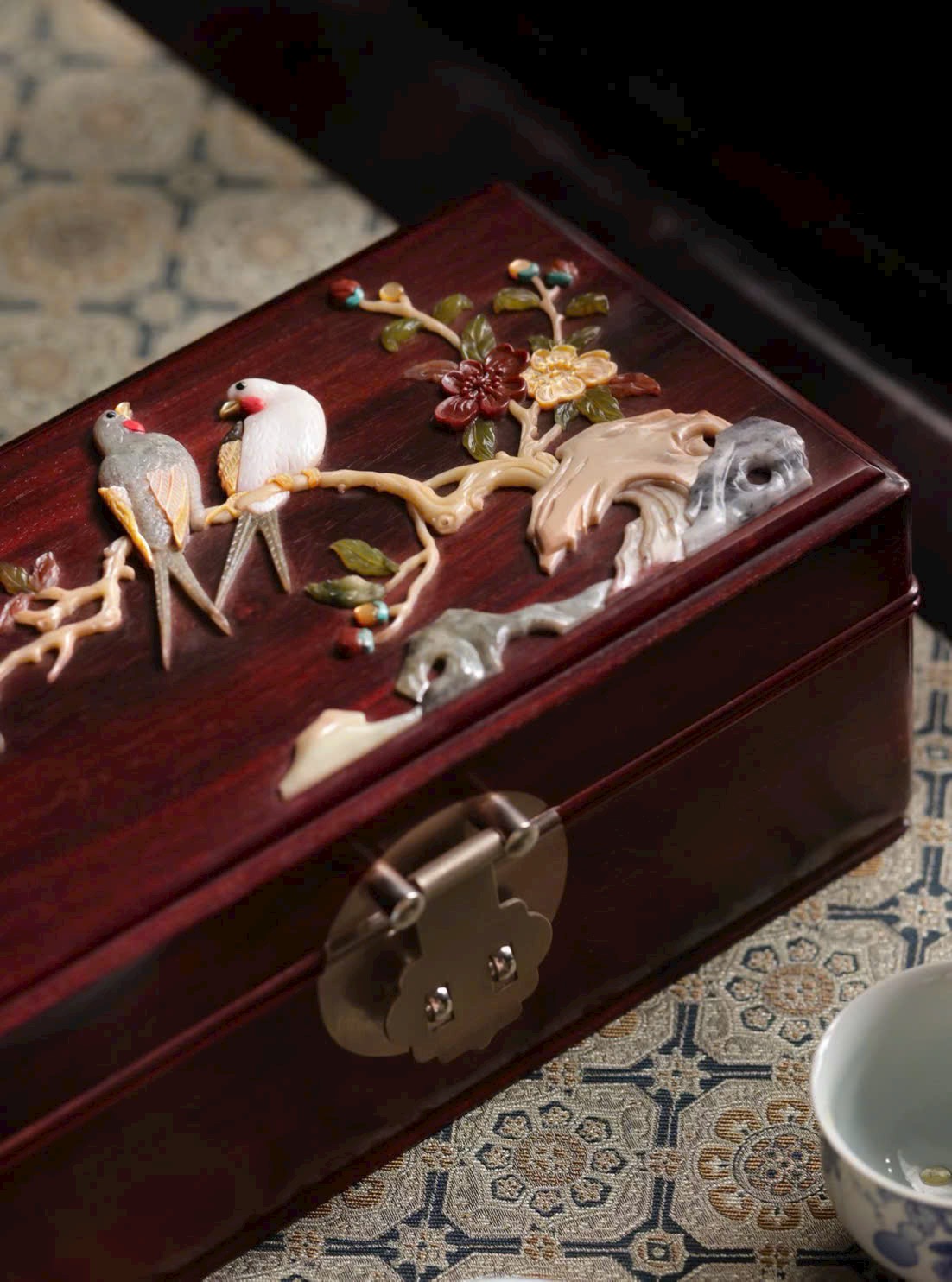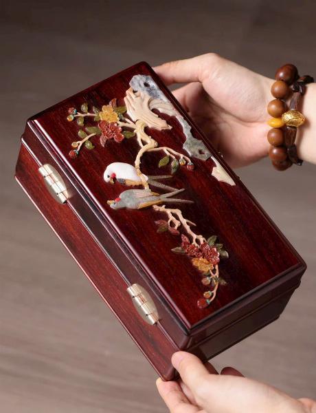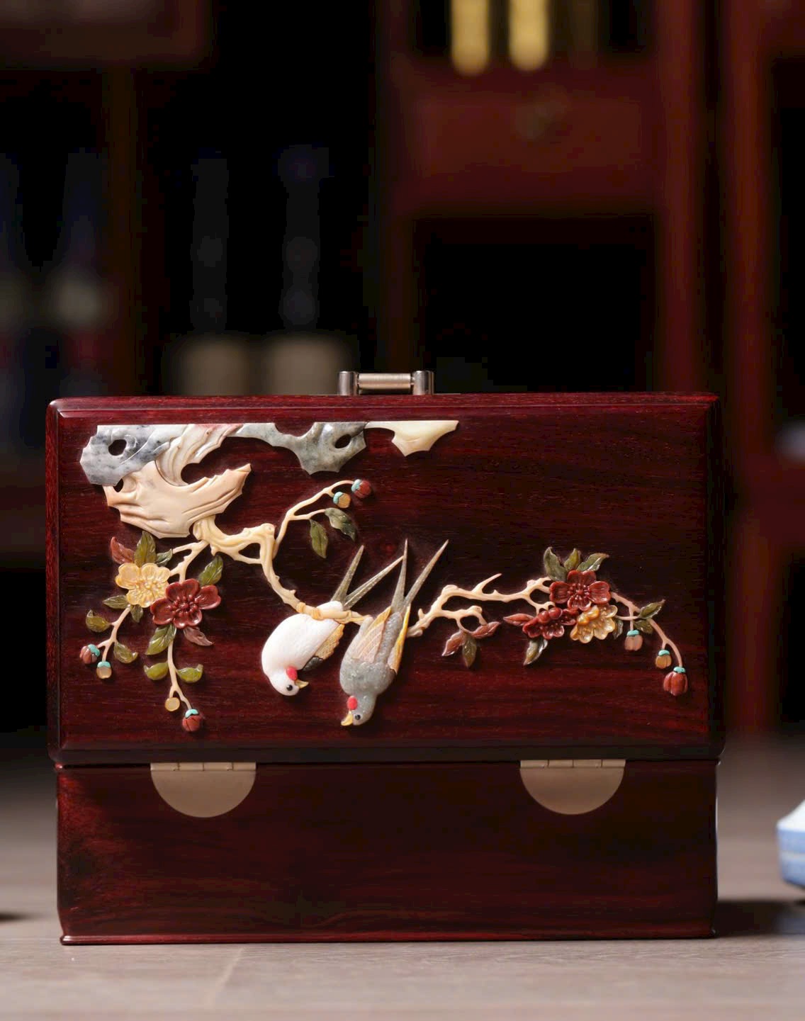 Chế tác từ tử đàn lão liệu, cấu trúc mộng thủ công tinh xảo. Nắp hộp ứng dụng kỹ nghệ khảm bách bảo cung đình, hoa nở rực rỡ, sinh động đầy sức sống, hàm chứa ý nghĩa cát tường. Bày trên án thư như một bức phong cảnh, vừa có thể lưu giữ châu báu, vừa là lễ vật cưới hỏi, thưởng dụng đều thích hợp.