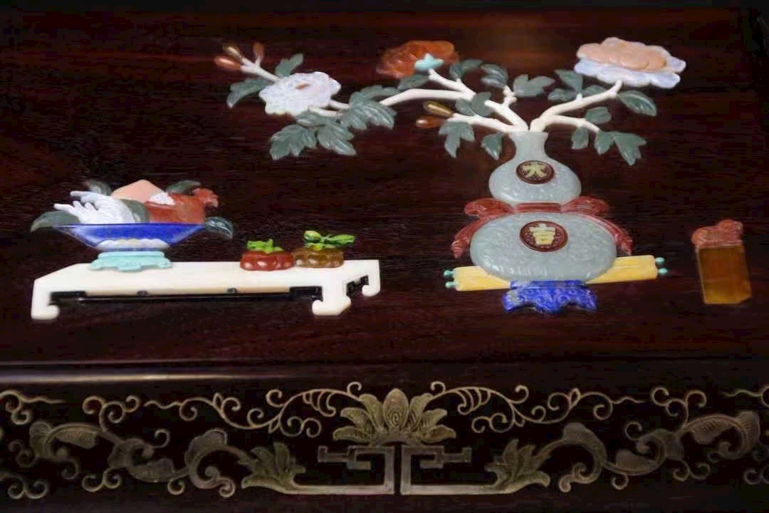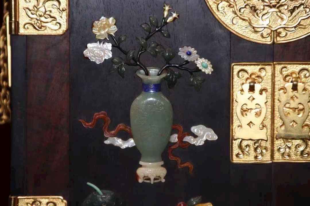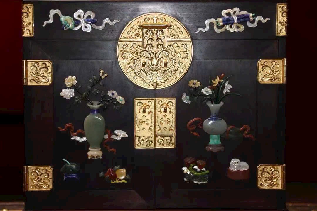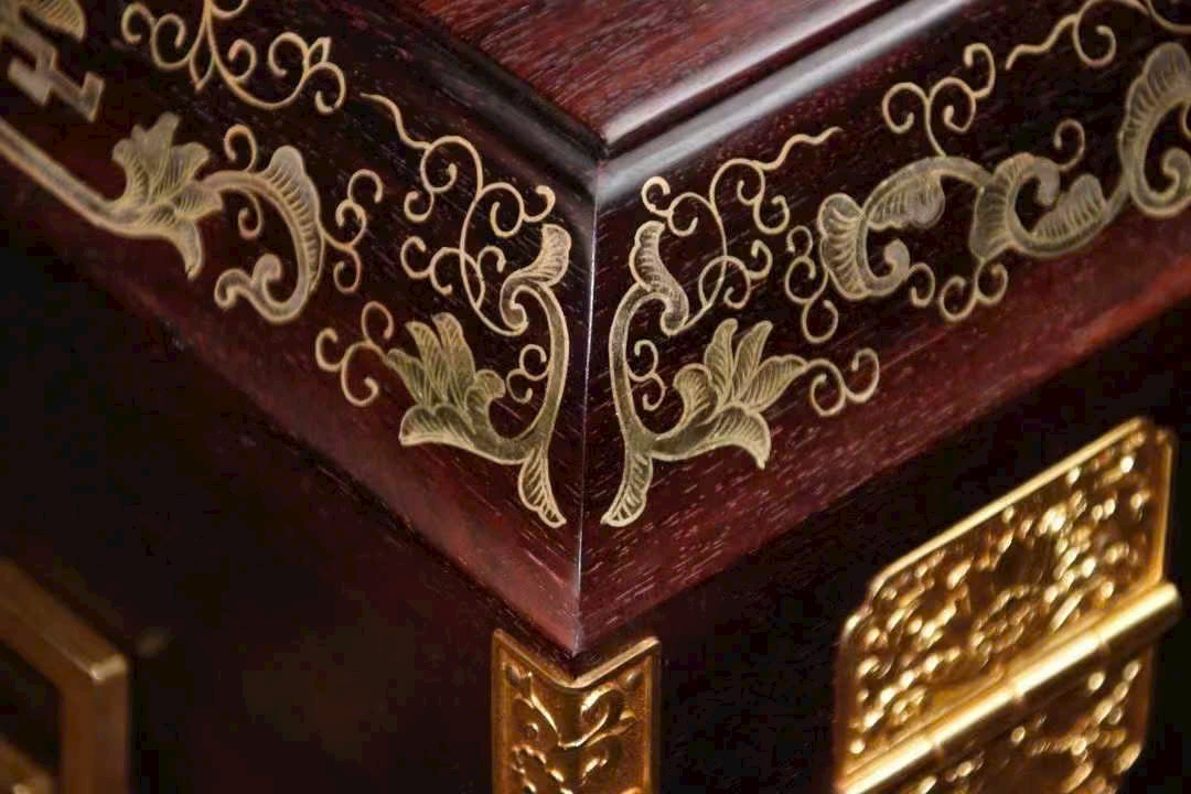Chế tác từ ván liền gỗ tử đàn lá nhỏ tuyển chọn, kết hợp phụ kiện đồng thau chạm khắc mạ vàng thật. Hai bên cánh cửa mặt trước khảm đồ án bách bảo tinh mỹ, mang ý nghĩa phúc lộc cát tường – phú quý bình an.