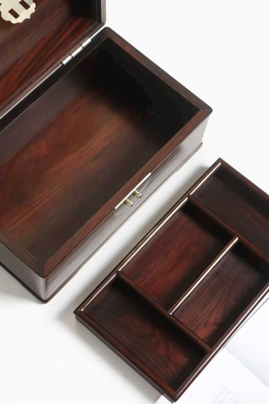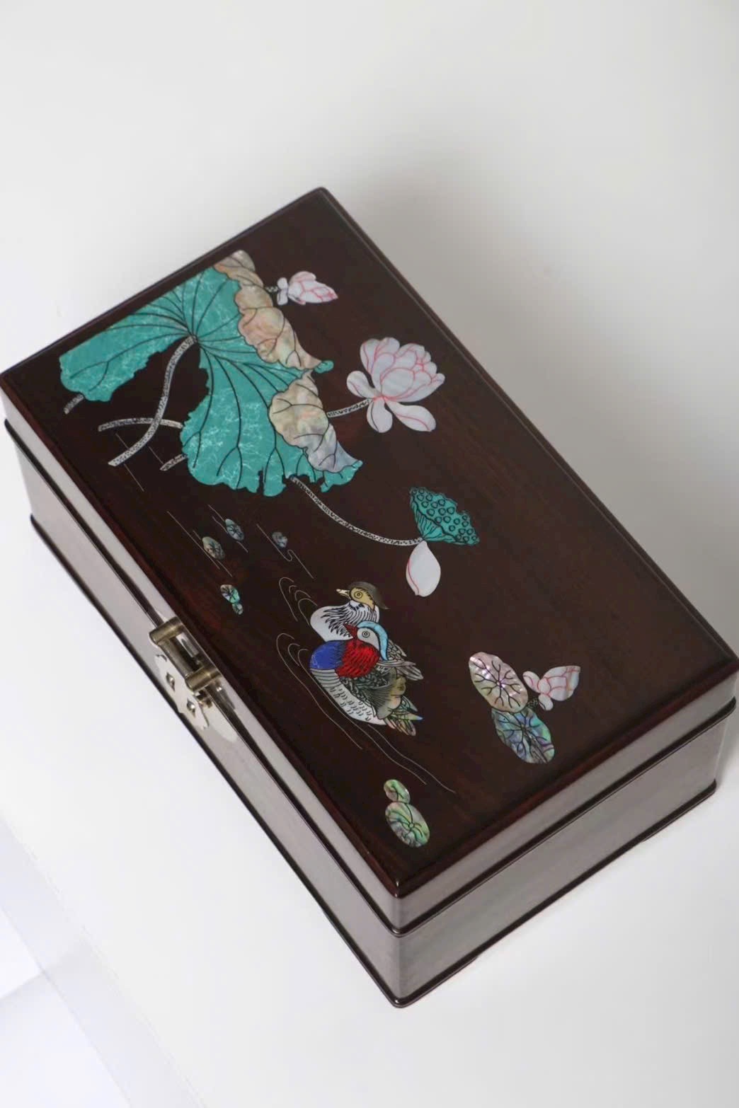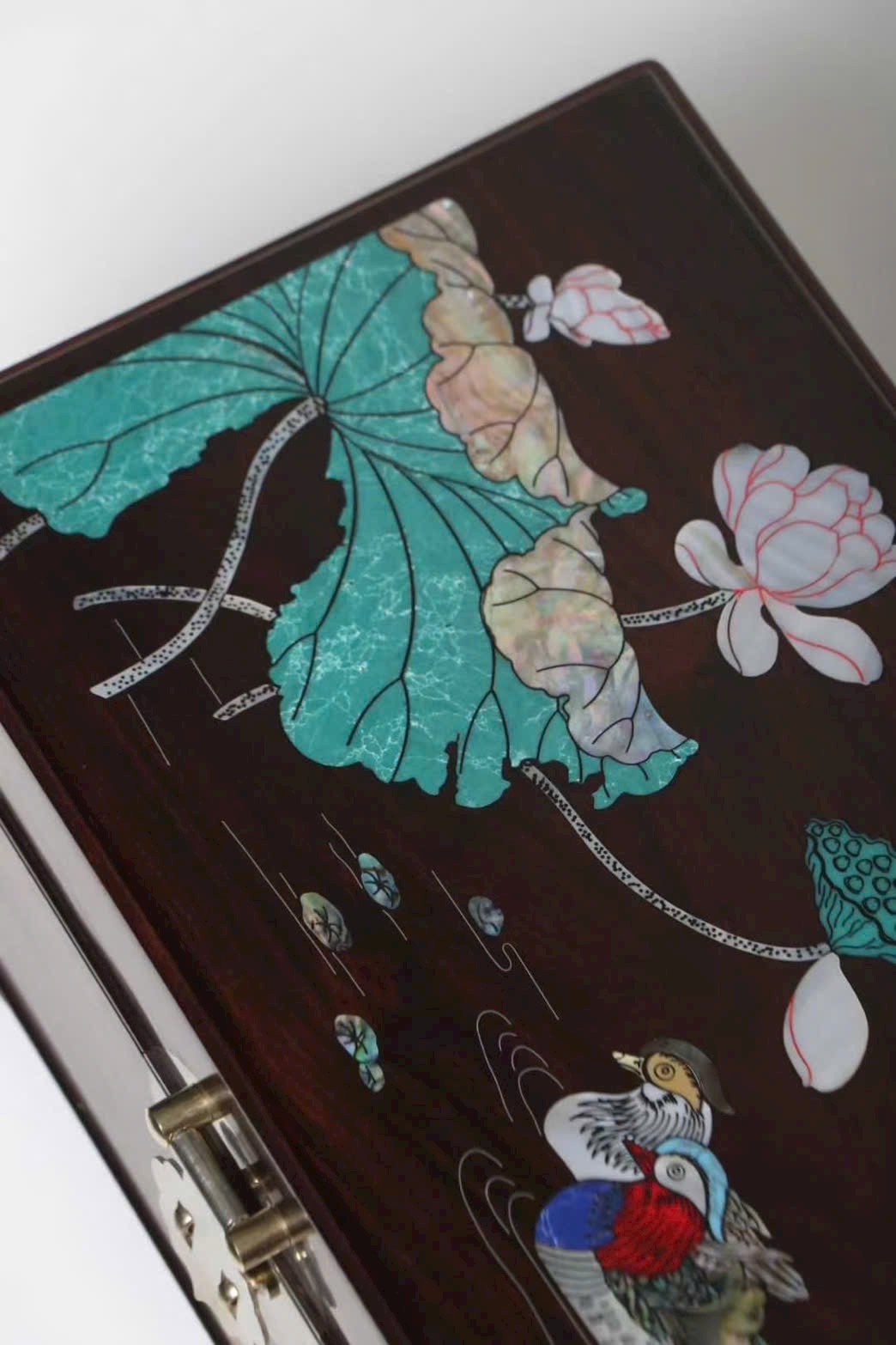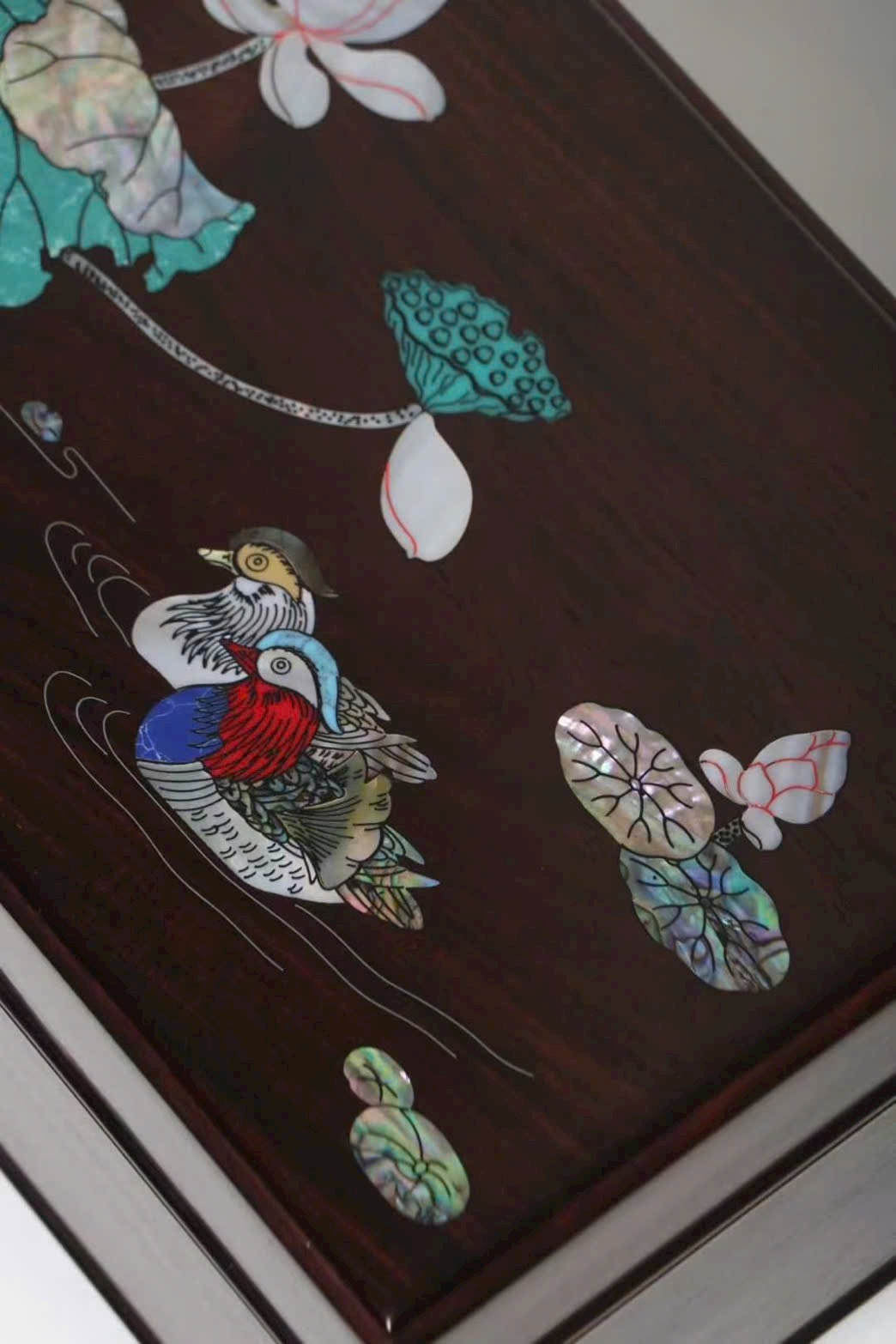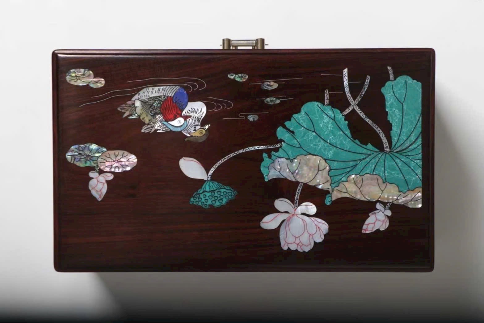 Chế tác từ gỗ trắc, ứng dụng nghề khảm trai truyền thống phi vật thể. Màu sắc tươi sáng, trong trẻo, vân gỗ mịn màng, dẻo dai, bố cục tinh tế hài hòa. Tác phẩm thấm đẫm phong vị thanh nhã, hợp với thú thưởng ngoạn của văn nhân tao sĩ.