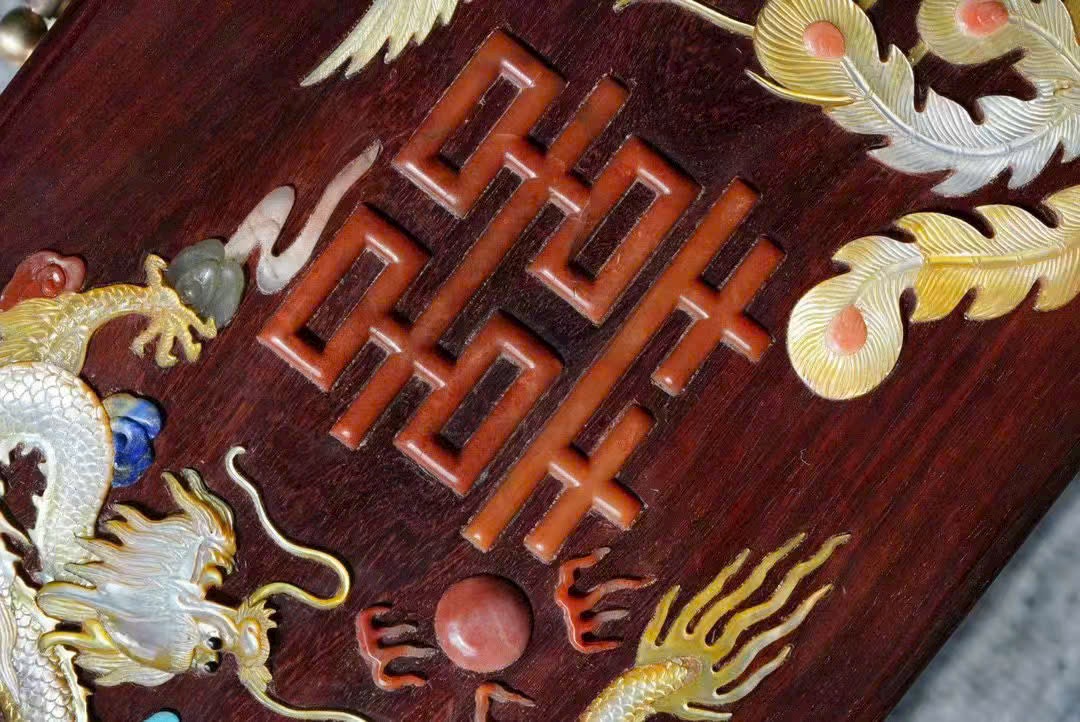 Chọn lọc gỗ Tử Đàn Ấn Độ nguyên tấm, chế tác từ một miếng gỗ duy nhất, thiết kế nhiều ngăn tiện dụng, tinh xảo và tao nhã; khảm bách bảo tạo thành hình long – phượng tung cánh, tượng trưng cho điềm lành, may mắn, tình cảm sâu sắc trọn đời.