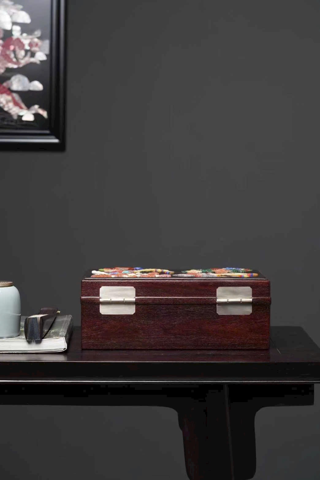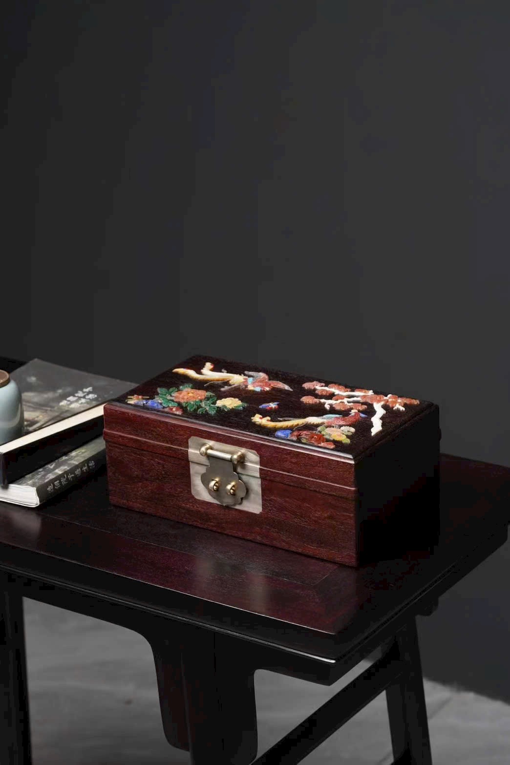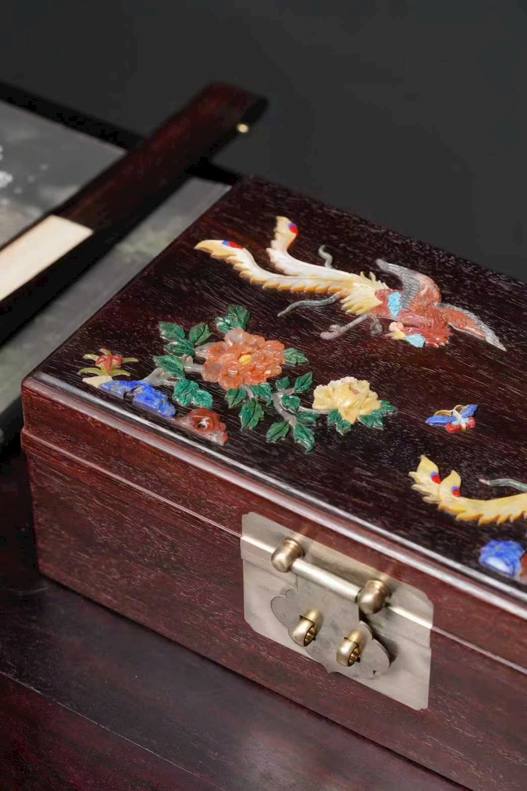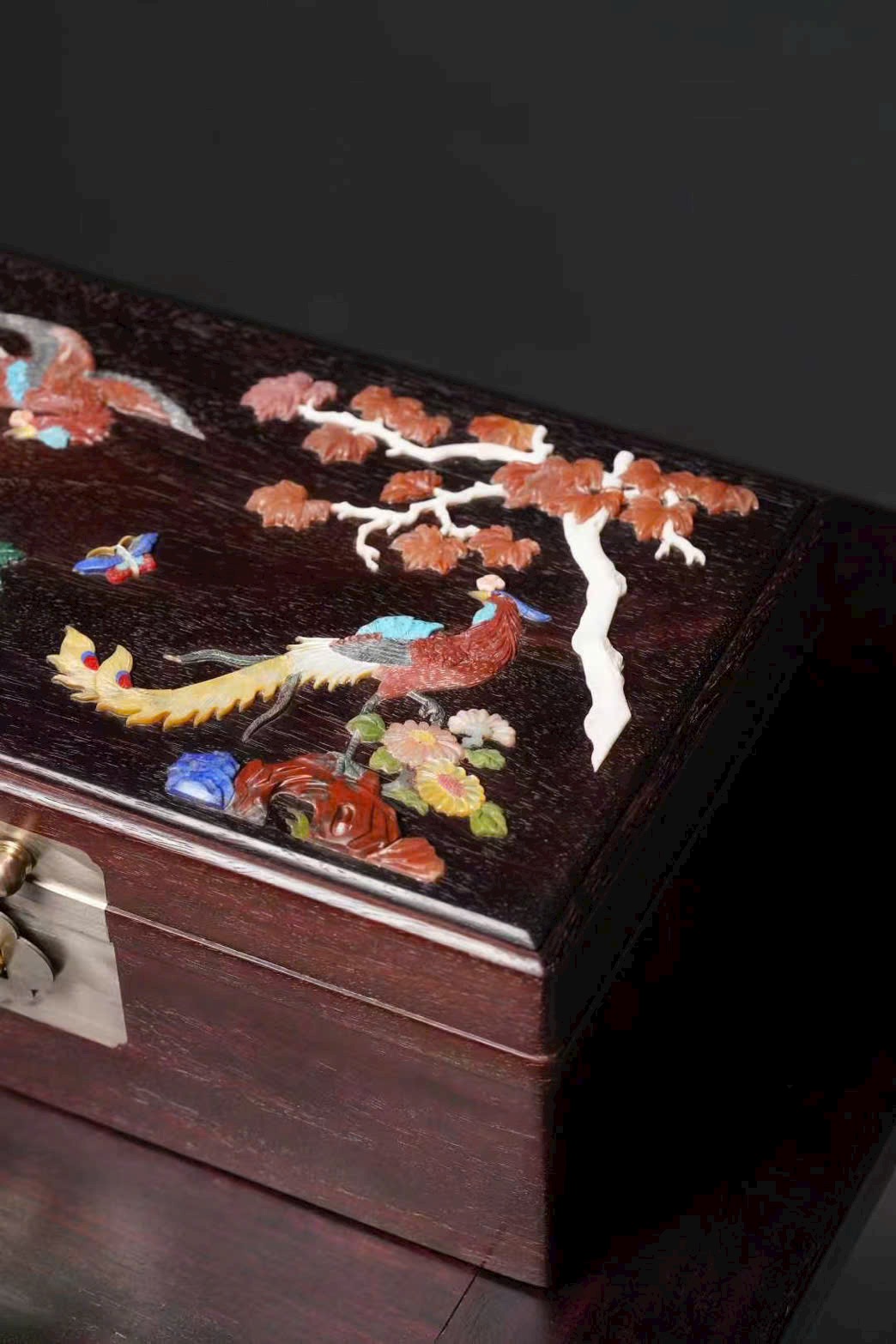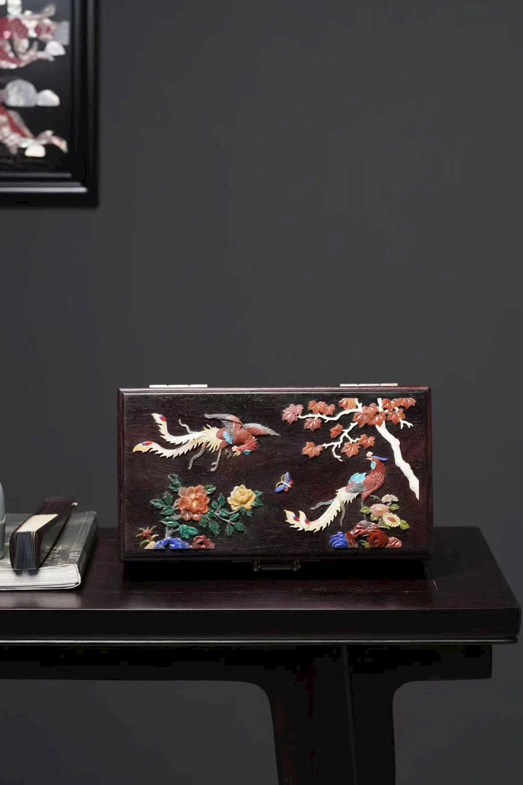 Chọn lọc gỗ Tử Đàn Ấn Độ nguyên tấm, chế tác hoàn toàn từ một miếng gỗ, thiết kế nhiều ngăn tiện lợi để đựng trang sức, tinh xảo và tao nhã; khảm bách bảo xa xỉ, tạc hình phượng hoàng tung cánh, mang ý nghĩa phú quý đầy đủ và viên mãn.