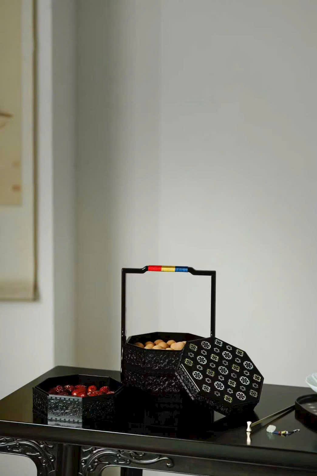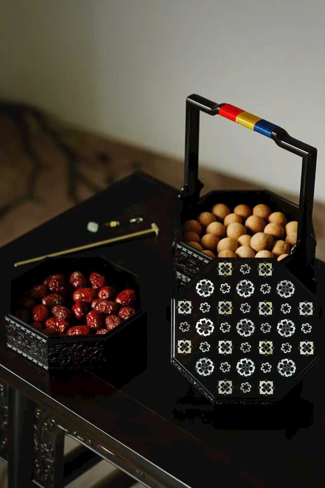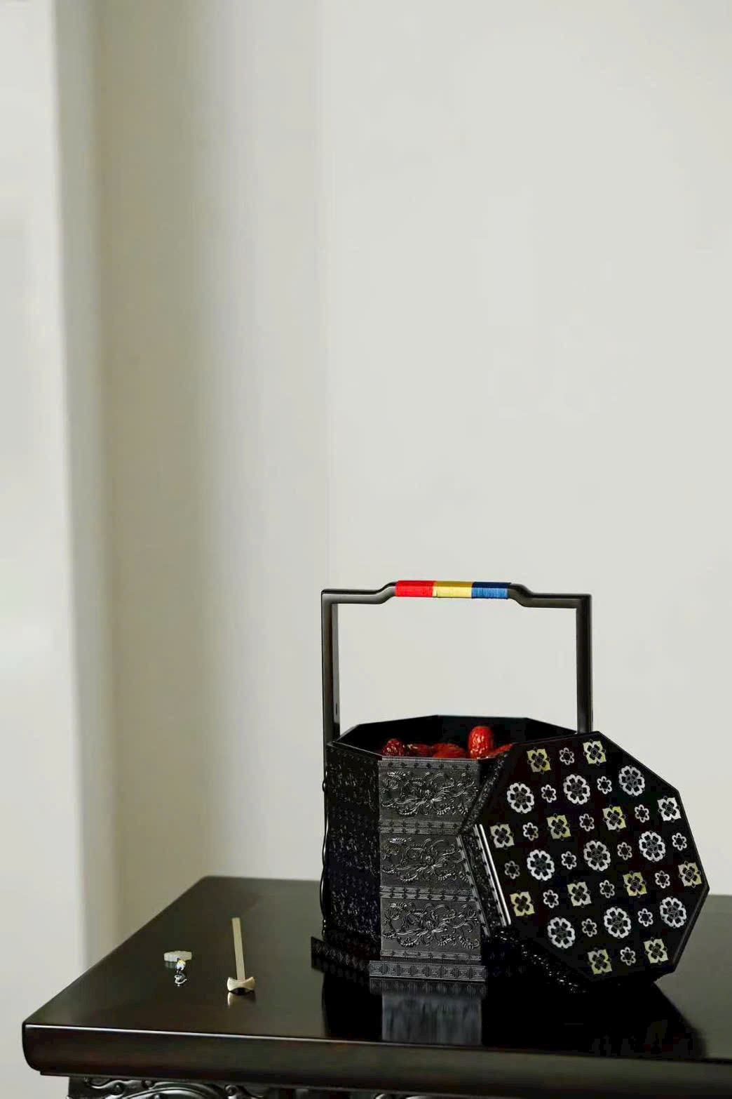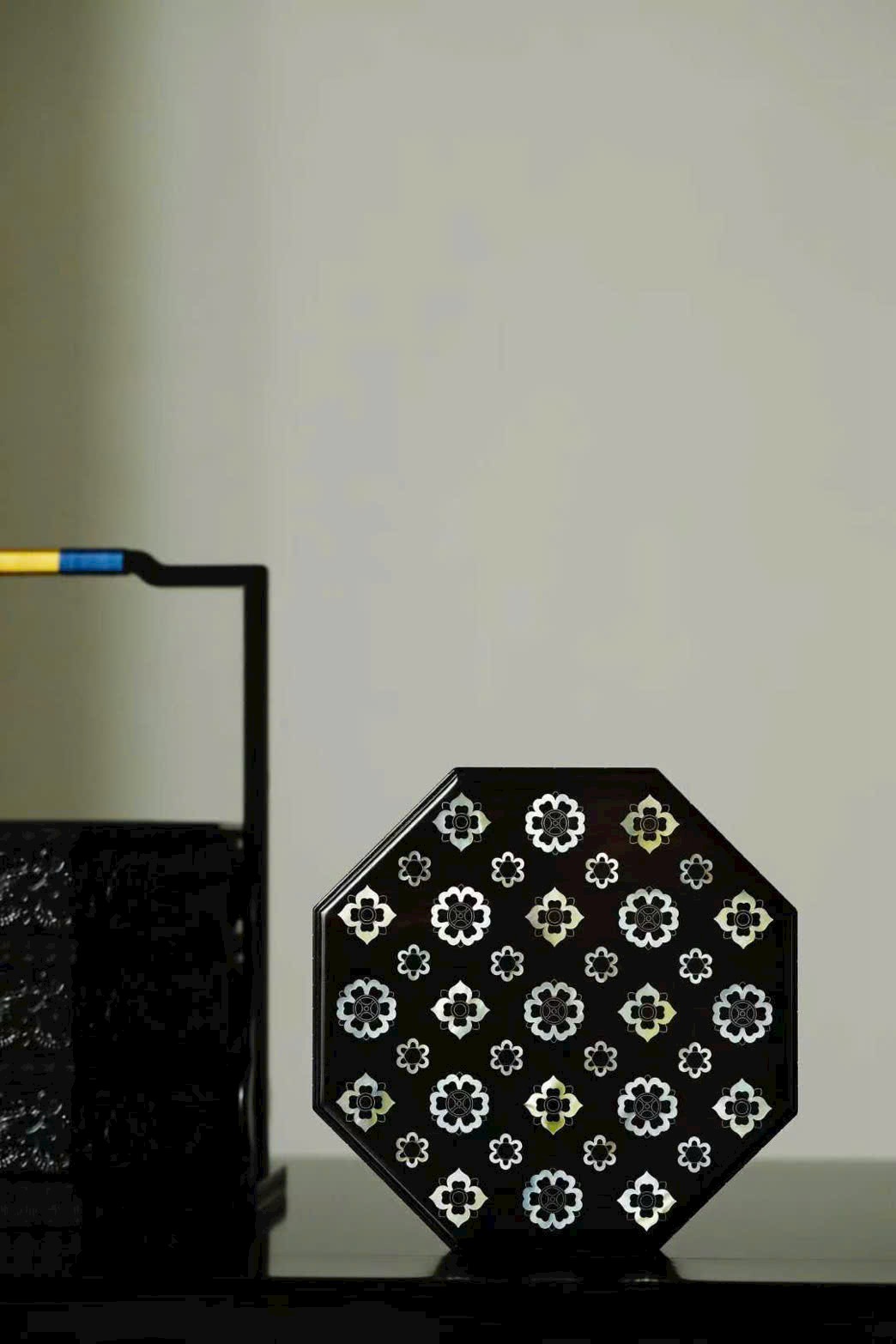 Chế tác từ tử quang đàn già, cấu trúc mộng – đấu chuẩn xác, dáng bát giác kinh điển. Toàn thân khắc đầy hoa văn Tây Vân (tây phiên liên) mềm mại. Nắp hộp ứng dụng kỹ nghệ khảm trai di sản phi vật thể, đường nét tinh tế, khảm họa tiết truyền thống hoa “bảo tướng”.