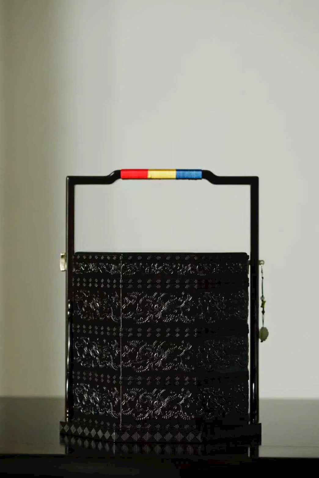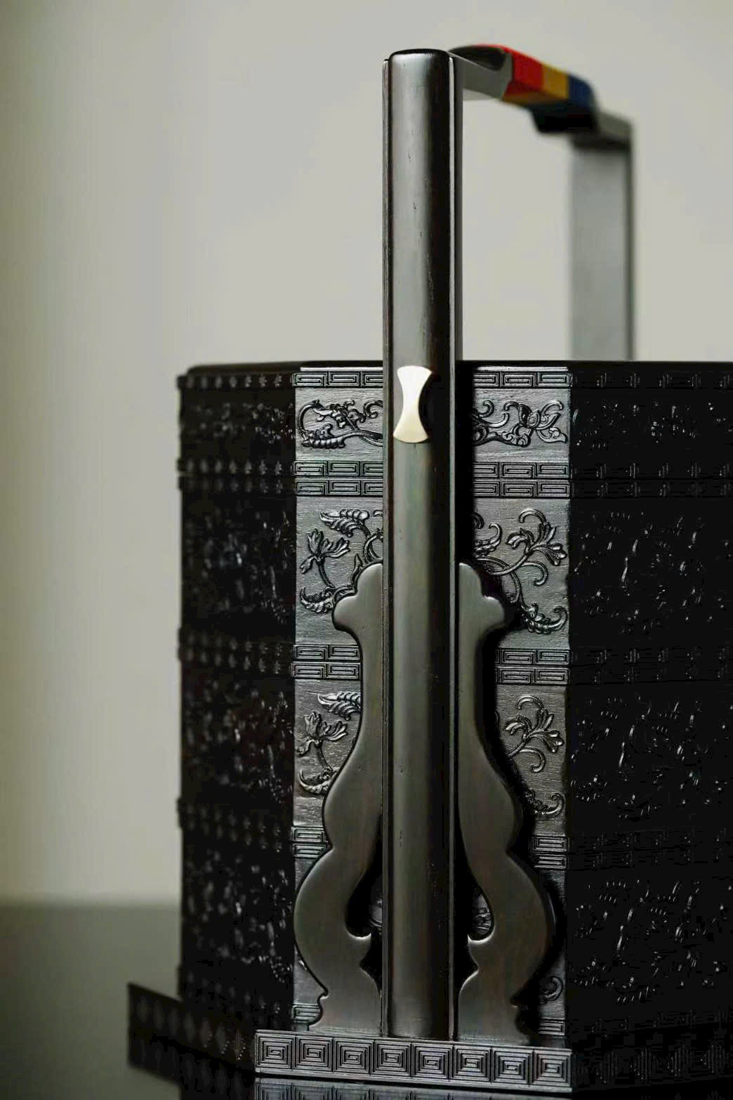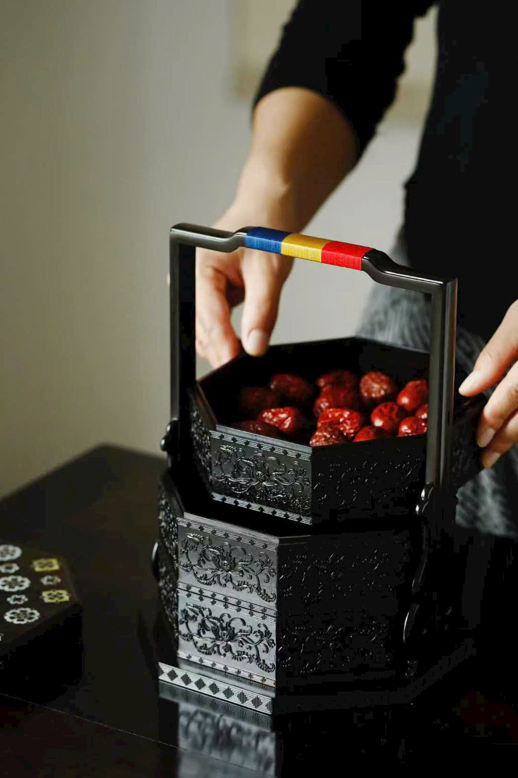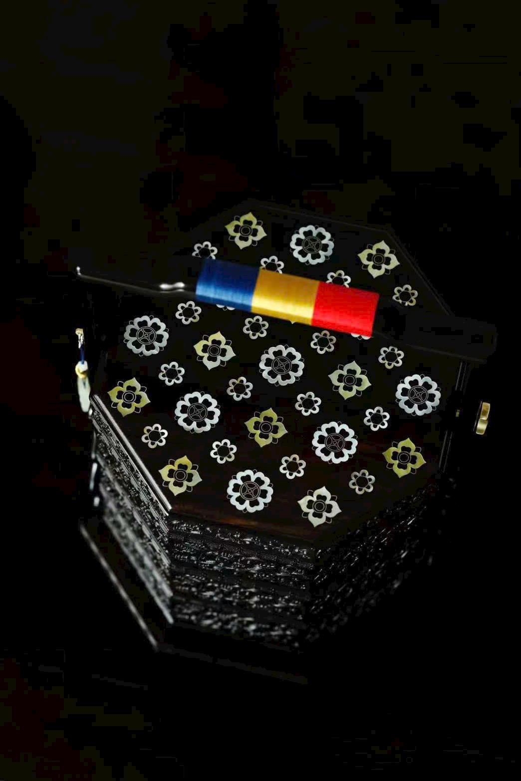 Chế tác từ tử quang đàn già, cấu trúc mộng – đấu chuẩn xác, dáng bát giác kinh điển. Toàn thân khắc đầy hoa văn Tây Vân (tây phiên liên) mềm mại. Nắp hộp ứng dụng kỹ nghệ khảm trai di sản phi vật thể, đường nét tinh tế, khảm họa tiết truyền thống hoa “bảo tướng”.
