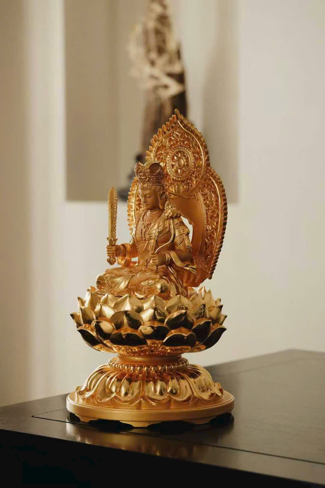 Tượng được tạo tác tinh xảo, Bồ Tát đội ngũ Phật quan. Tay phải cong nhẹ cầm kiếm trí tuệ, tay trái đặt nơi eo, nắm quyền nâng hoa sen, trên sen có như ý bảo châu. Dung mạo uy nghiêm, trang nghiêm tĩnh tại; toàn thân trang sức chuỗi anh lạc châu báu rực rỡ. Ngài kiết già phu tọa trên tòa sen báu, khí tượng thù thắng vô cùng.