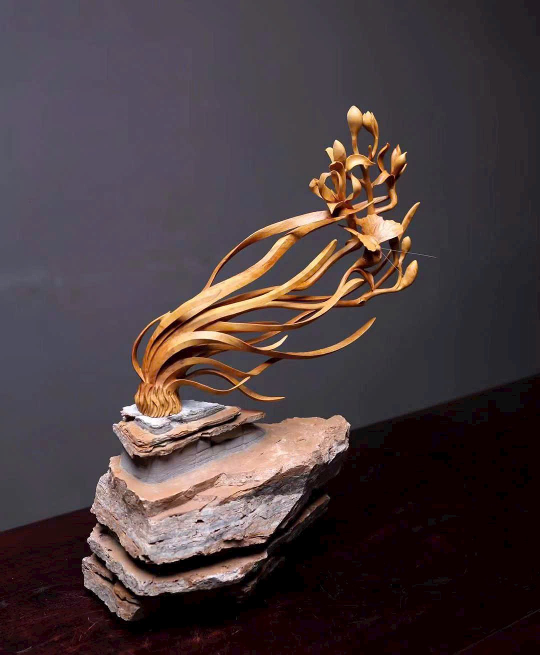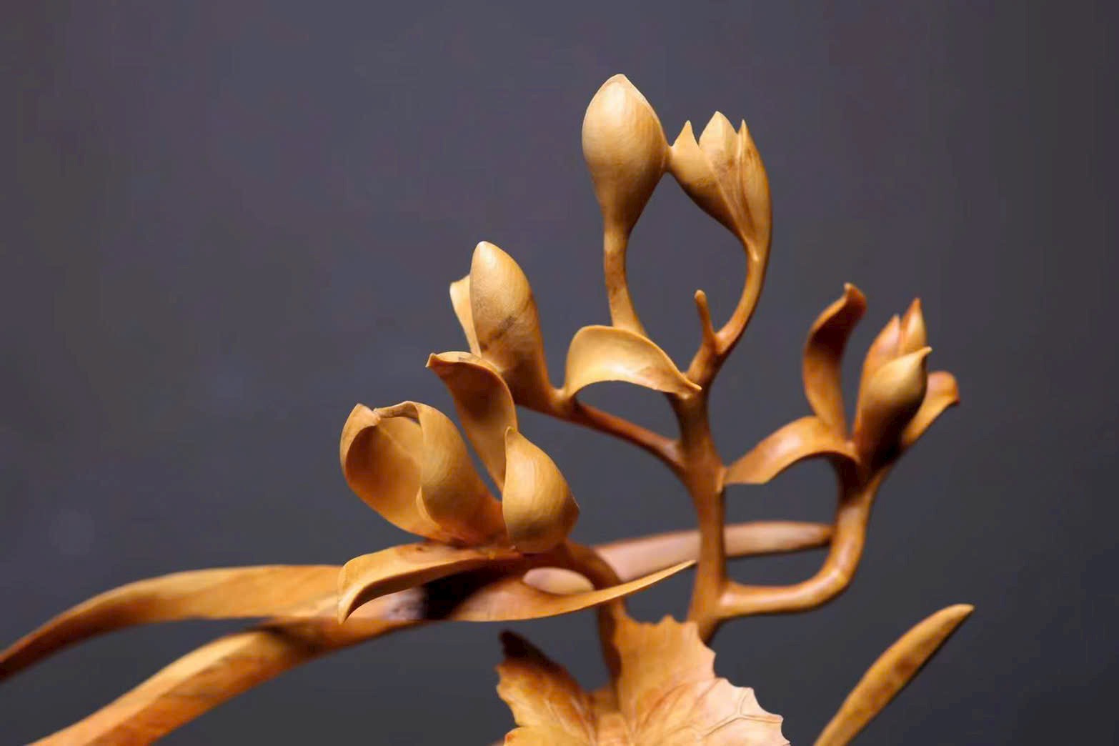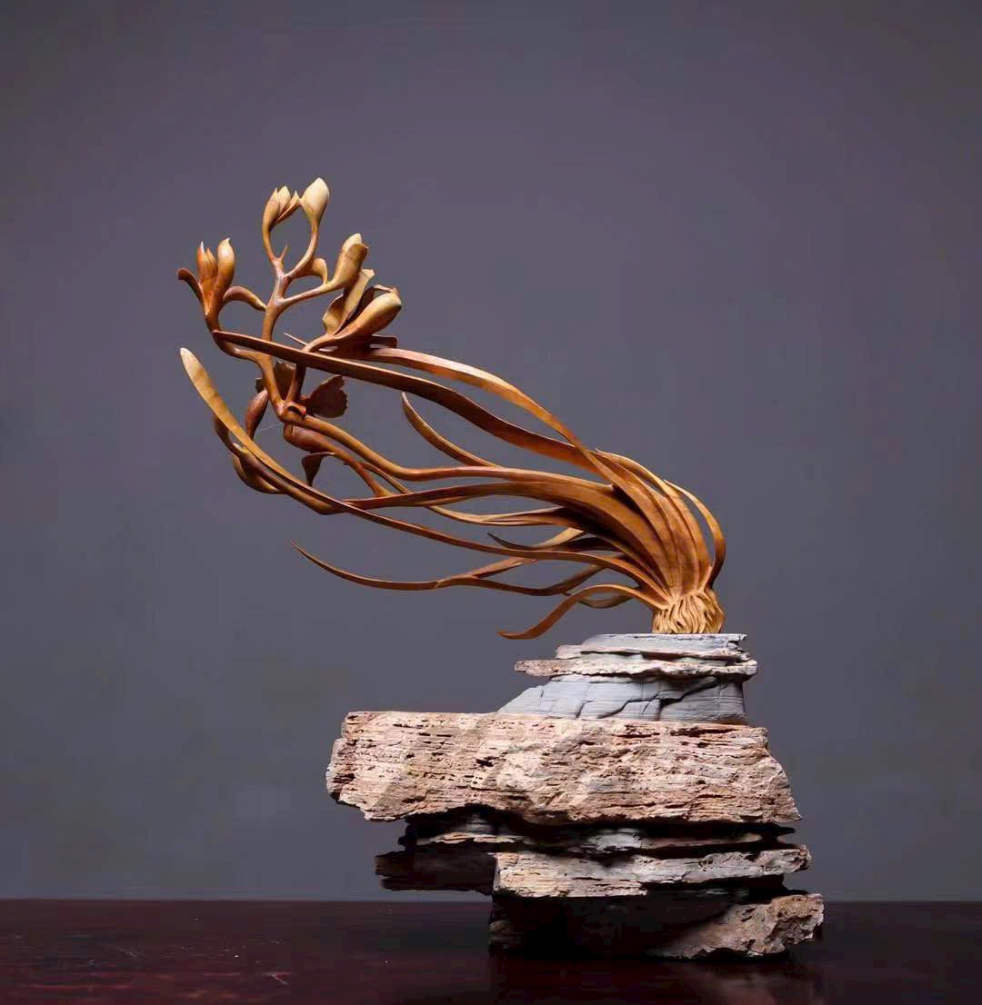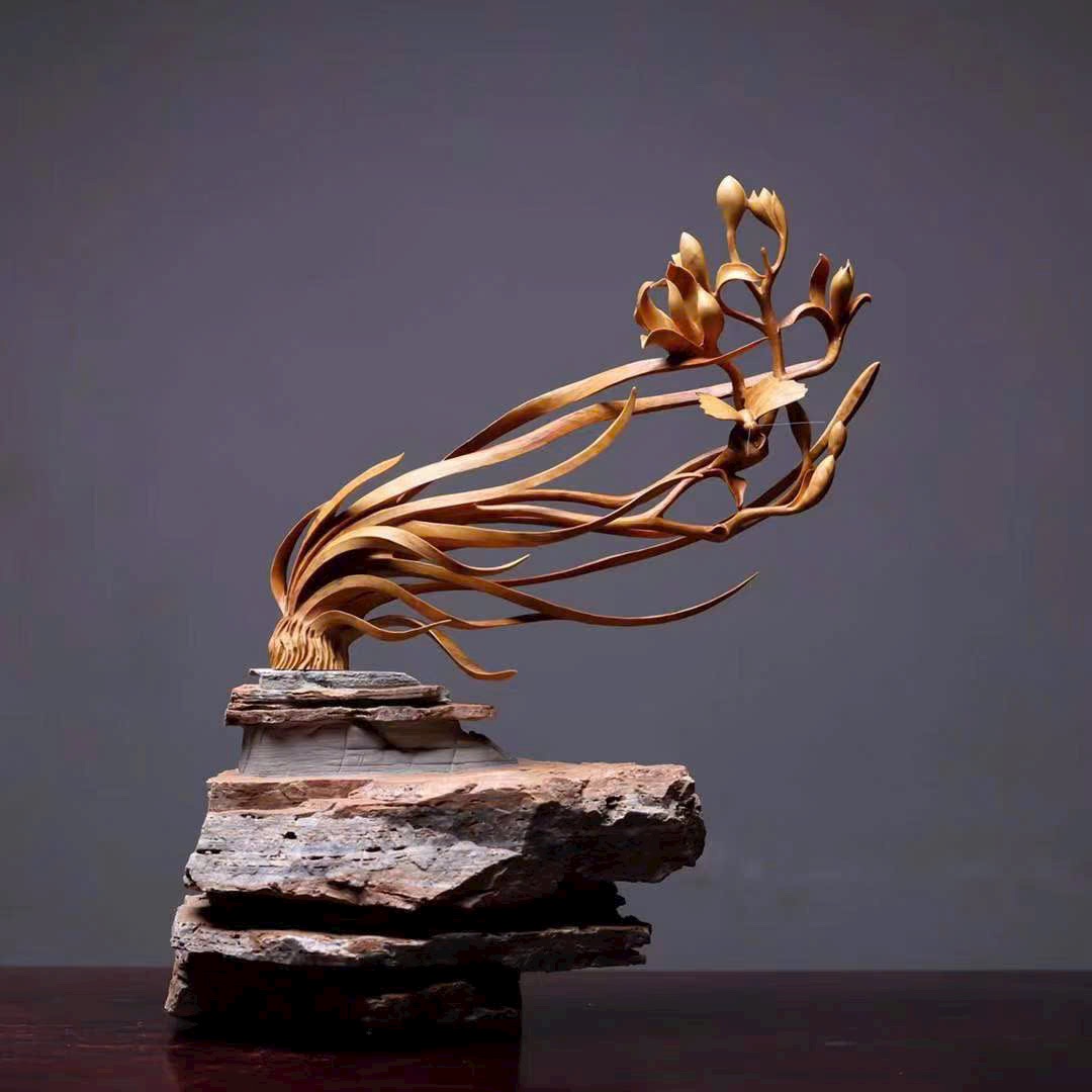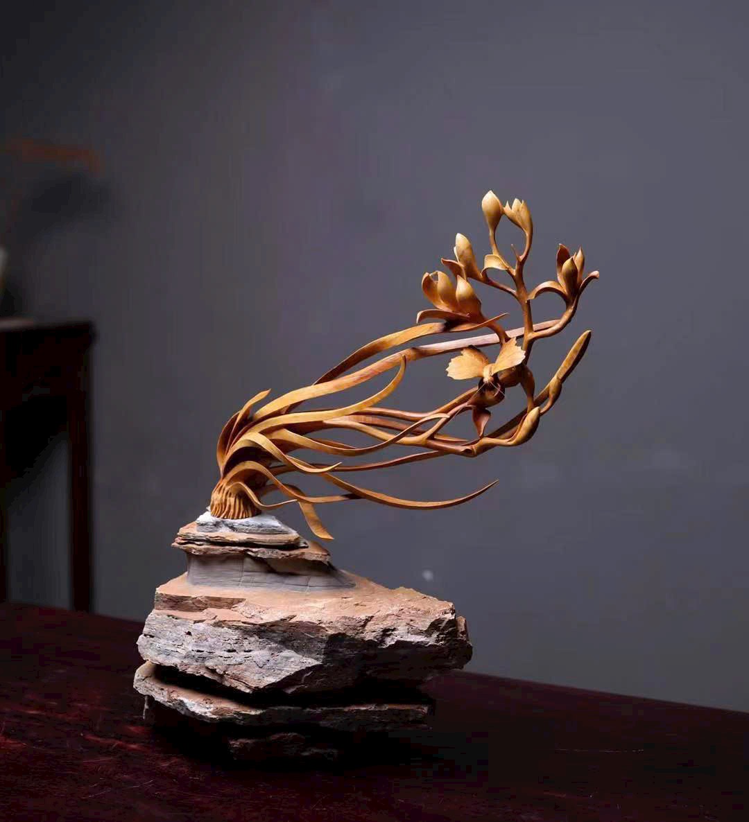 Lá dài mảnh, đường nét trôi chảy uyển chuyển, tựa vũ nhẹ theo gió. Độ cong của cánh hoa, cùng phần nhụy được chạm khắc sinh động như thật, phô bày trọn vẻ thanh nhã. Phần đế phối kỳ thạch cổ phác, càng làm nổi bật khí chất thanh khiết cao nhã của lan, như gom trọn một nét lan vận u tĩnh nơi thâm cốc, ngưng lại ngay trước mắt.