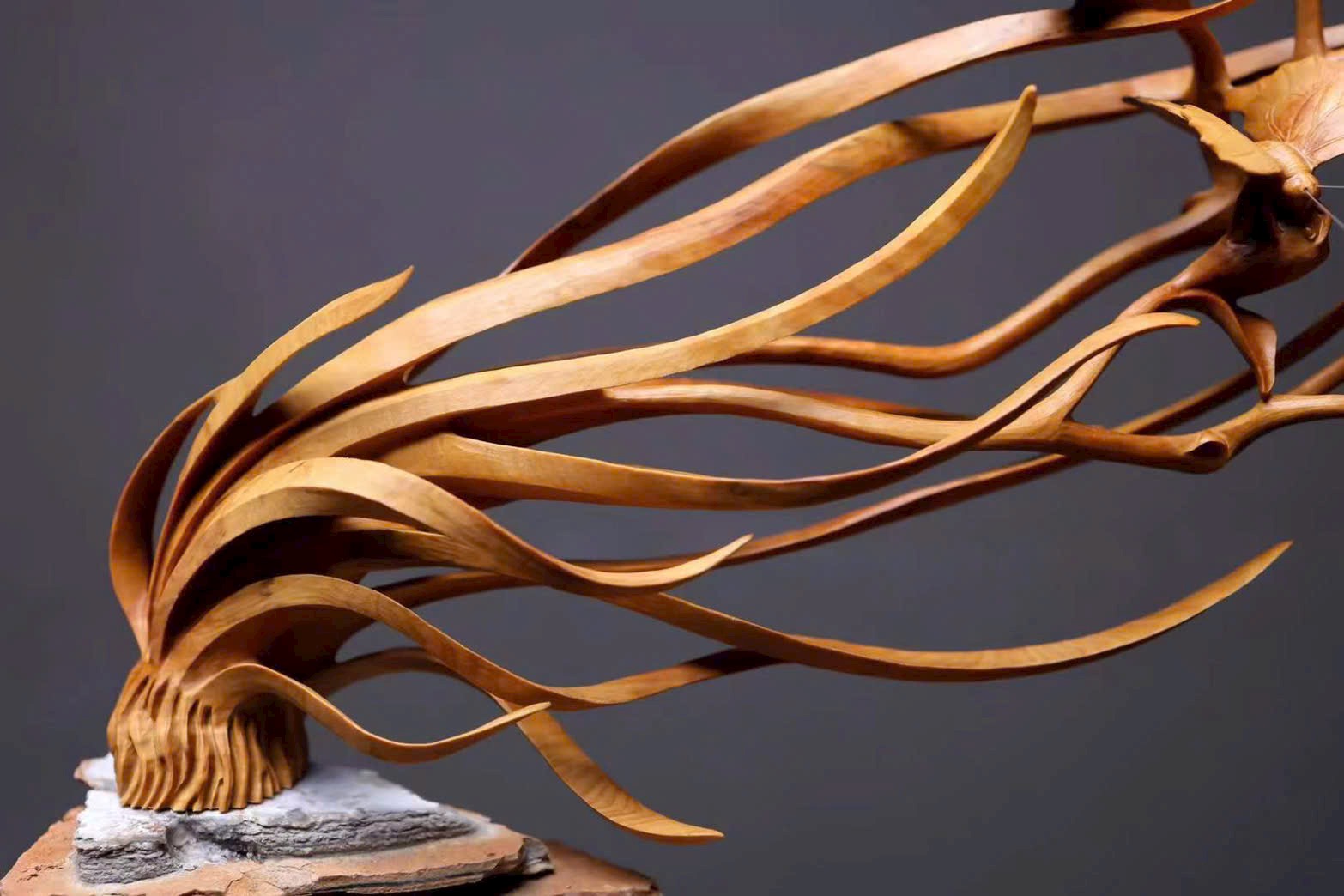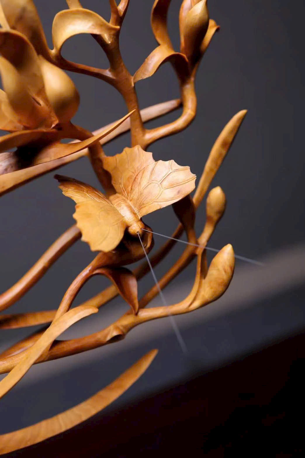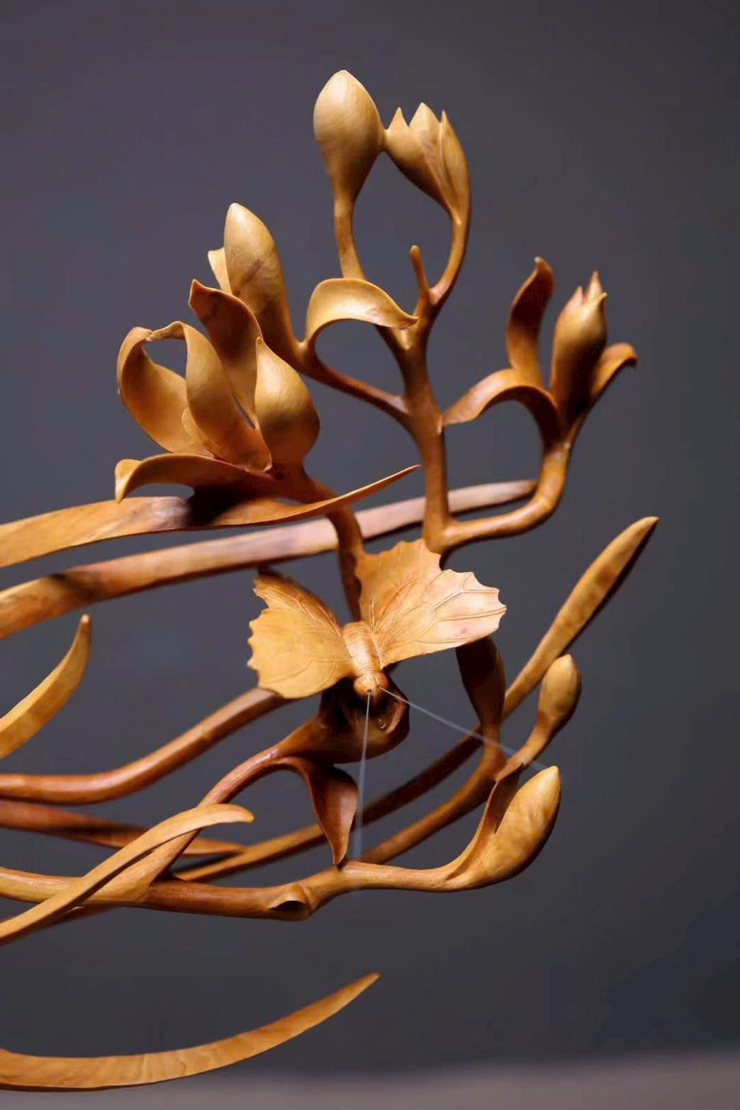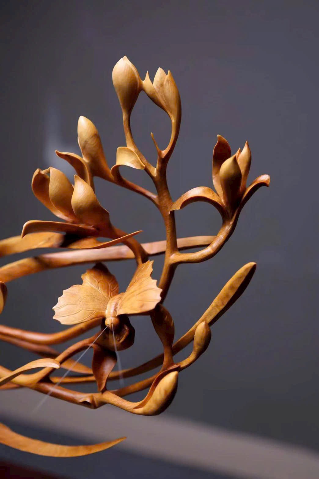 Lá dài mảnh, đường nét trôi chảy uyển chuyển, tựa vũ nhẹ theo gió. Độ cong của cánh hoa, cùng phần nhụy được chạm khắc sinh động như thật, phô bày trọn vẻ thanh nhã. Phần đế phối kỳ thạch cổ phác, càng làm nổi bật khí chất thanh khiết cao nhã của lan, như gom trọn một nét lan vận u tĩnh nơi thâm cốc, ngưng lại ngay trước mắt.