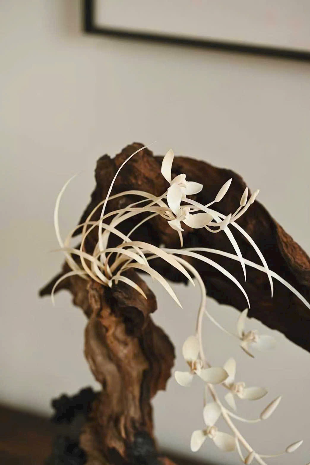 Lan mamut được khảm tinh xảo, cánh lá thanh tú, bố cục thoáng đạt – linh diệu, hài hòa với thế đá, tôn lên vẻ tao nhã, phi phàm, đậm phong vị văn nhân.