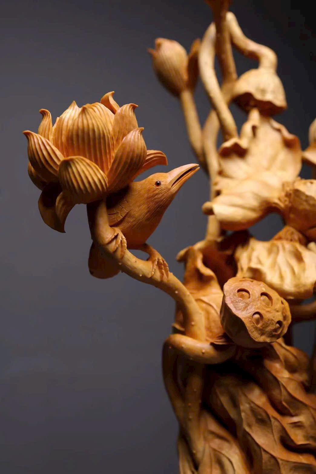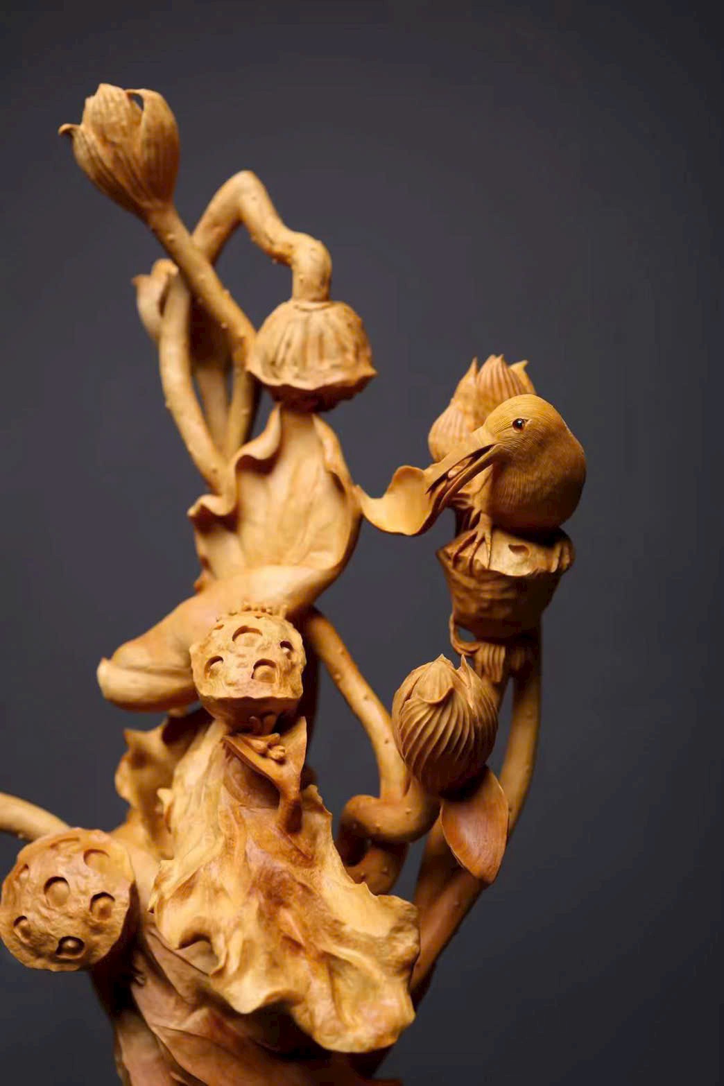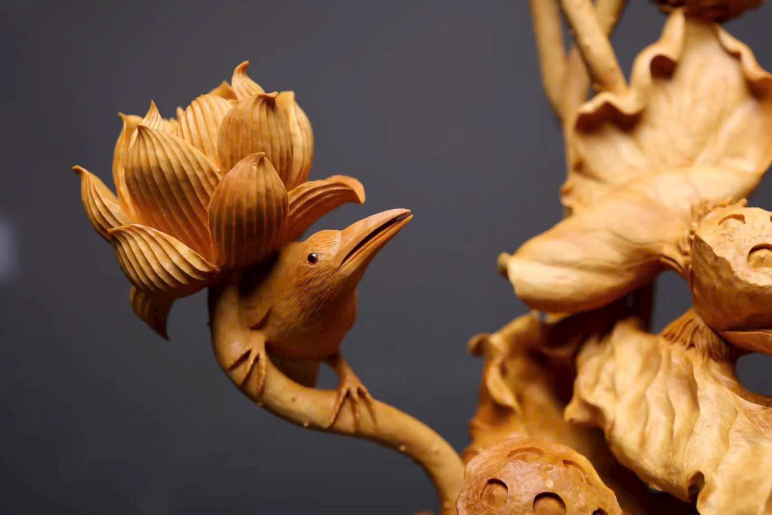 Bằng kỹ pháp chạm khắc tinh tế đến từng chi tiết, khắc họa trọn vẹn vẻ thanh nhã của hoa sen, sự no tròn của đài sen và dáng linh hoạt của chim bói cá. Lá sen uốn lượn như sóng biếc khẽ dâng, hoa sen hoặc nở rộ hoặc e ấp, gom trọn vẻ đẹp tự nhiên vào trong thớ gỗ, phô bày tay nghề tinh xảo cùng linh vận của tự nhiên.