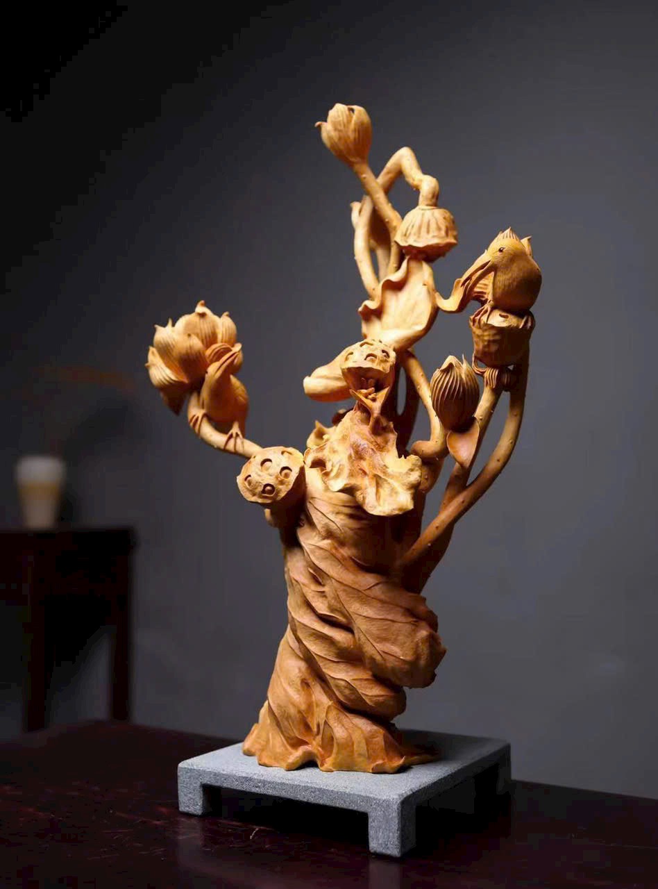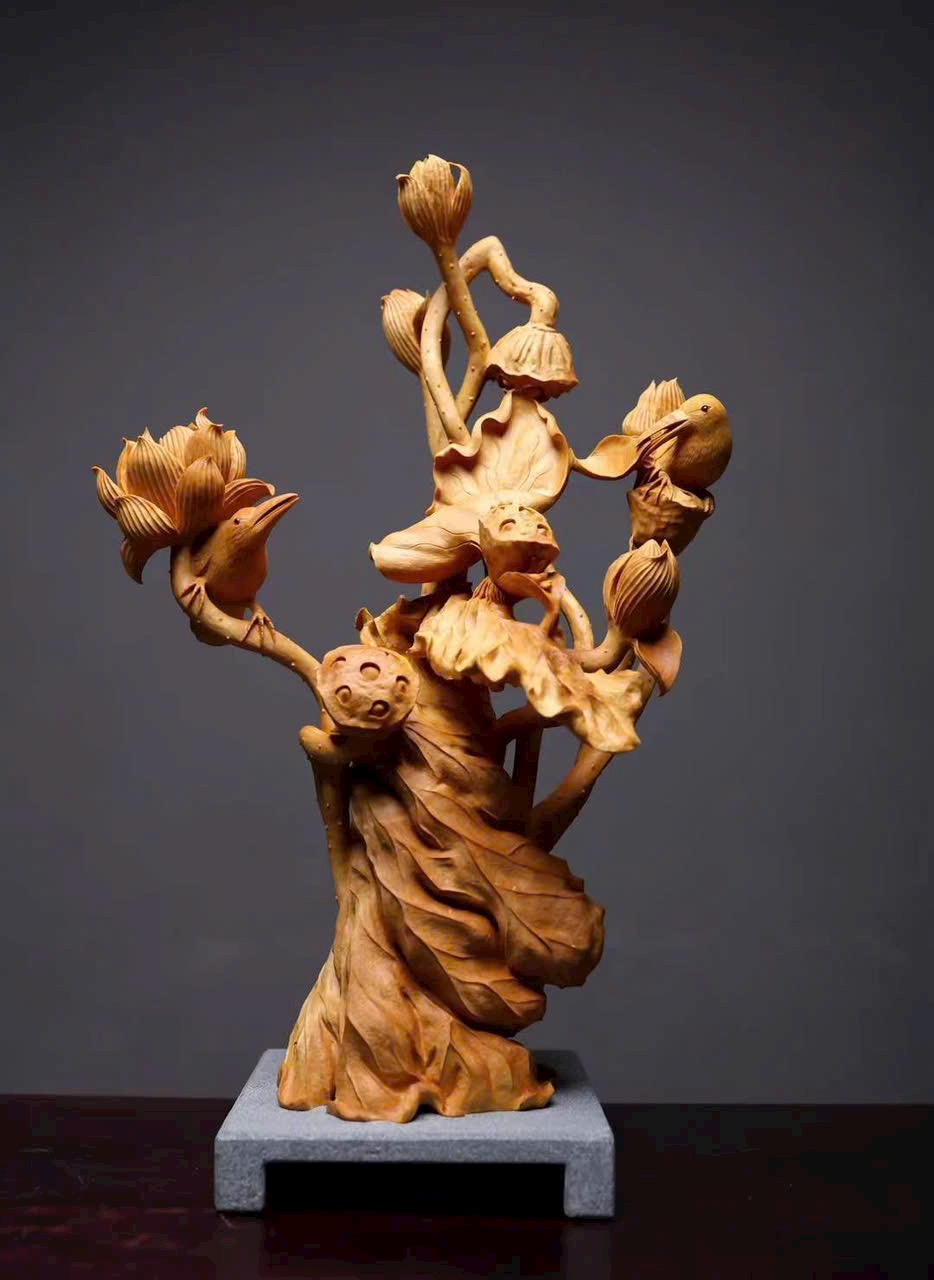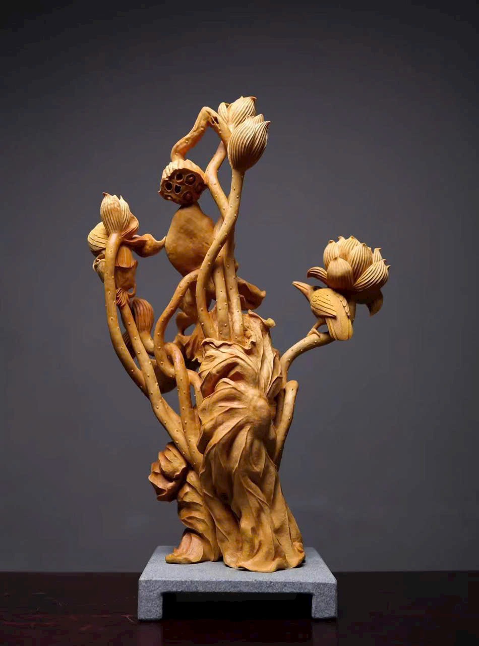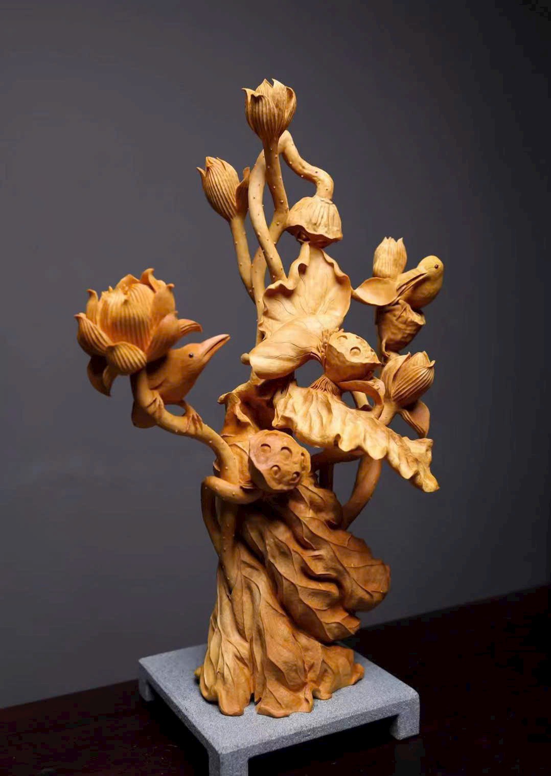 Bằng kỹ pháp chạm khắc tinh tế đến từng chi tiết, khắc họa trọn vẹn vẻ thanh nhã của hoa sen, sự no tròn của đài sen và dáng linh hoạt của chim bói cá. Lá sen uốn lượn như sóng biếc khẽ dâng, hoa sen hoặc nở rộ hoặc e ấp, gom trọn vẻ đẹp tự nhiên vào trong thớ gỗ, phô bày tay nghề tinh xảo cùng linh vận của tự nhiên.