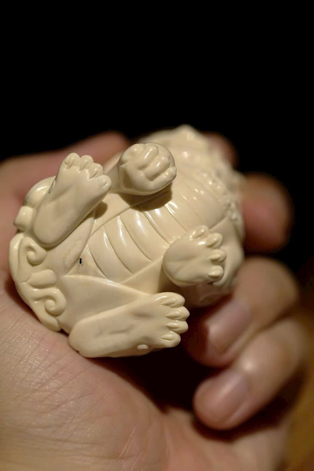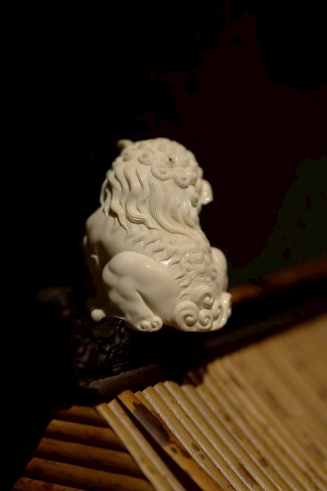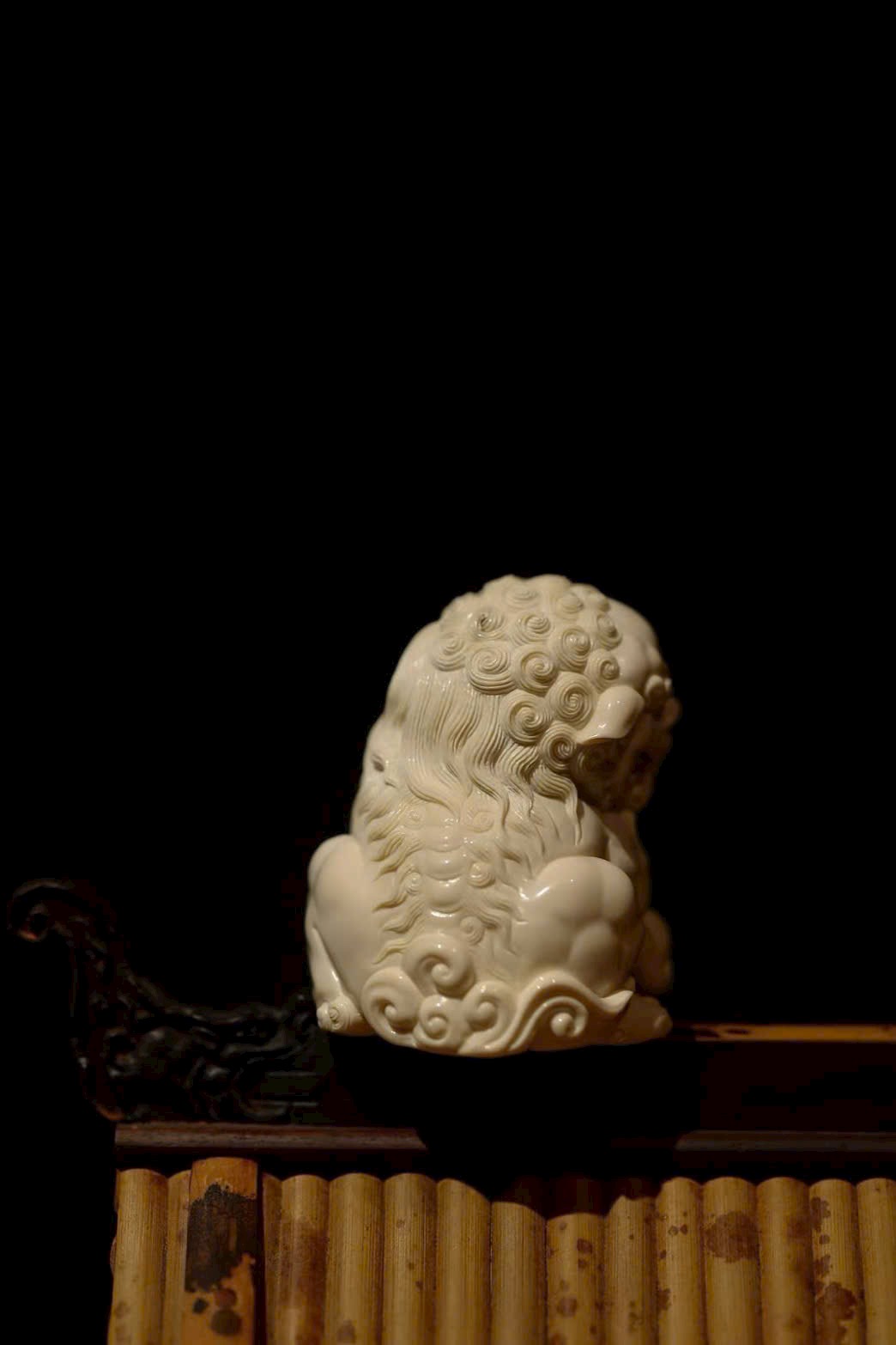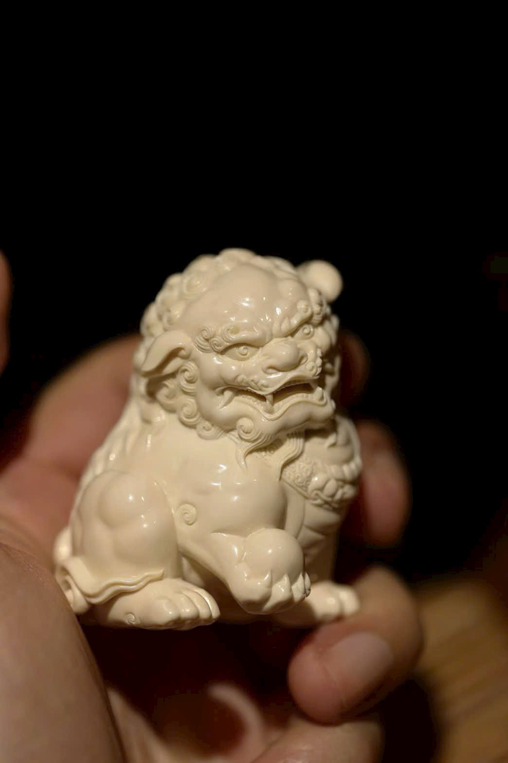 Tác phẩm được chạm khắc thủ công, tạo hình sư tử hoan hỷ đạp trên tấm thêu, bộ lông phất nhẹ theo gió, thần thái vui tươi linh hoạt. Toàn khối ngà lên vân đầy đặn, sắc chất ấm nhuận, thích hợp cho cả việc cầm chơi lẫn đặt trang trí.