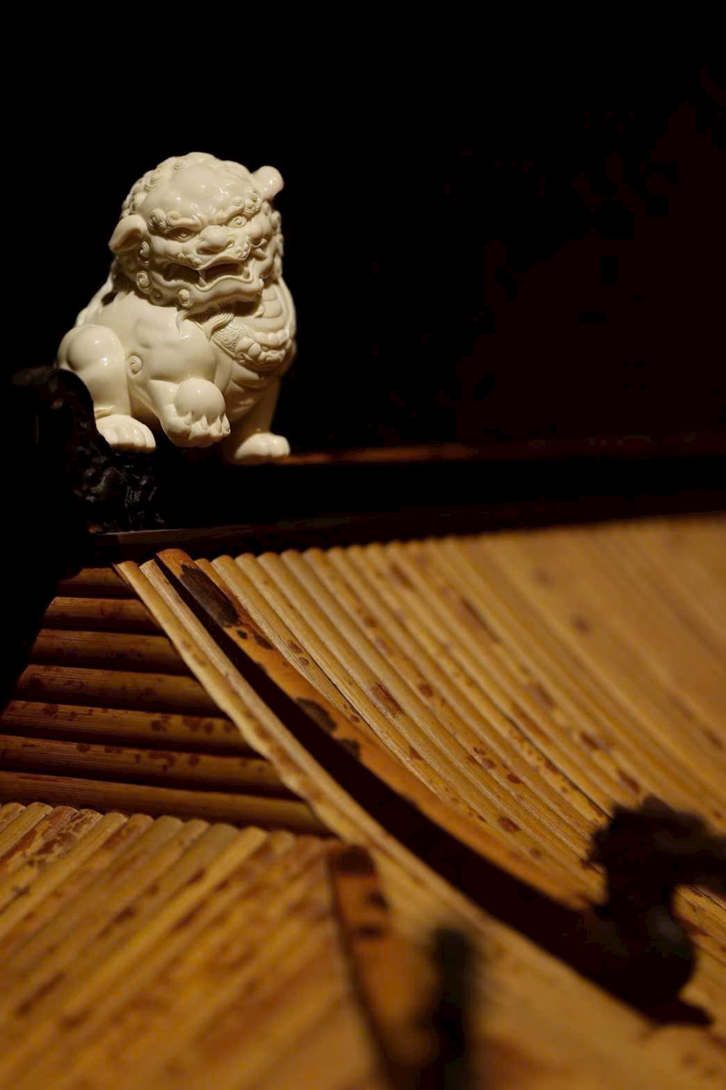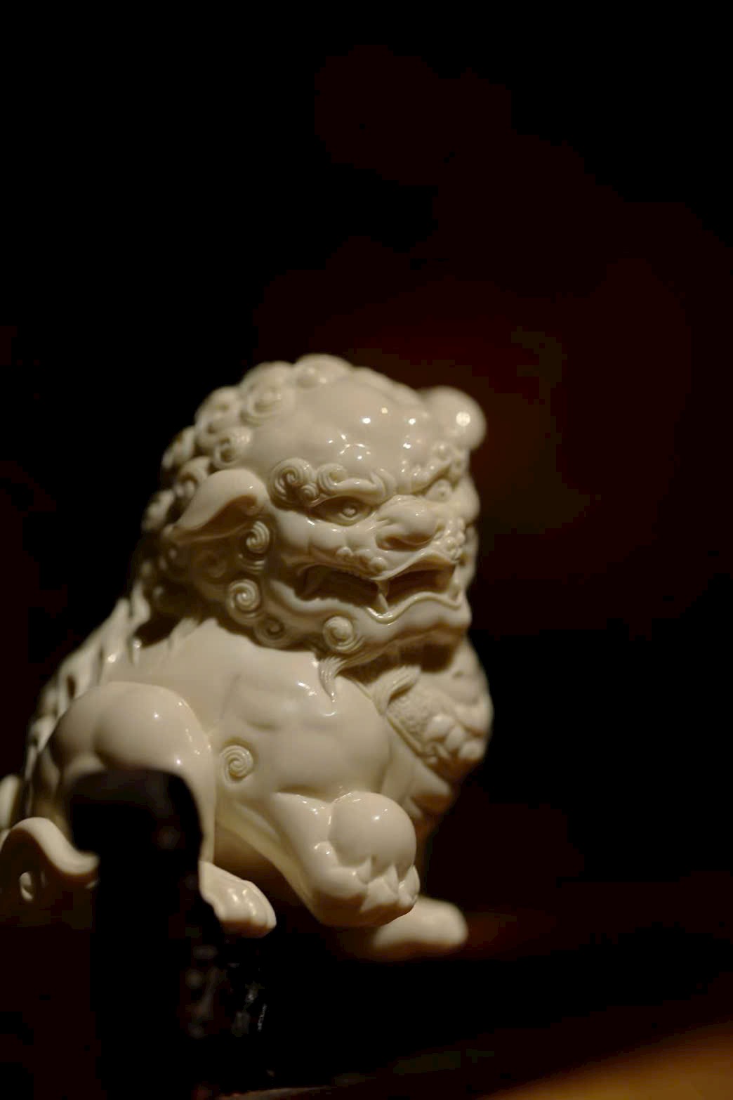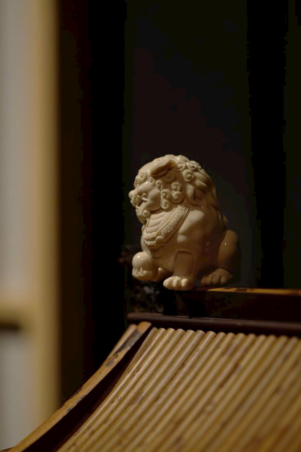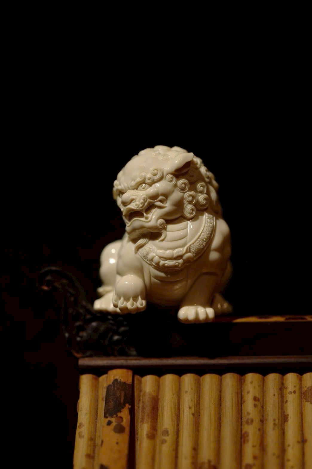 Tác phẩm được chạm khắc thủ công, tạo hình sư tử hoan hỷ đạp trên tấm thêu, bộ lông phất nhẹ theo gió, thần thái vui tươi linh hoạt. Toàn khối ngà lên vân đầy đặn, sắc chất ấm nhuận, thích hợp cho cả việc cầm chơi lẫn đặt trang trí.