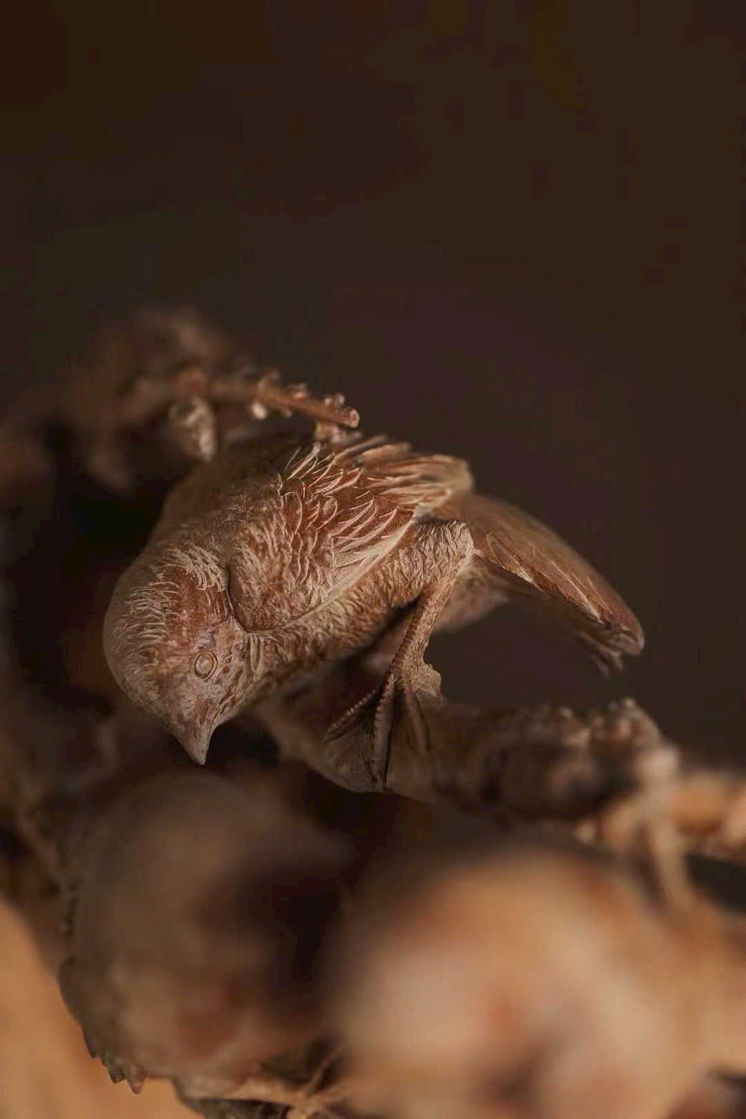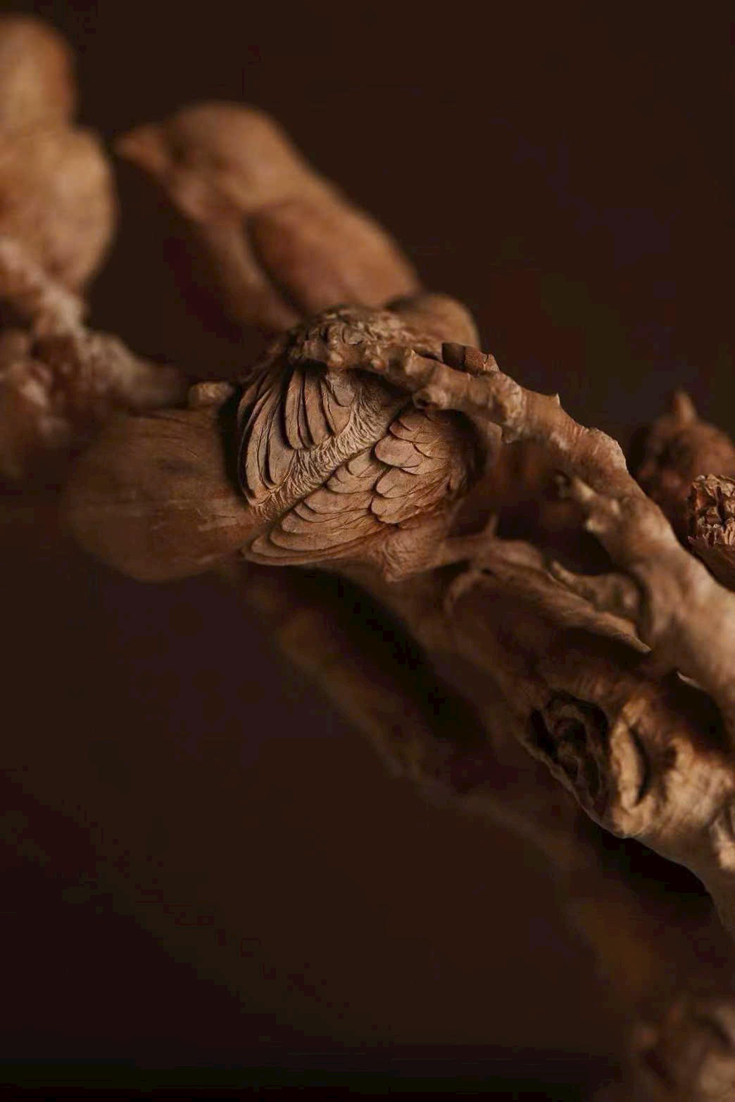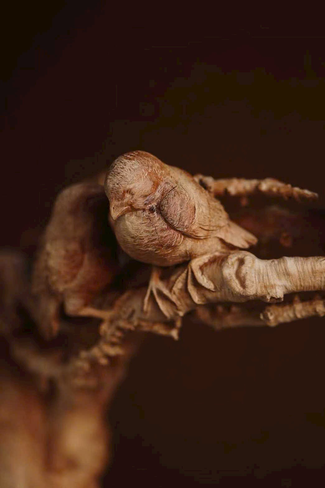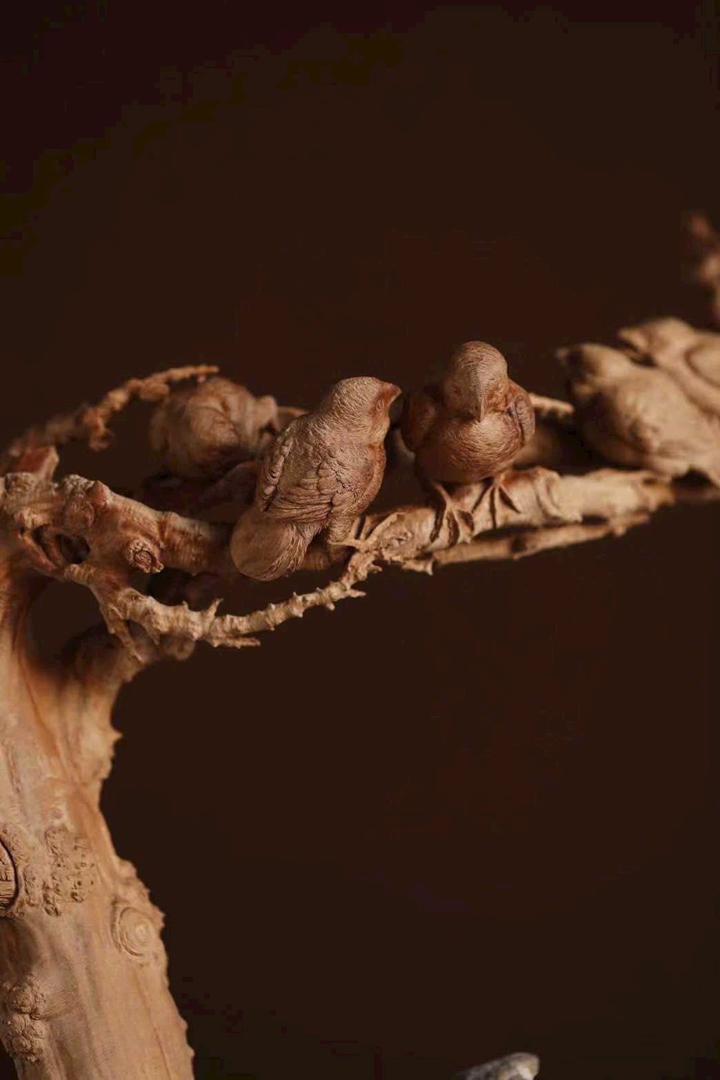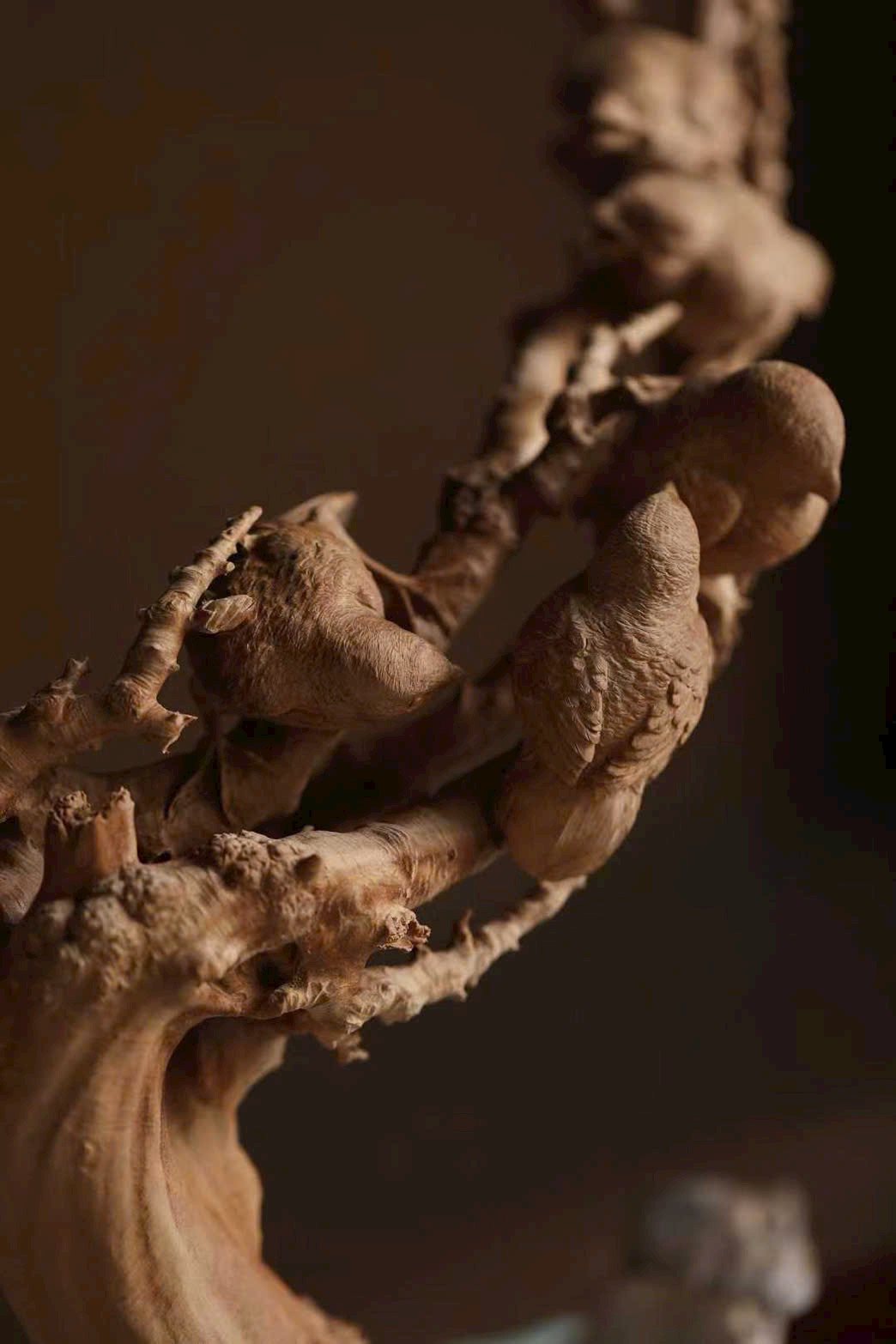 Tác phẩm được chế tác nguyên khối gỗ liền, bố cục đầy đặn, đường nét phong phú và sinh động.