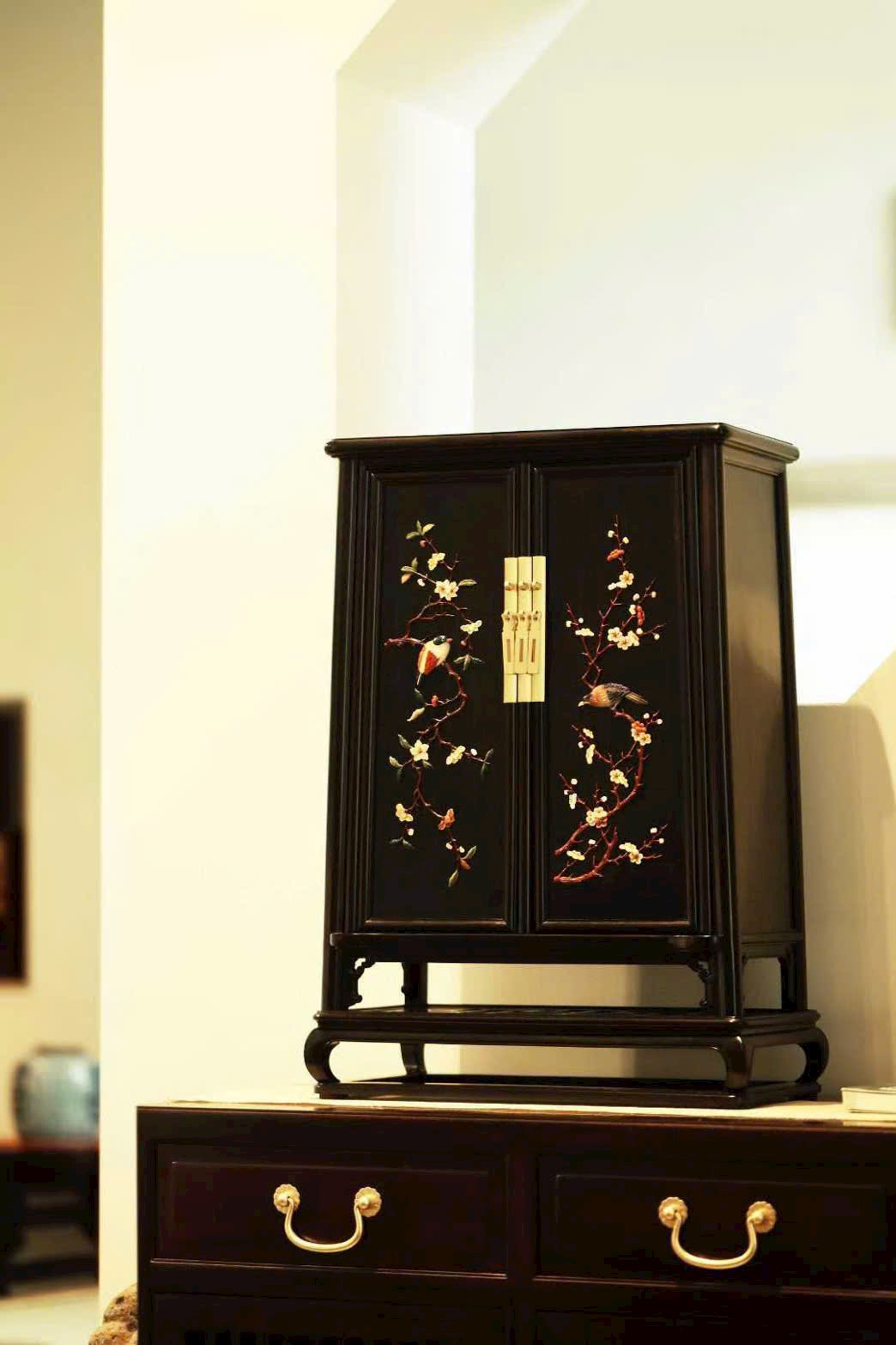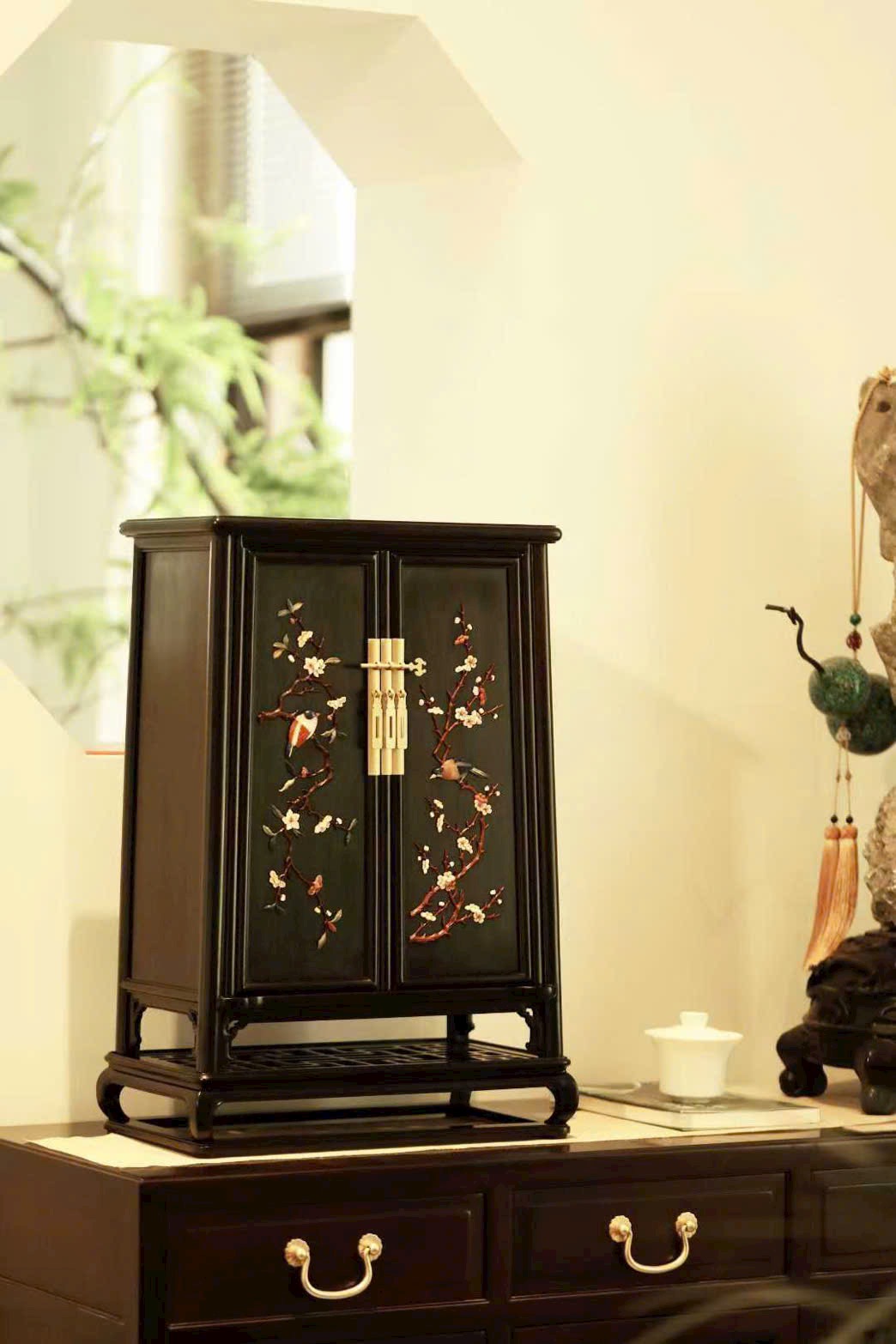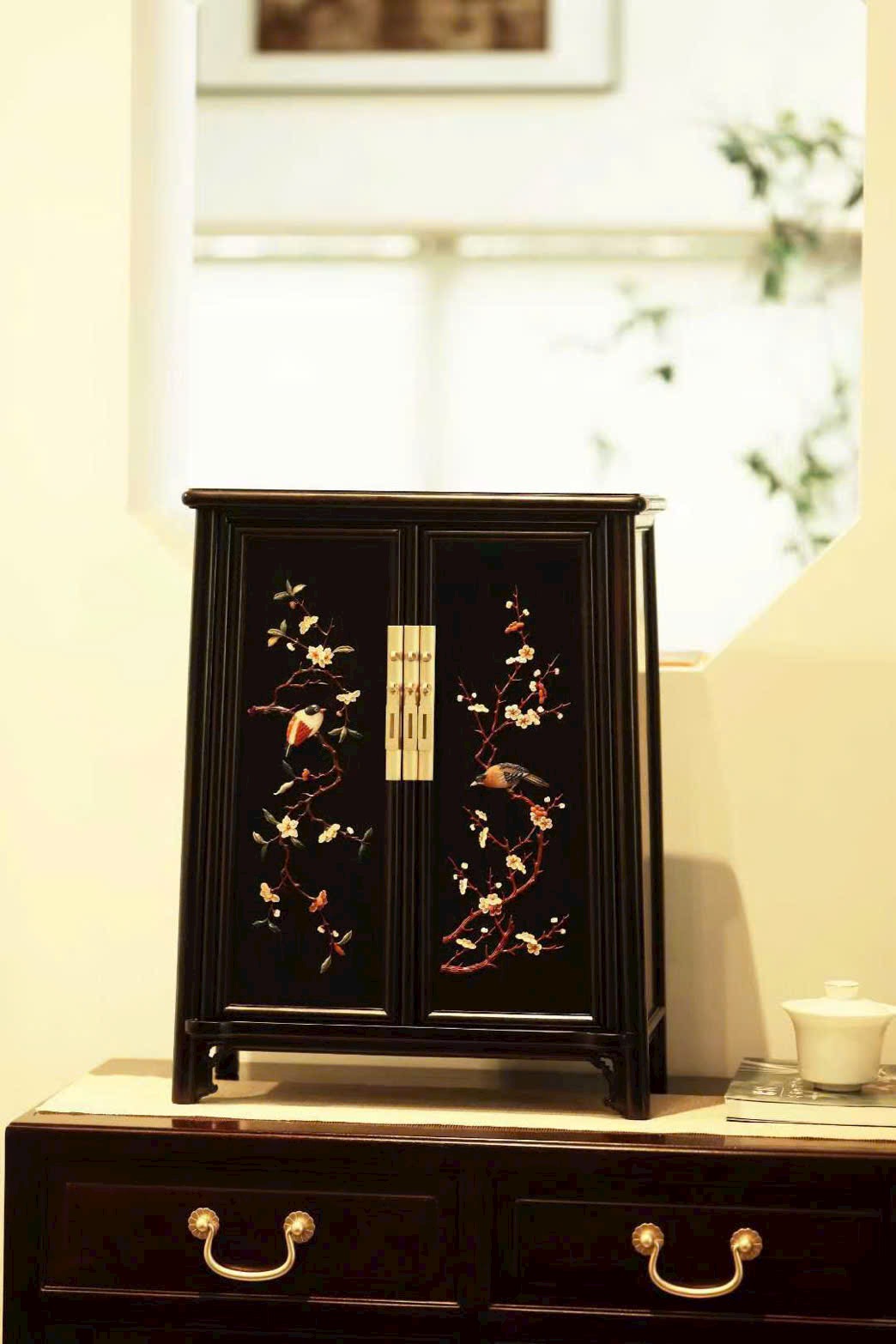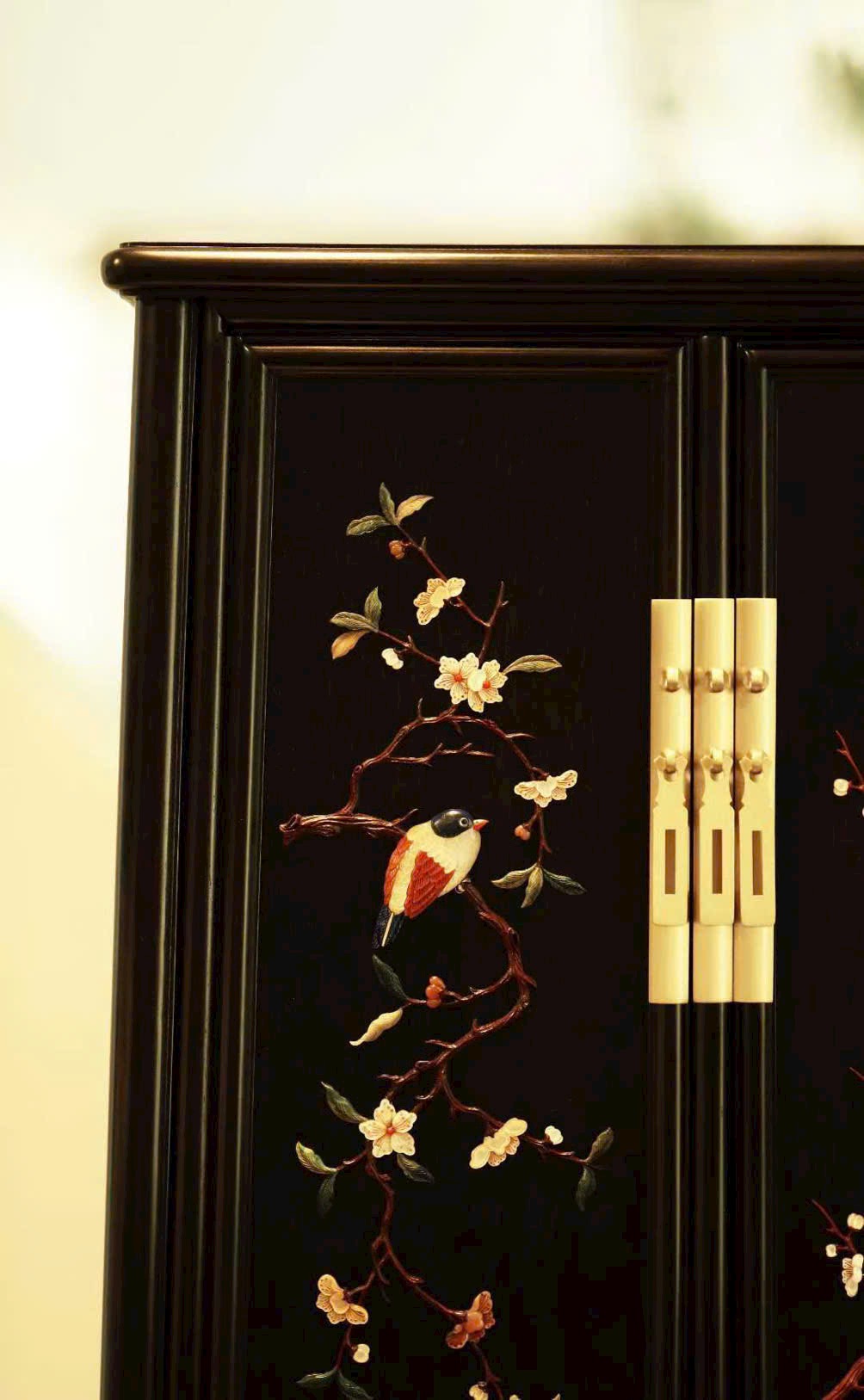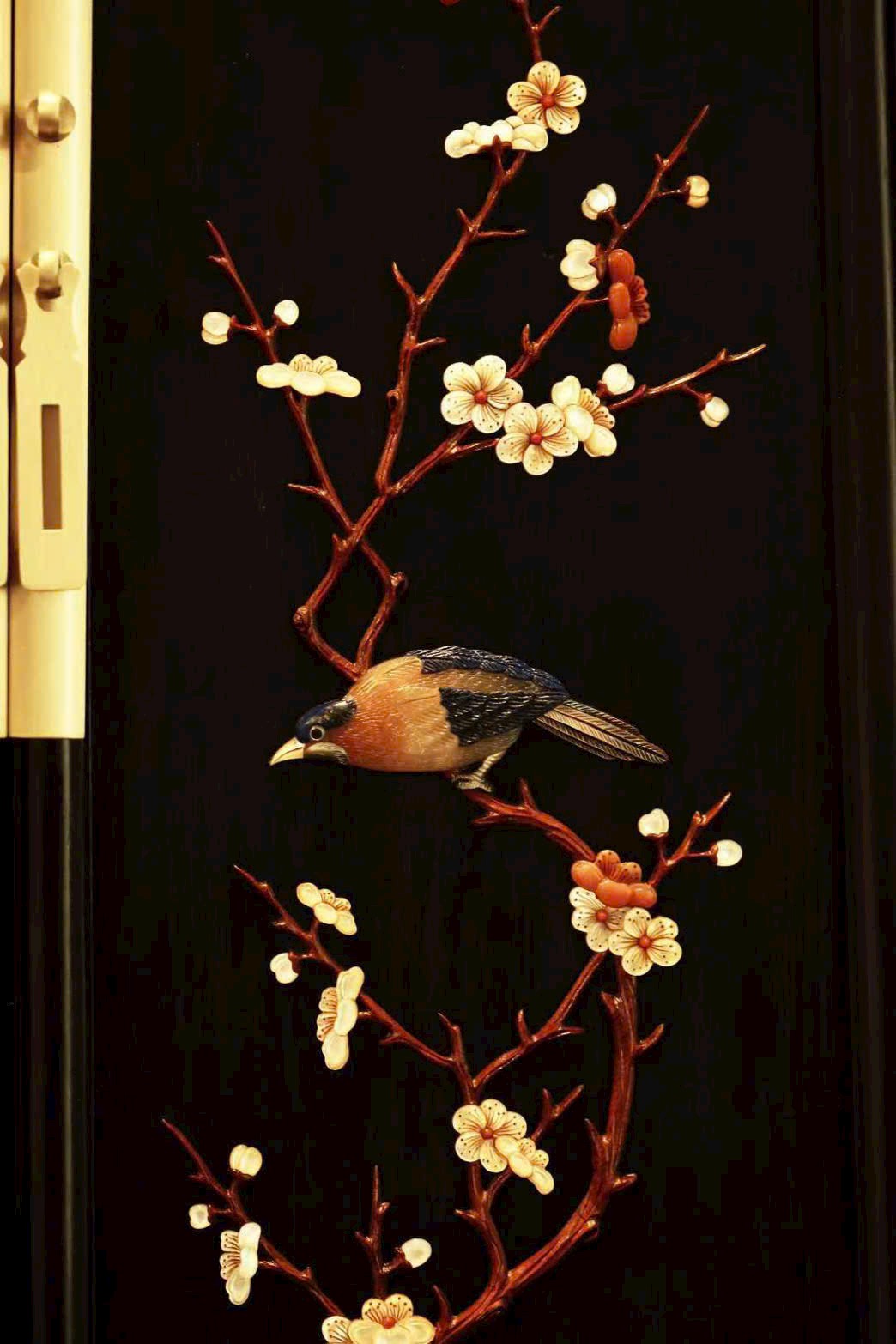 Cánh tủ khảm bách bảo, sắc màu hài hòa mà trang nhã; hình chim hỷ tước mang ý tin vui – báo xuân – cát tường.