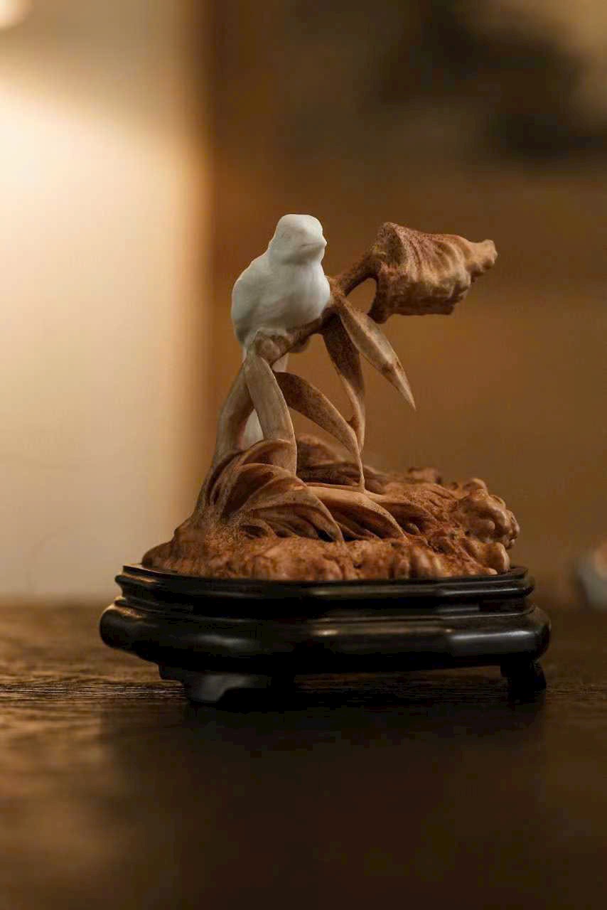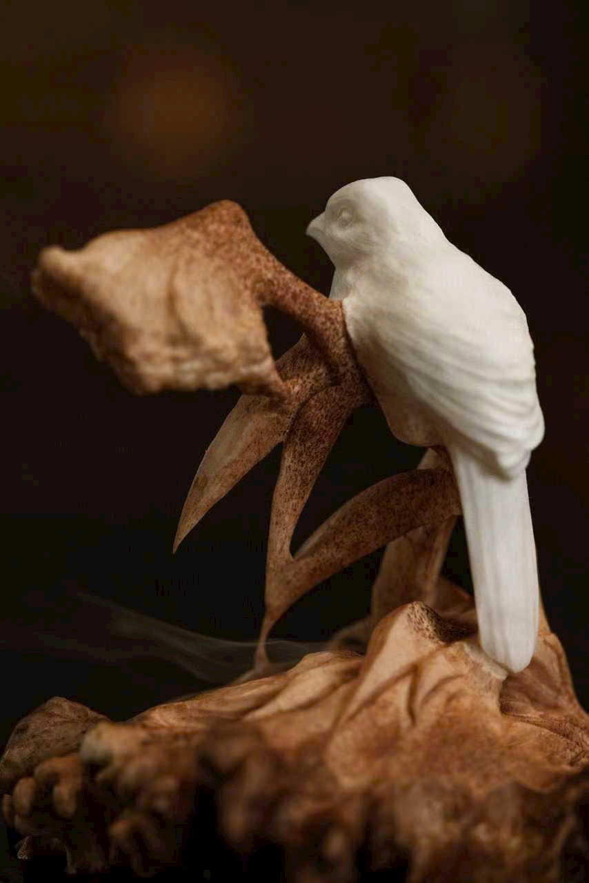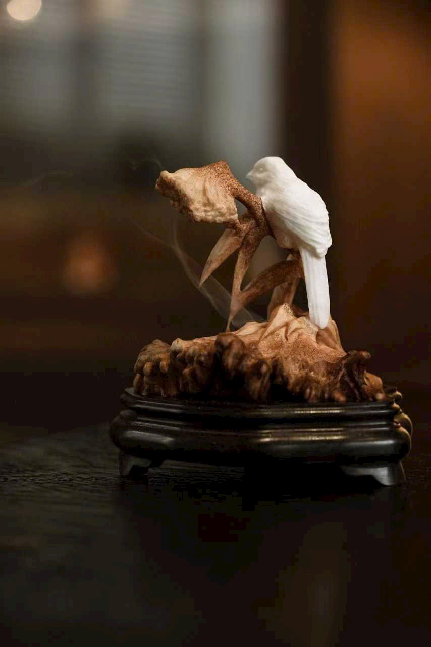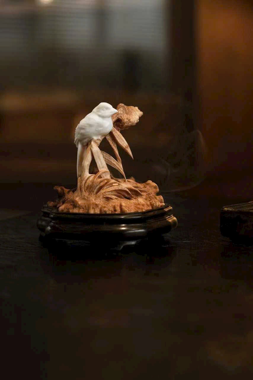 Bóng trúc u tịch, toàn bộ thủ công chế tác. Như nét bút tung hoành trong tuyết, con chim khách co cổ đứng nơi đầu trúc gãy, chóp cánh để lại vệt bút phẩy tựa cánh sen tàn. Một chân bám chặt, lá trúc lay theo gió như tờ tuyên cũ bị xé. Khói hương gặp nhánh trúc liền tản thành vệt trắng phai nhạt của 《Khoái Tuyết Thiếp》, phảng phất thấy cảnh Bát Đại họa sĩ trong “Canh Hương Viện” đốt tranh tế trời, khói xanh tro xám xoay rơi