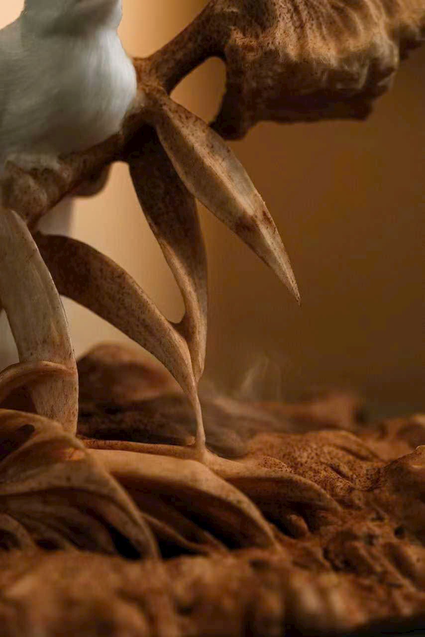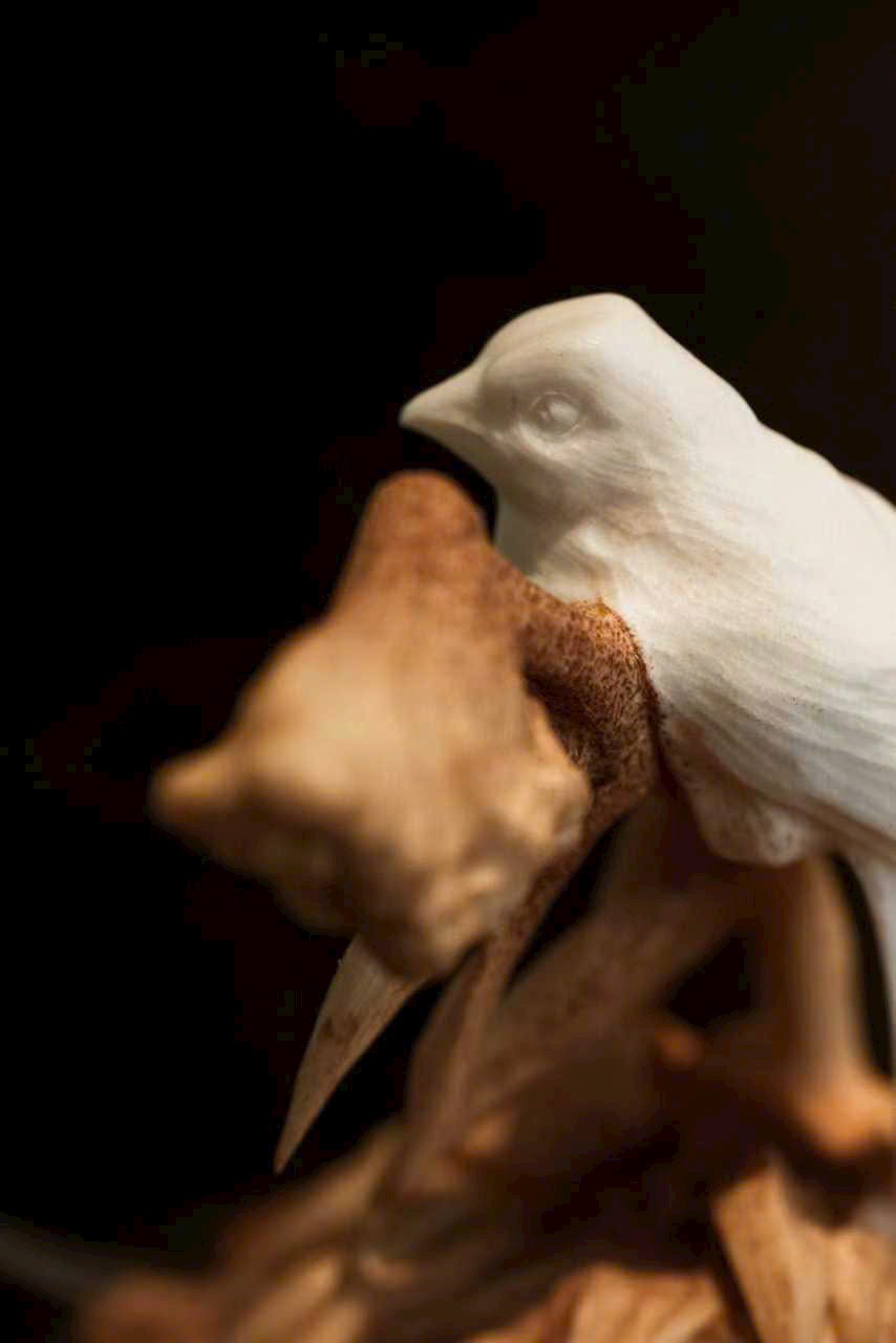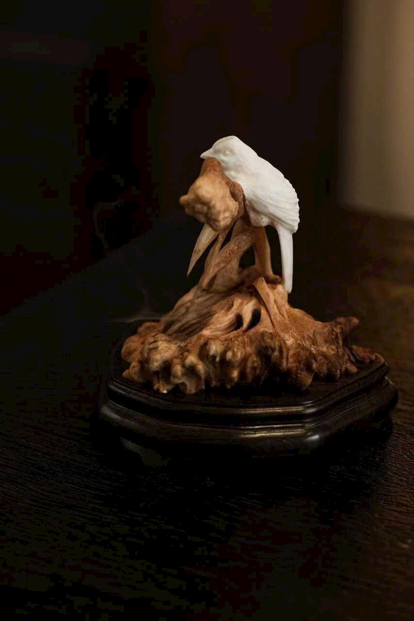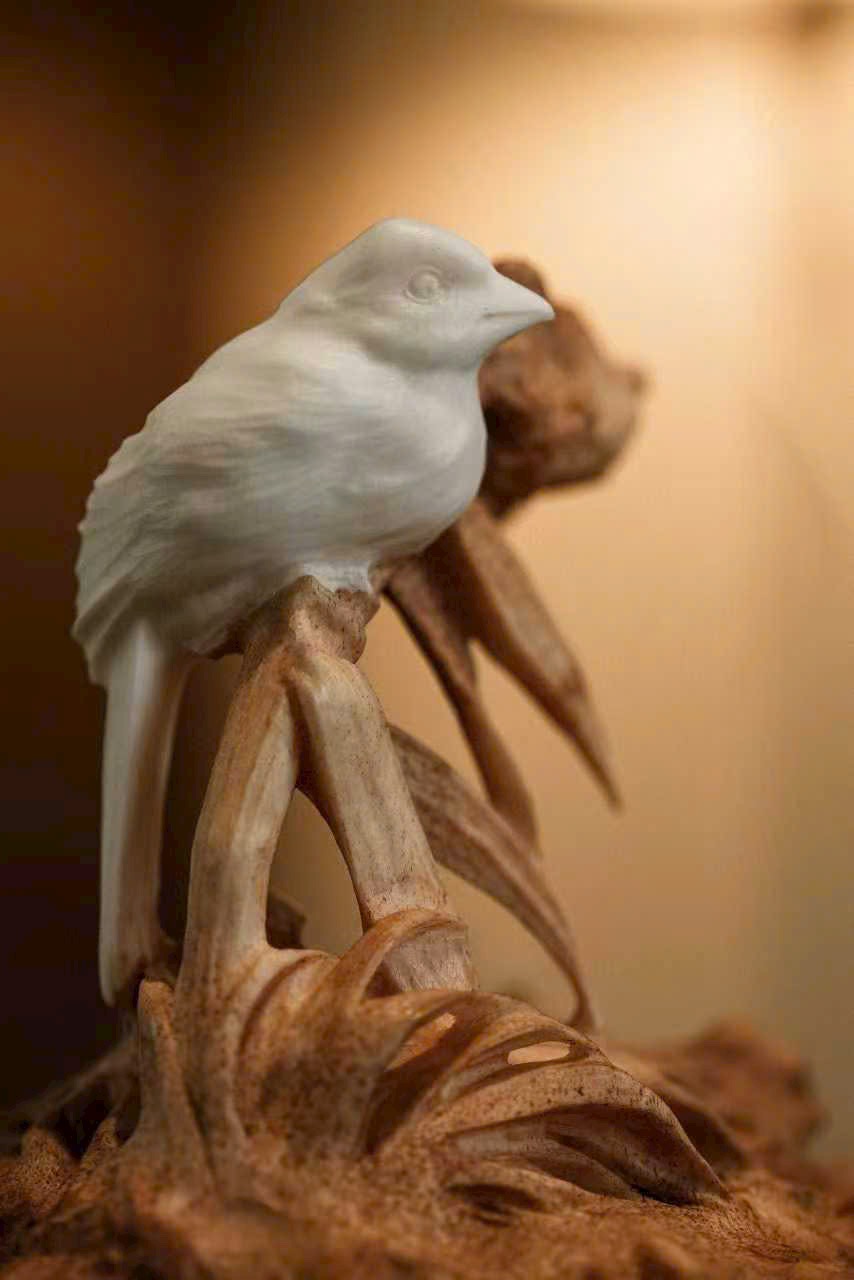 Bóng trúc u tịch, toàn bộ thủ công chế tác. Như nét bút tung hoành trong tuyết, con chim khách co cổ đứng nơi đầu trúc gãy, chóp cánh để lại vệt bút phẩy tựa cánh sen tàn. Một chân bám chặt, lá trúc lay theo gió như tờ tuyên cũ bị xé. Khói hương gặp nhánh trúc liền tản thành vệt trắng phai nhạt của 《Khoái Tuyết Thiếp》, phảng phất thấy cảnh Bát Đại họa sĩ trong “Canh Hương Viện” đốt tranh tế trời, khói xanh tro xám xoay rơi