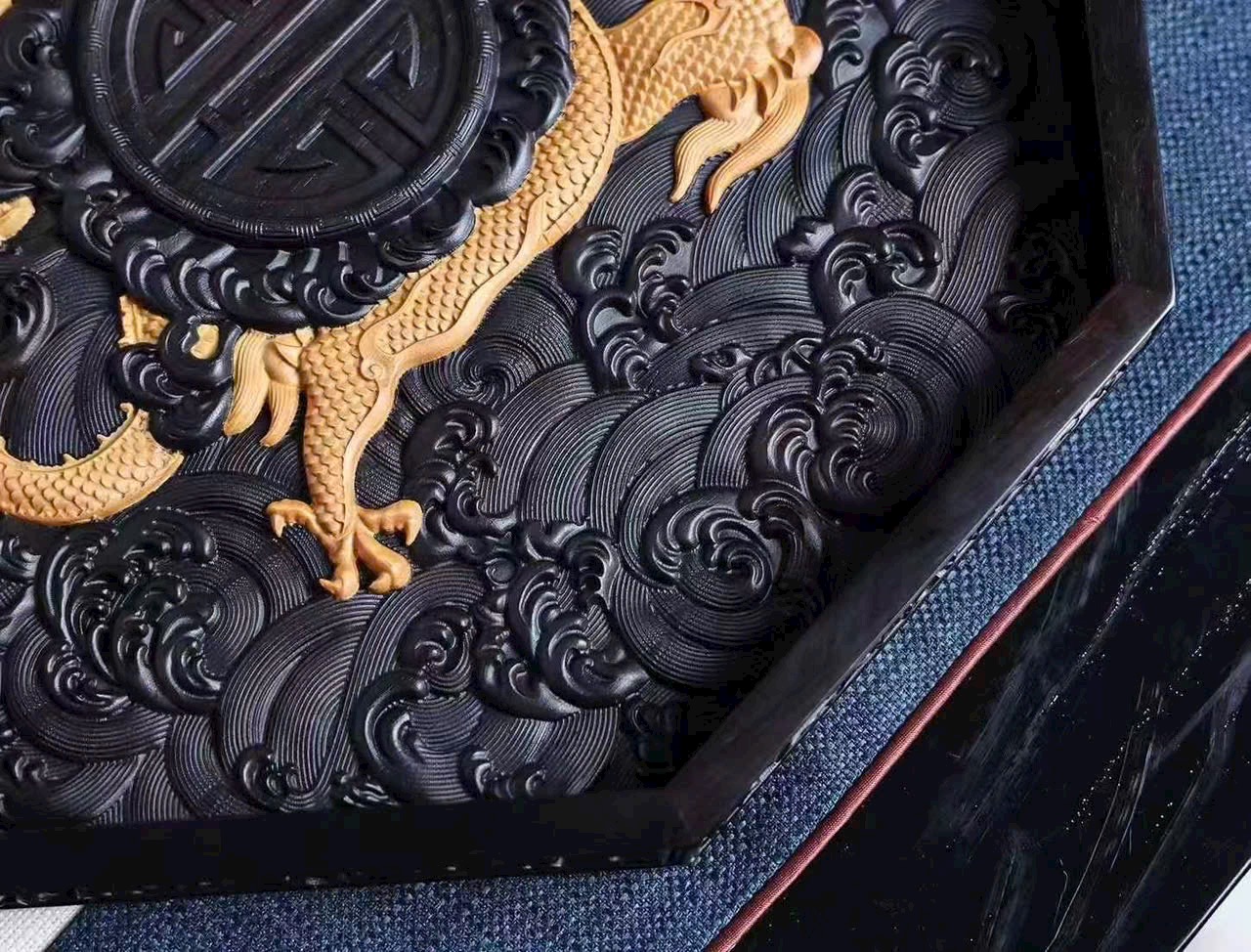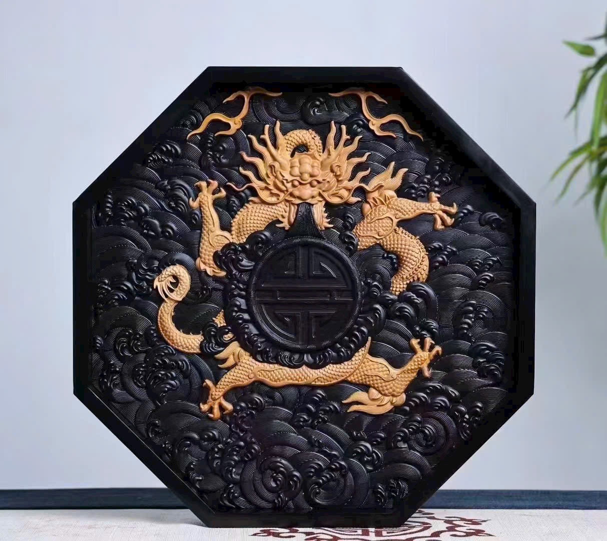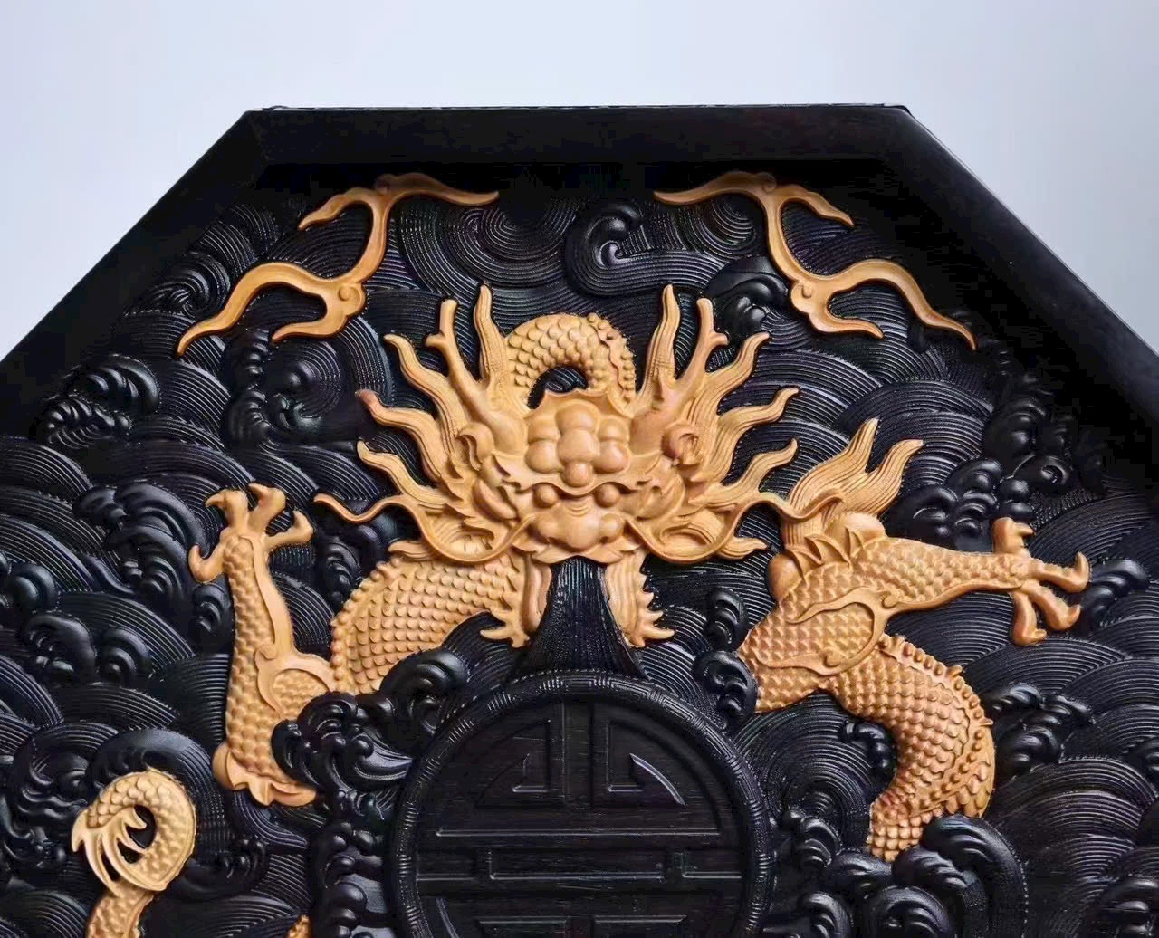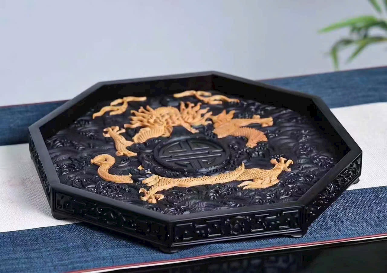 - Được chế tác kết hợp giữa gỗ tử quang đàn và gỗ hoàng dương, khay có hình bát giác với các cạnh bằng nhau, tạo cảm giác cân đối và vững chãi. Nghệ nhân sử dụng kỹ thuật chạm khắc điêu luyện để trang trí họa tiết rồng chơi nước, mang vẻ uy nghi, mạnh mẽ và đầy khí thế.