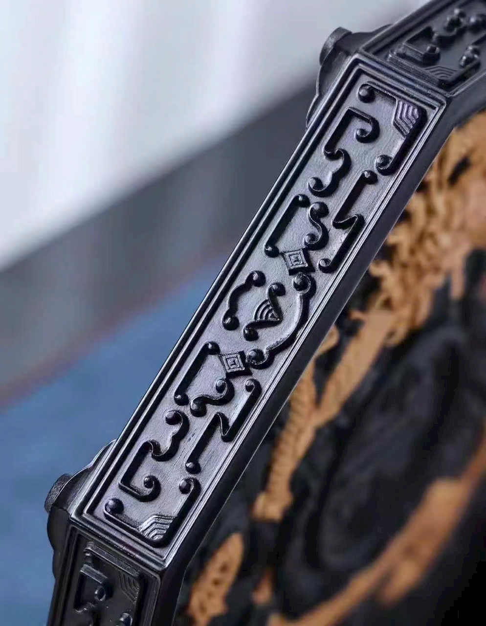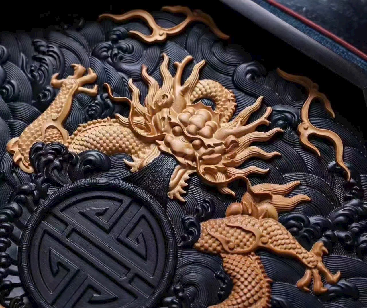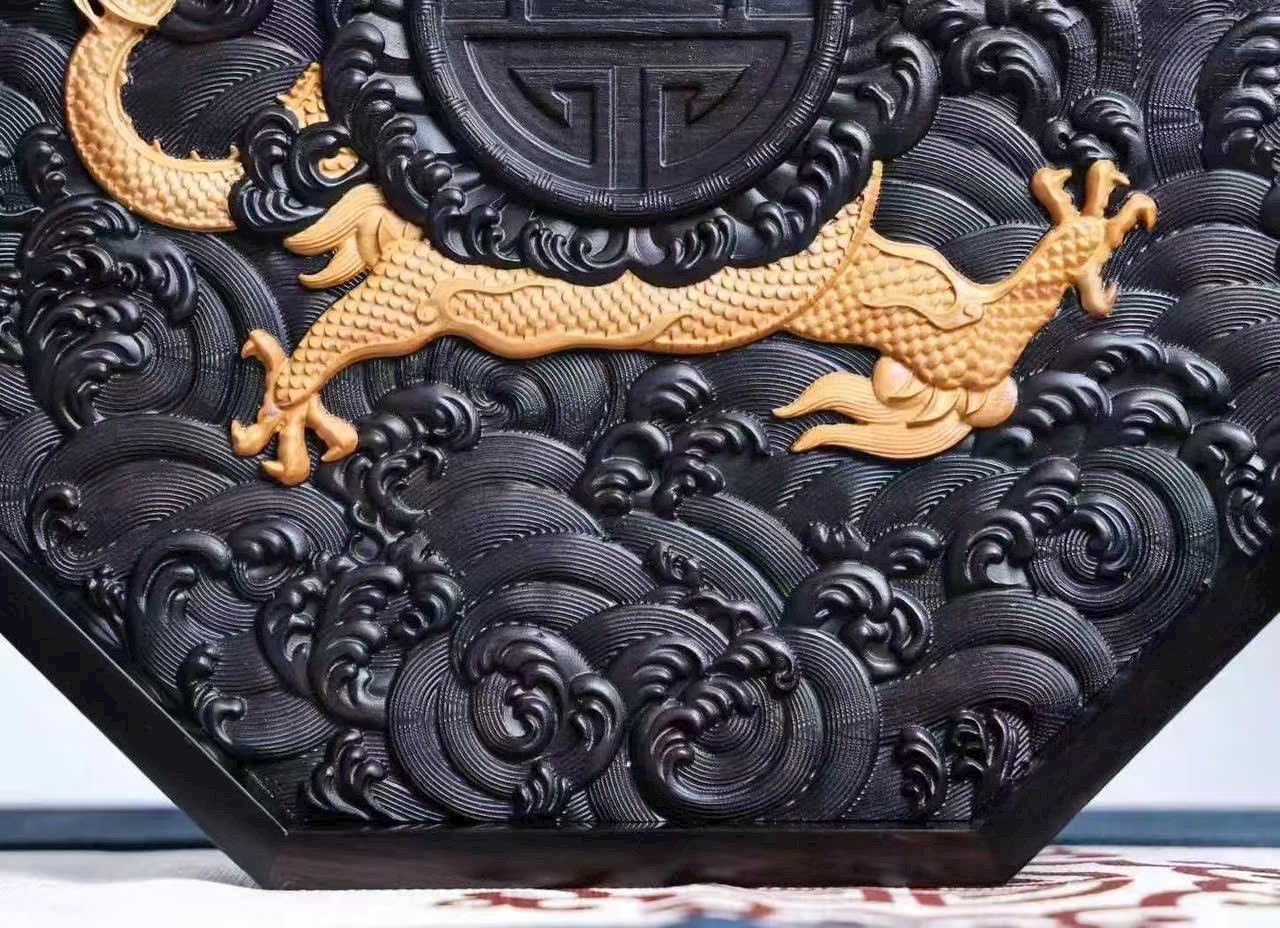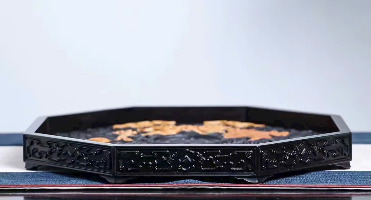 - Được chế tác kết hợp giữa gỗ tử quang đàn và gỗ hoàng dương, khay có hình bát giác với các cạnh bằng nhau, tạo cảm giác cân đối và vững chãi. Nghệ nhân sử dụng kỹ thuật chạm khắc điêu luyện để trang trí họa tiết rồng chơi nước, mang vẻ uy nghi, mạnh mẽ và đầy khí thế.
