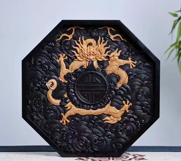- Được chế tác kết hợp giữa gỗ tử quang đàn và gỗ hoàng dương, khay có hình bát giác với các cạnh bằng nhau, tạo cảm giác cân đối và vững chãi. Nghệ nhân sử dụng kỹ thuật chạm khắc điêu luyện để trang trí họa tiết rồng chơi nước, mang vẻ uy nghi, mạnh mẽ và đầy khí thế.