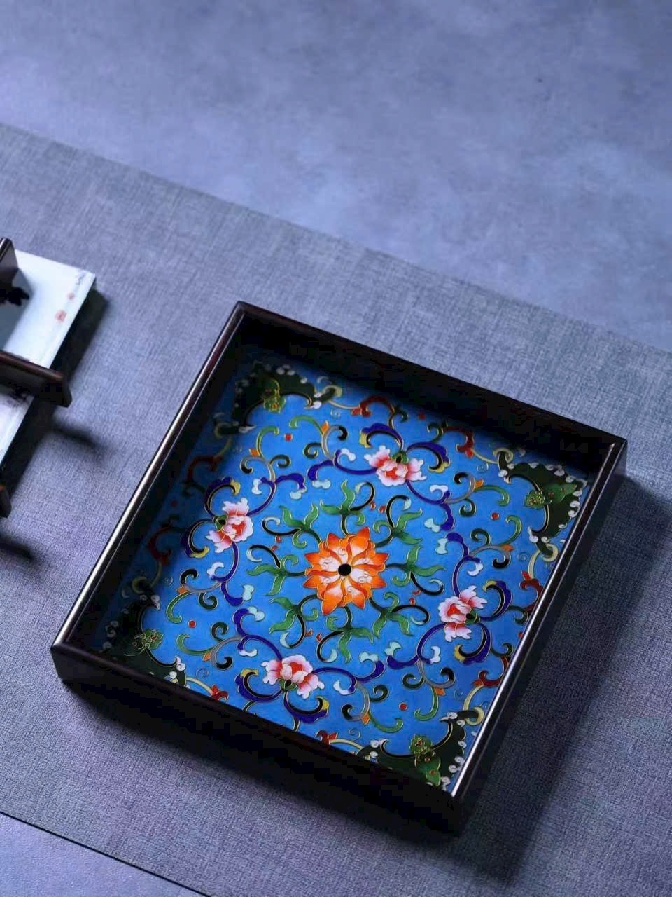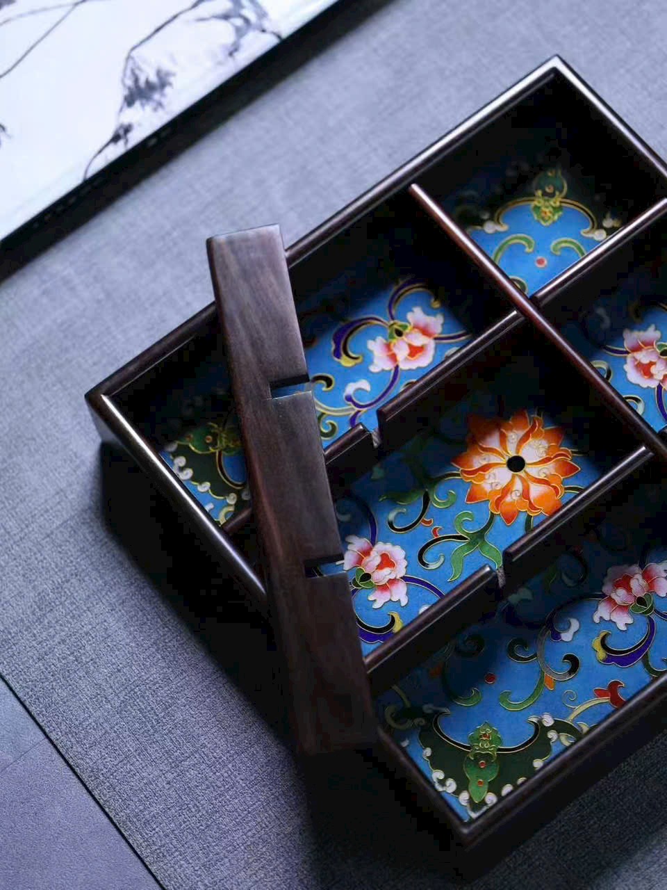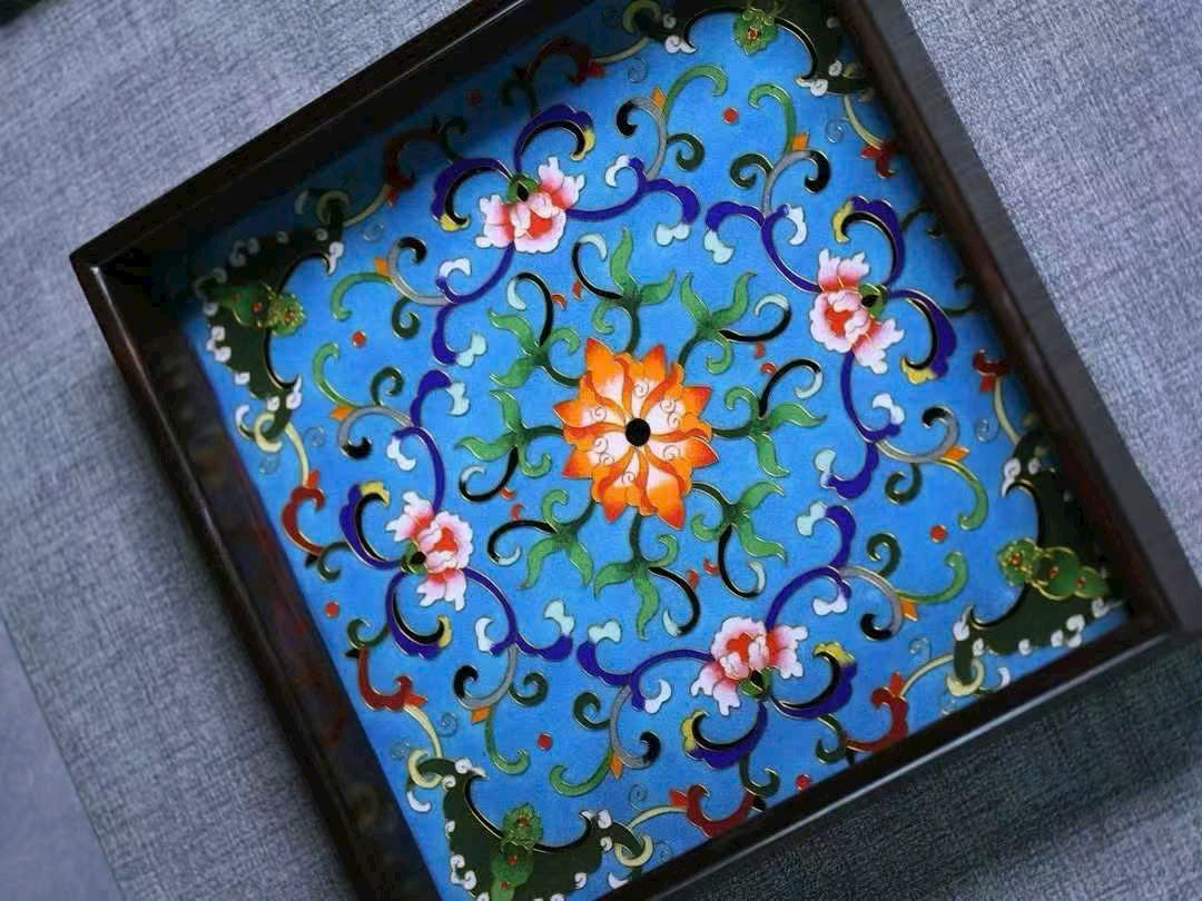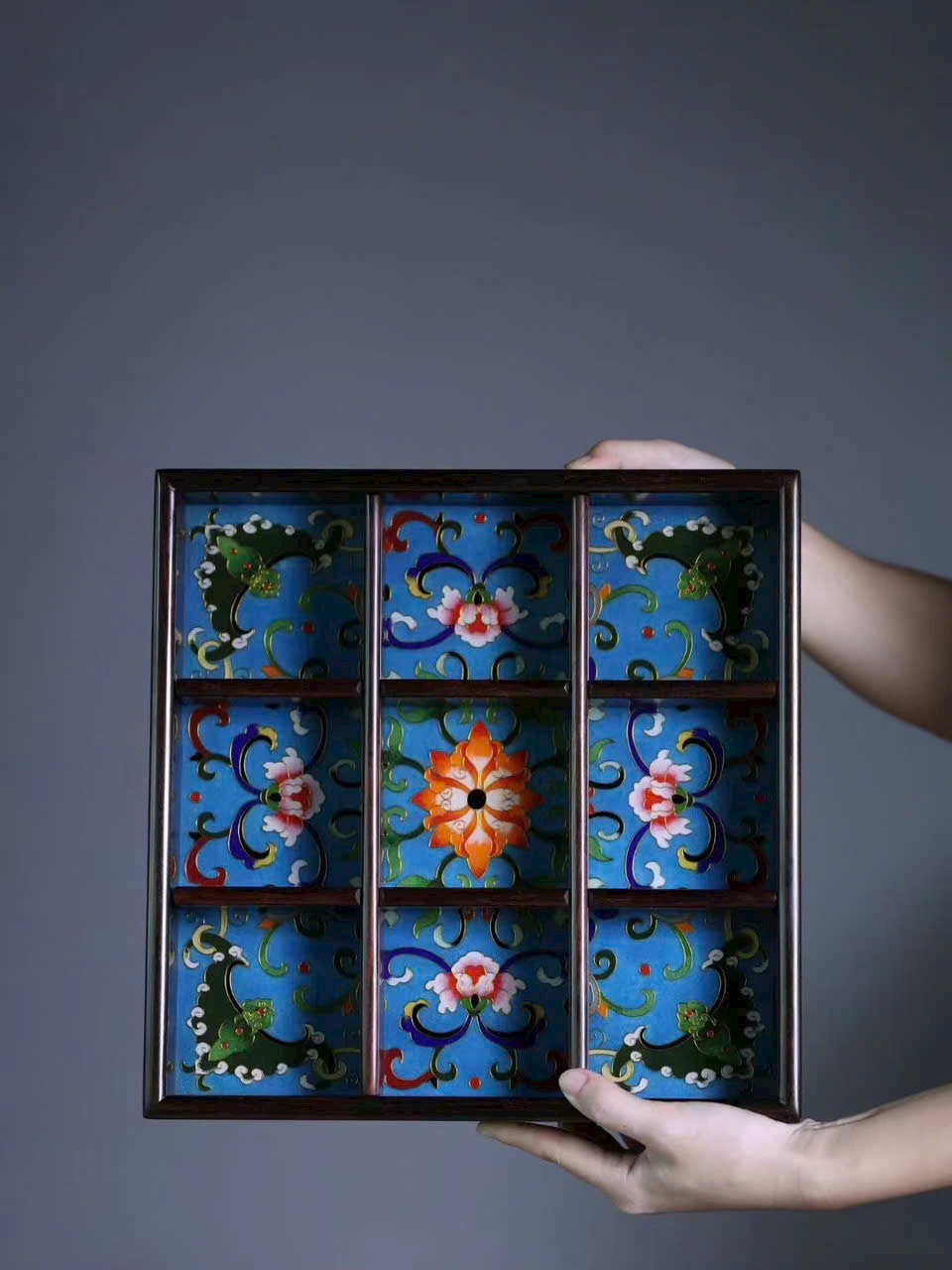 Tác phẩm “Cửu cung cách thừa bàn” được chế tác từ gỗ đại hồng toan chi quý hiếm, khảm men Cảnh Thái Lam tinh mỹ, sắc men trong sáng, ánh sắc rực rỡ mà hài hòa.