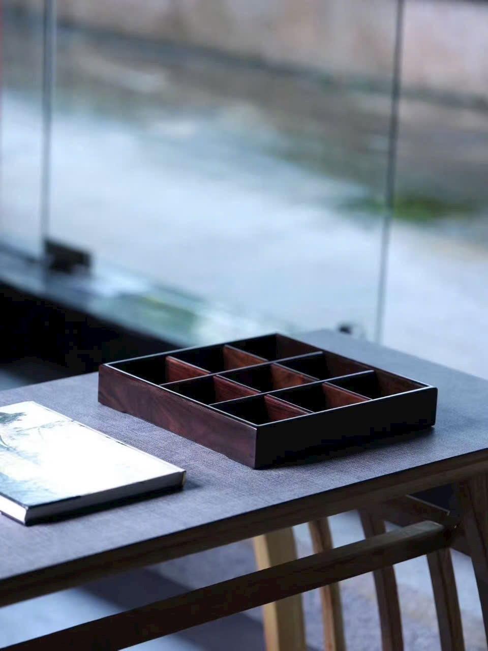 Bố cục chia chín ô vuông ngay ngắn, tỷ lệ cân đối, đường nét thanh thoát, mang đậm ý vị quy củ và mỹ học Đông phương. Có thể dùng để bày biện nơi thư phòng, trang trí mỹ vật, hoặc cất giữ kỳ trân dị bảo, vừa thực dụng, vừa mang giá trị nghệ thuật và sưu tầm cao.