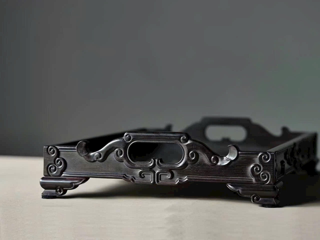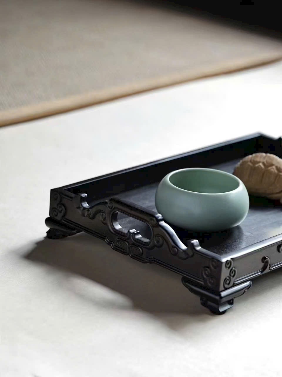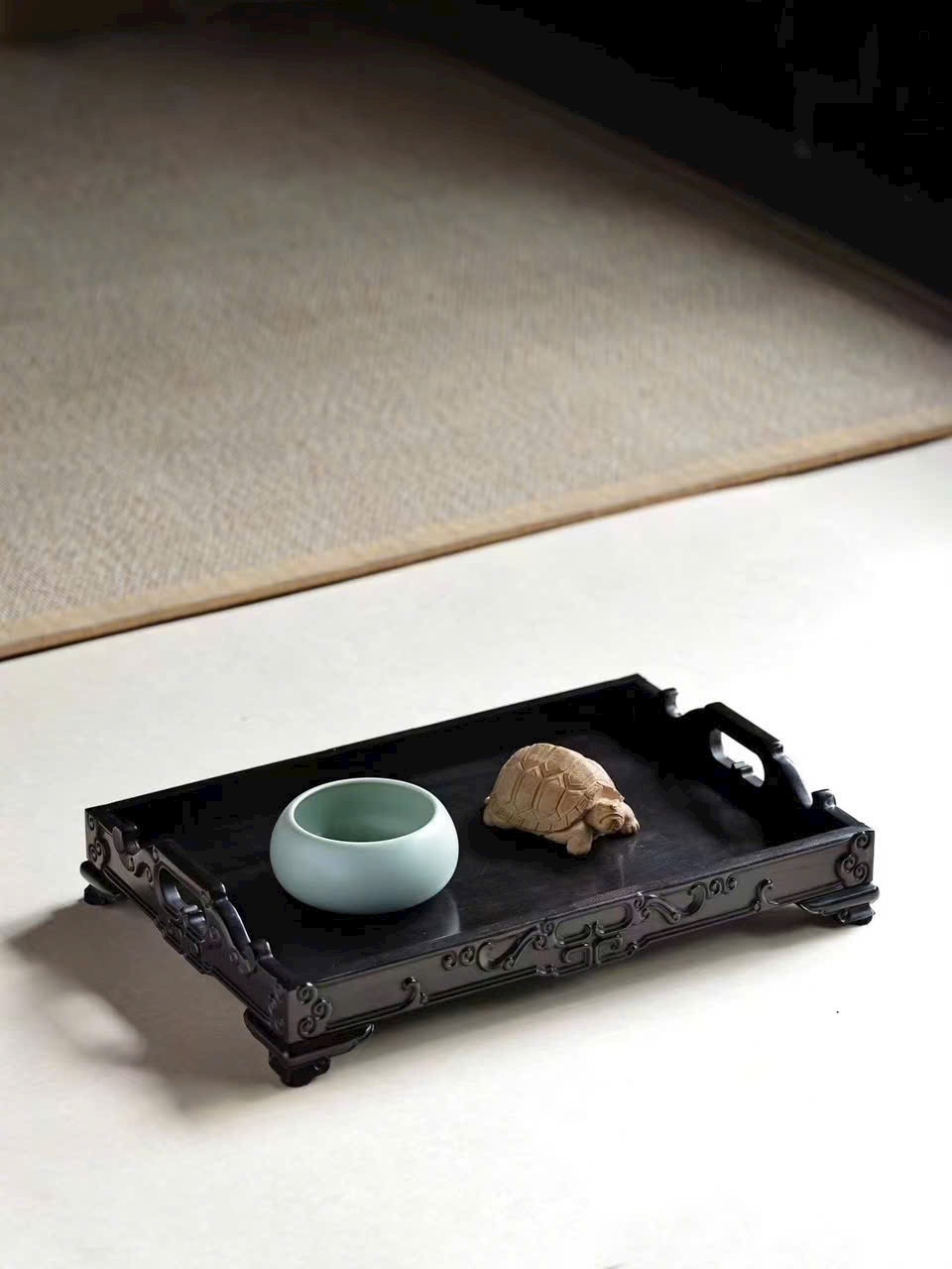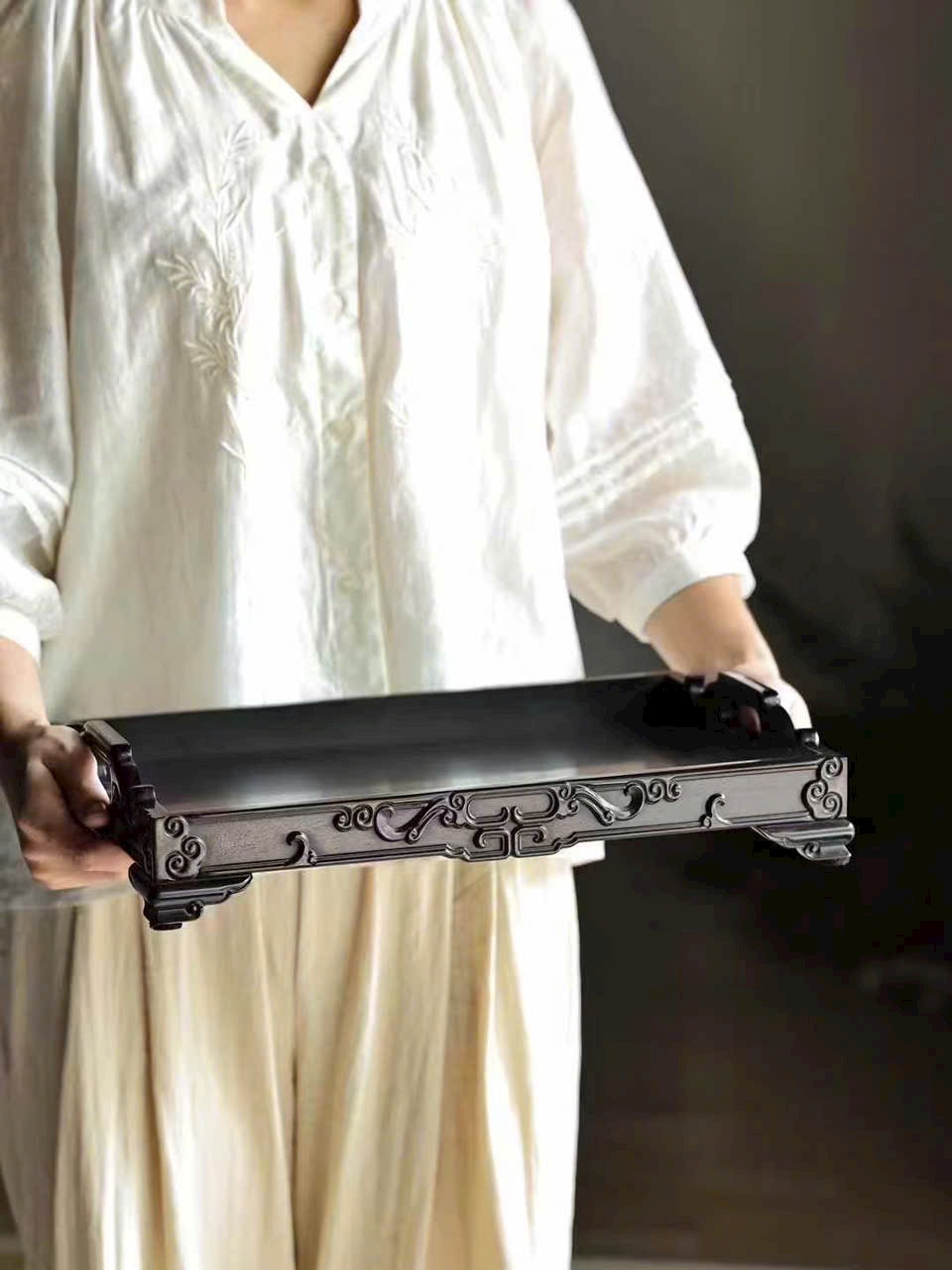 Chiếc khay này tuy nhỏ nhưng được chế tác công phu, bốn mặt chạm hoa văn cuộn cỏ như ý, viền mép khắc chìm họa tiết tinh tế. Các góc bo tròn, ghép mộng chắc chắn, toát lên khí chất tao nhã, mang phong vị cung đình.