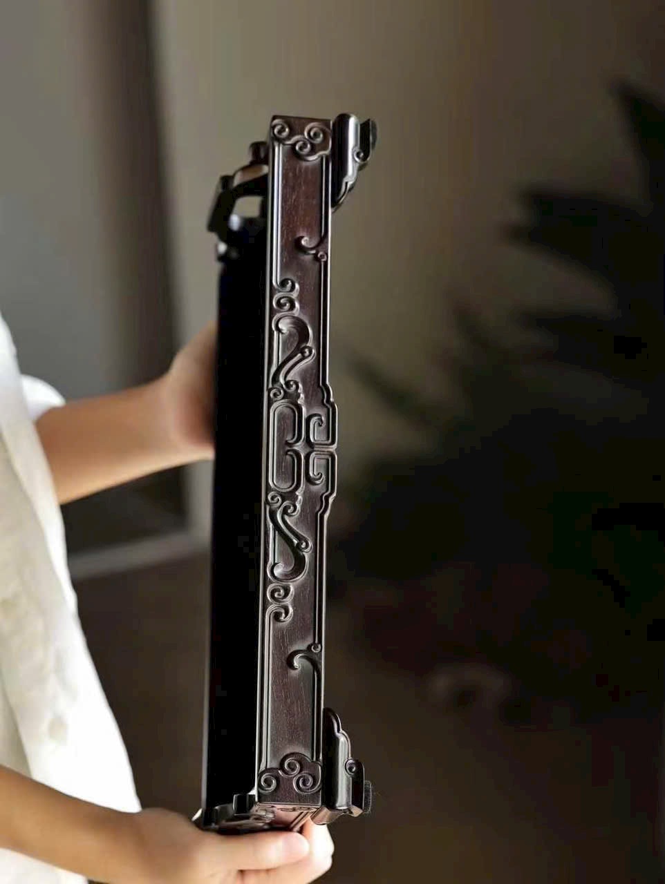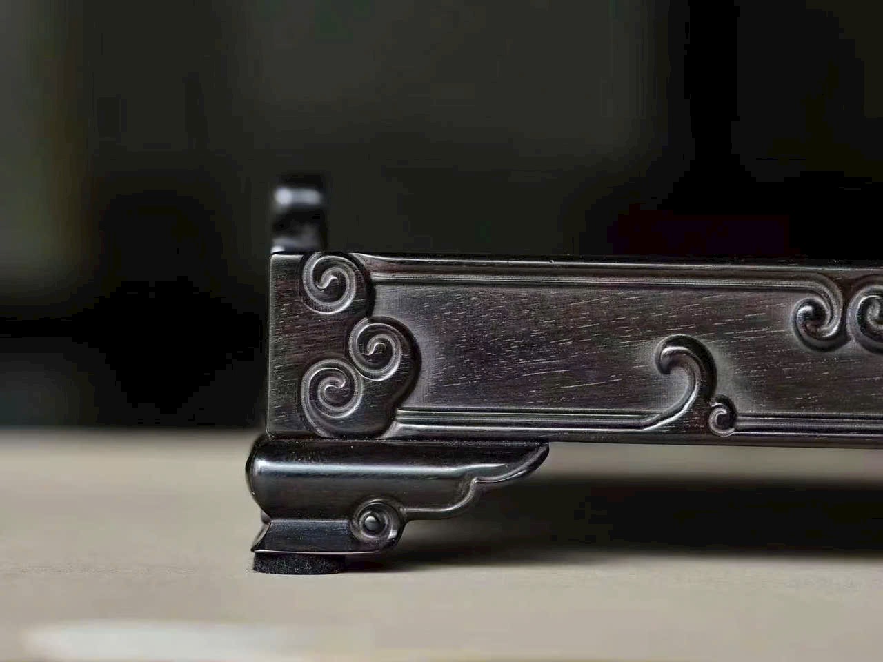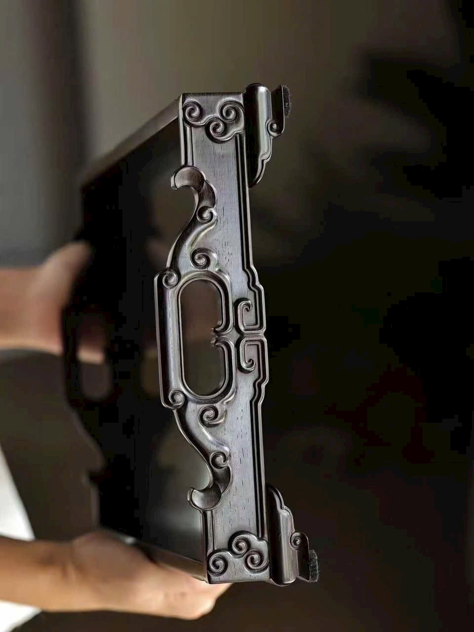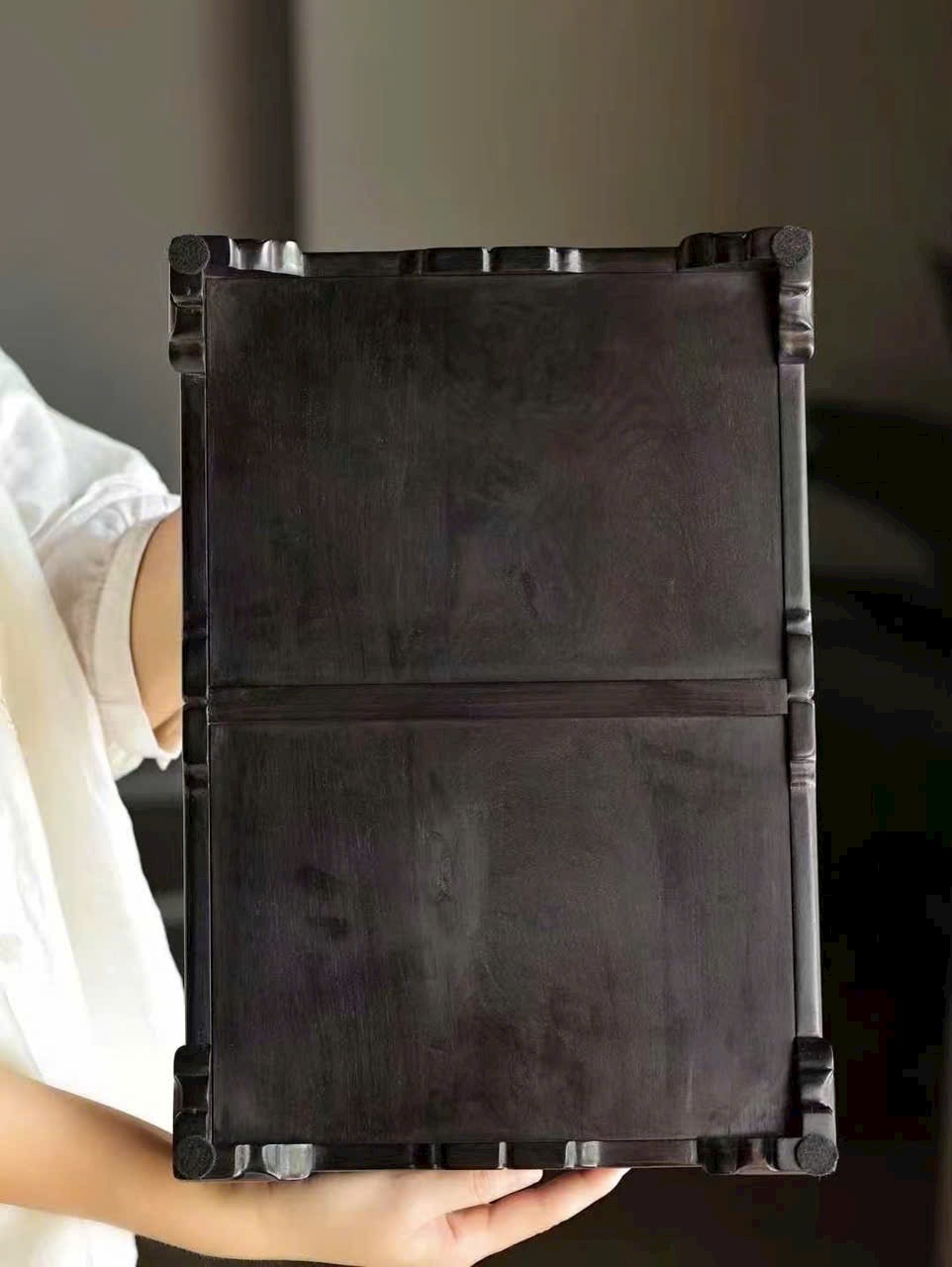 Chiếc khay này tuy nhỏ nhưng được chế tác công phu, bốn mặt chạm hoa văn cuộn cỏ như ý, viền mép khắc chìm họa tiết tinh tế. Các góc bo tròn, ghép mộng chắc chắn, toát lên khí chất tao nhã, mang phong vị cung đình.