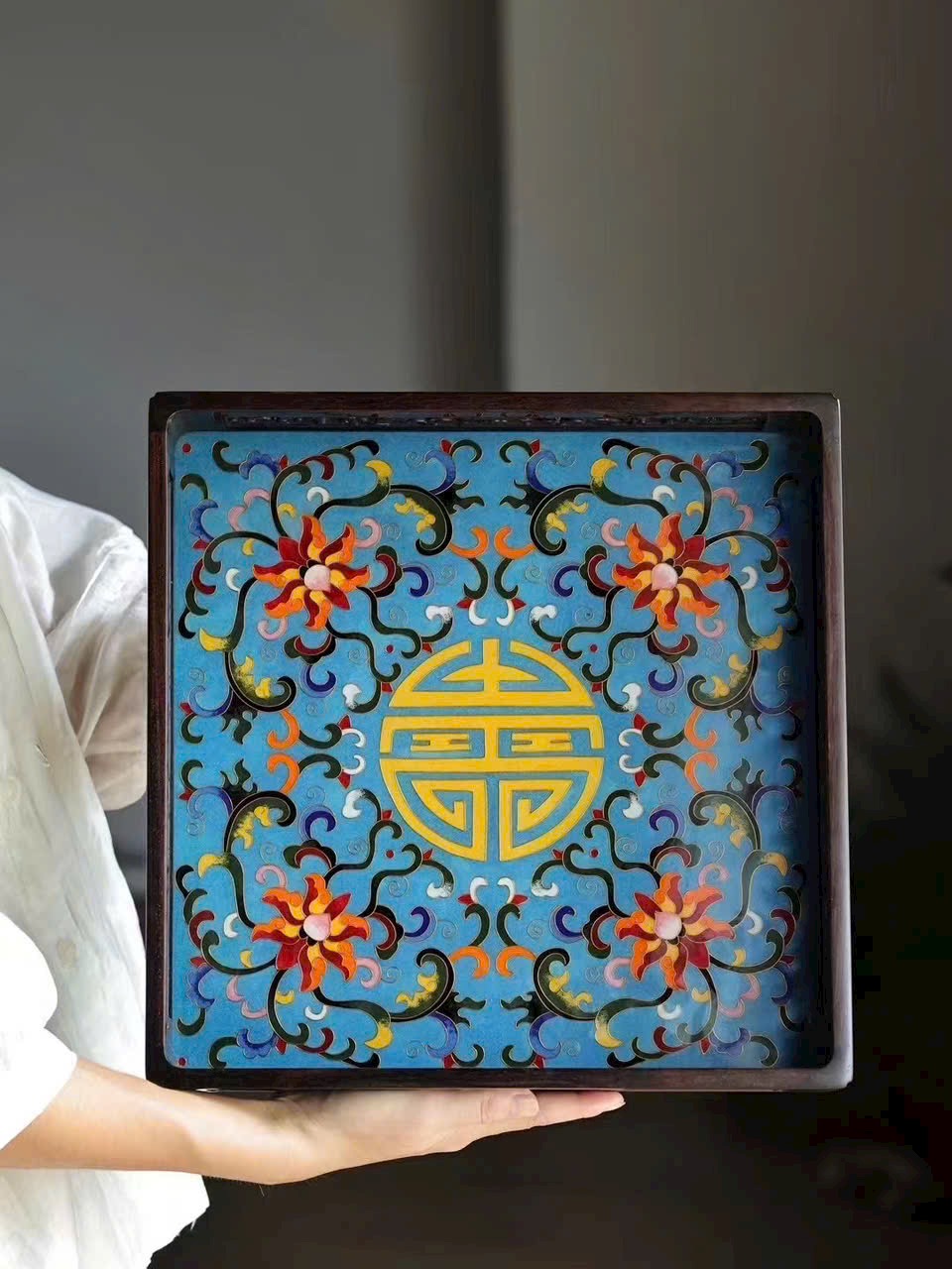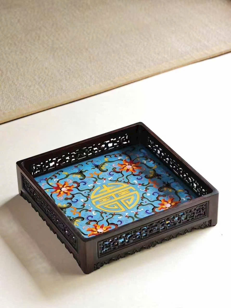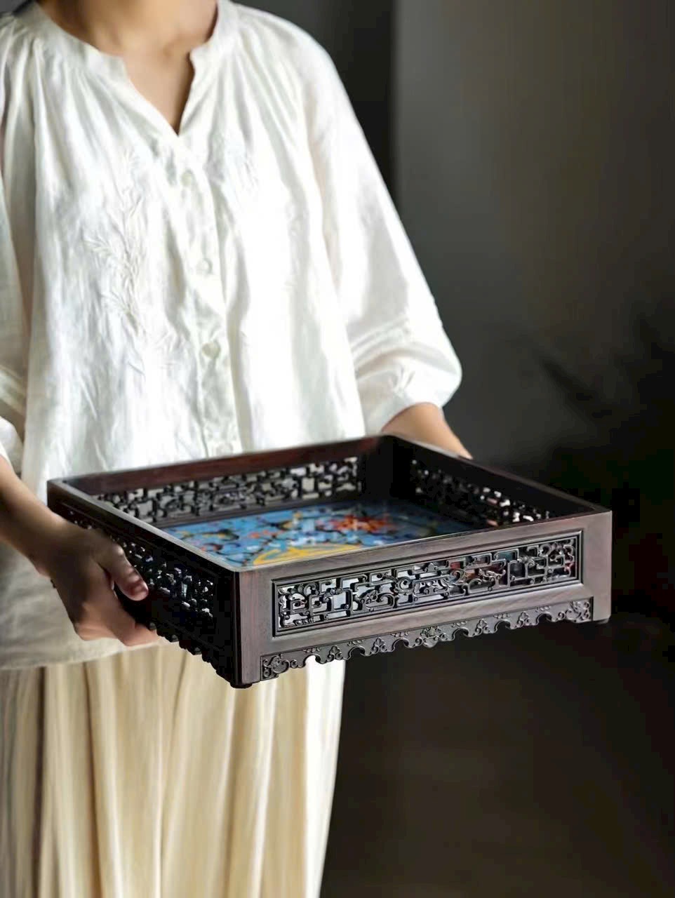 - Chất liệu: Khay gỗ trắc đỏ Lào, khảm đồng tráng men Cảnh Thái Lam