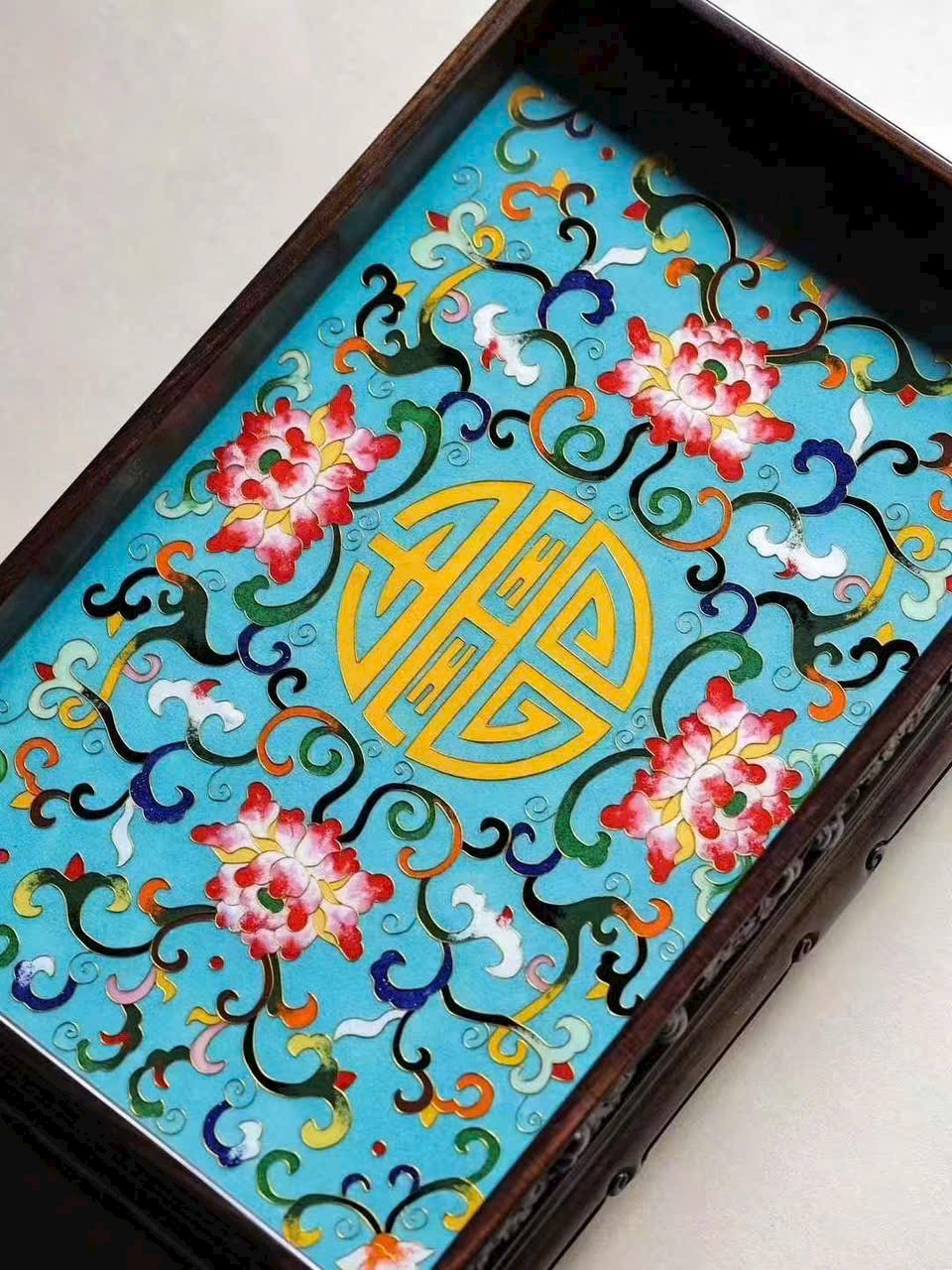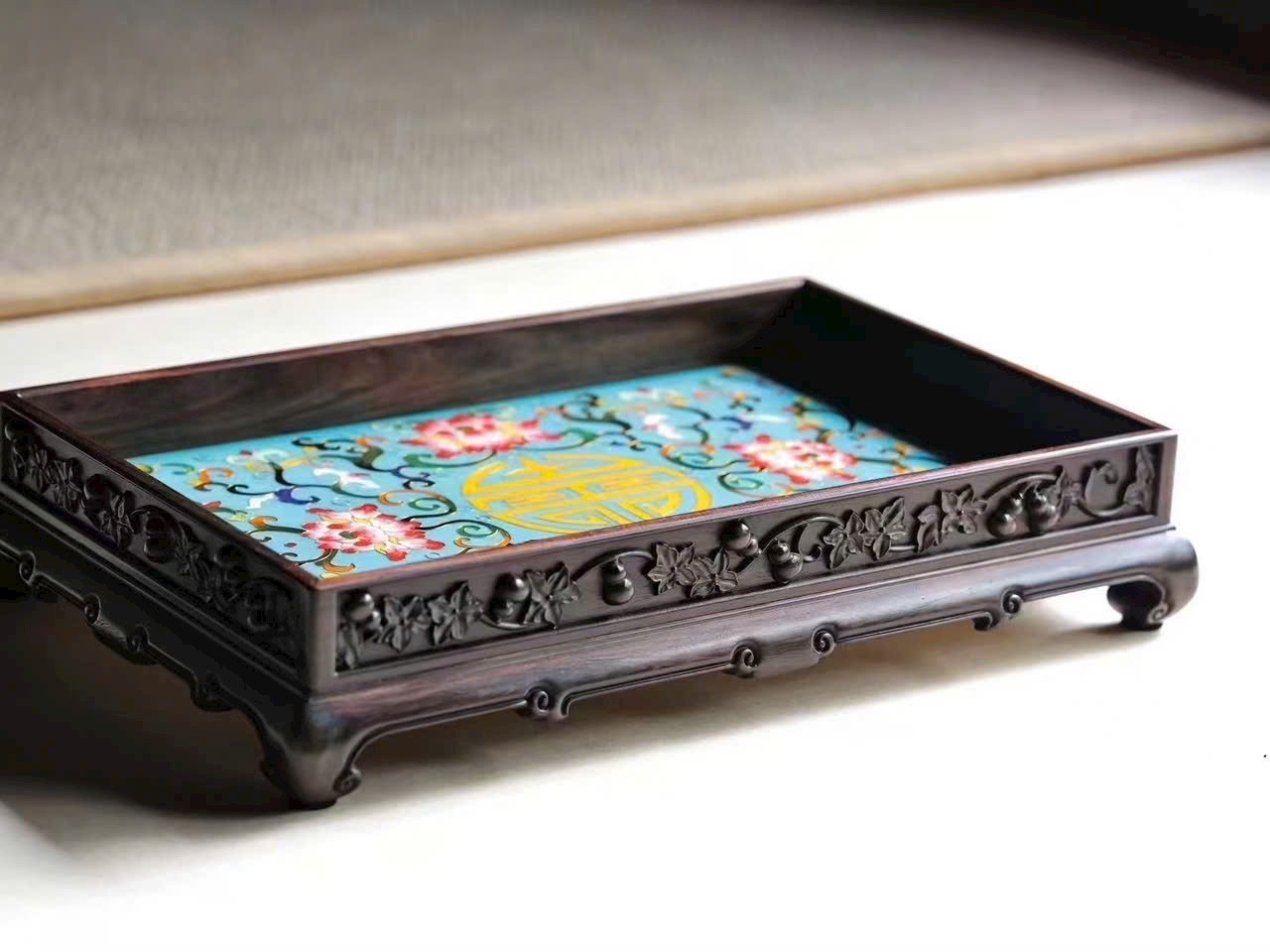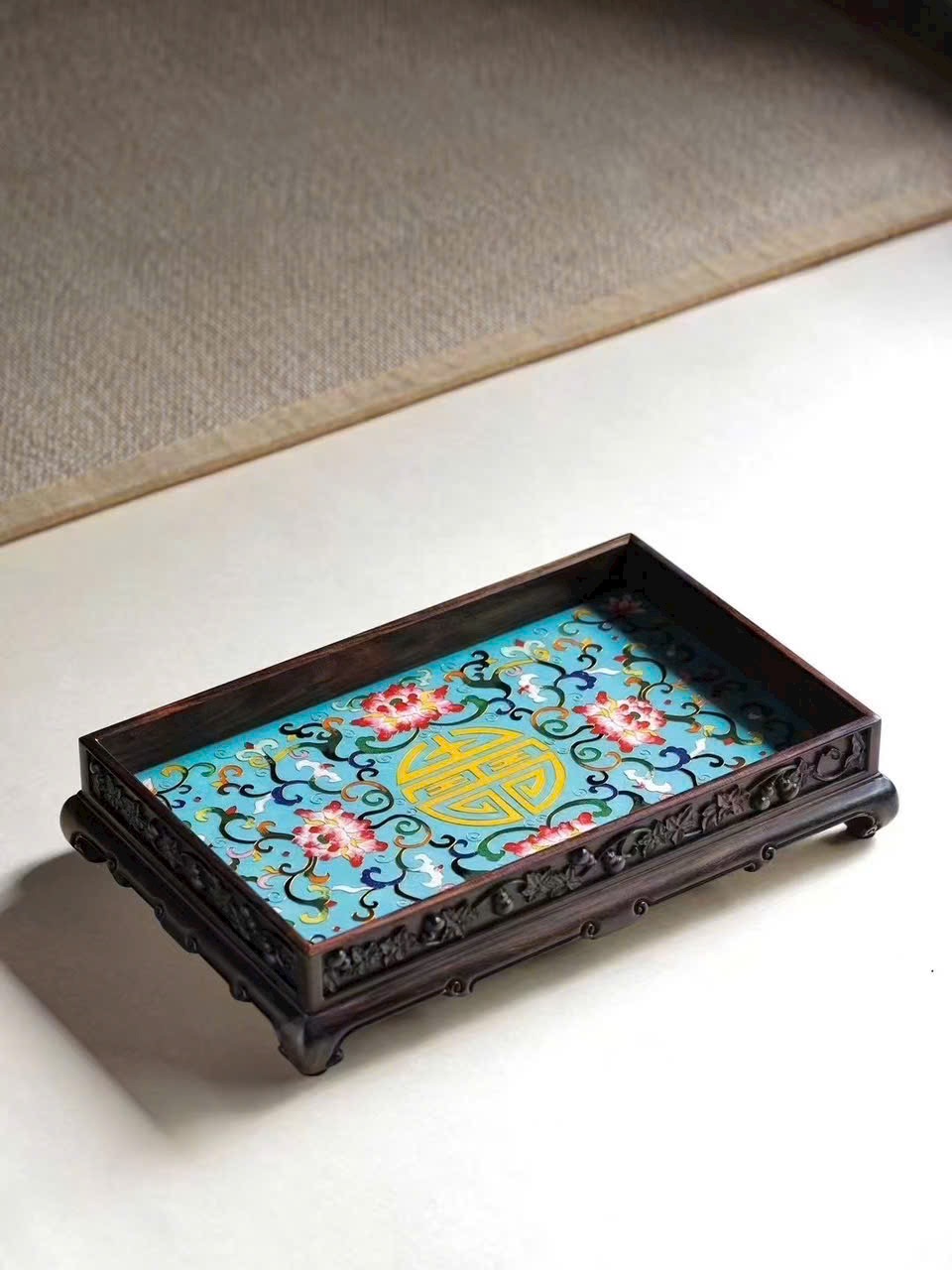 - Chất liệu: Khay gỗ trắc đỏ Lào, khảm đồng tráng men Cảnh Thái Lam
