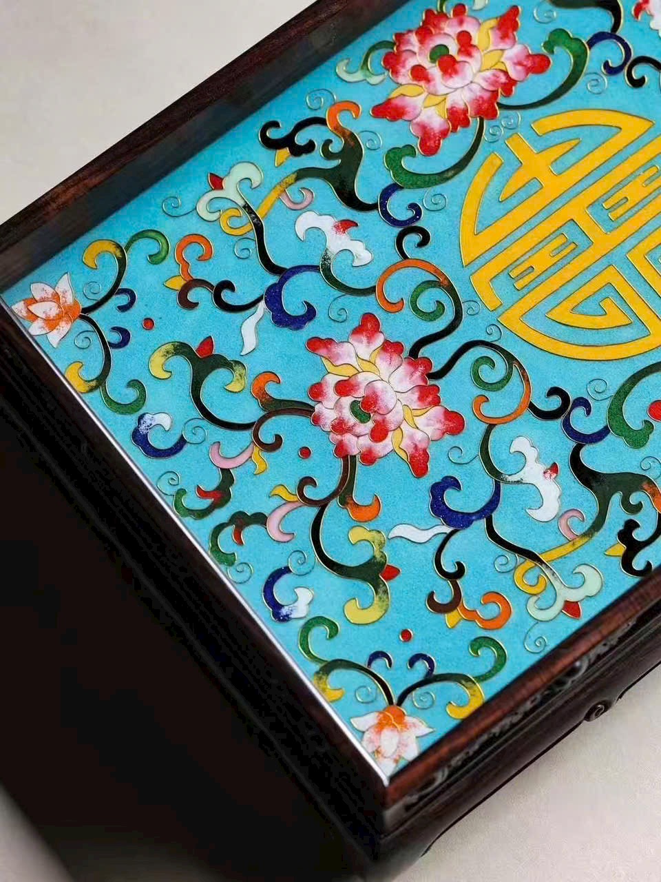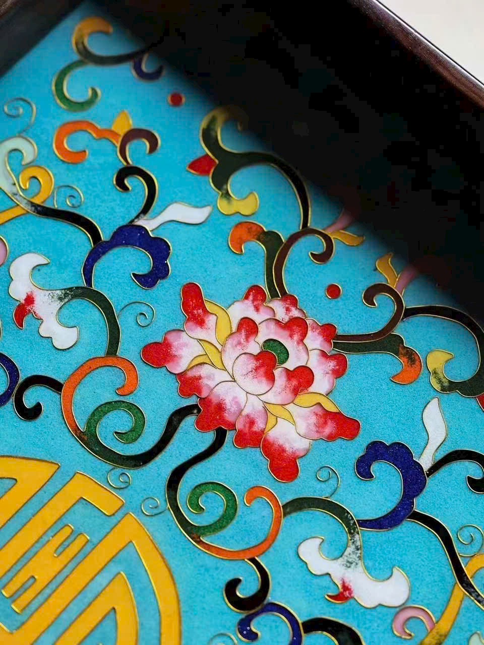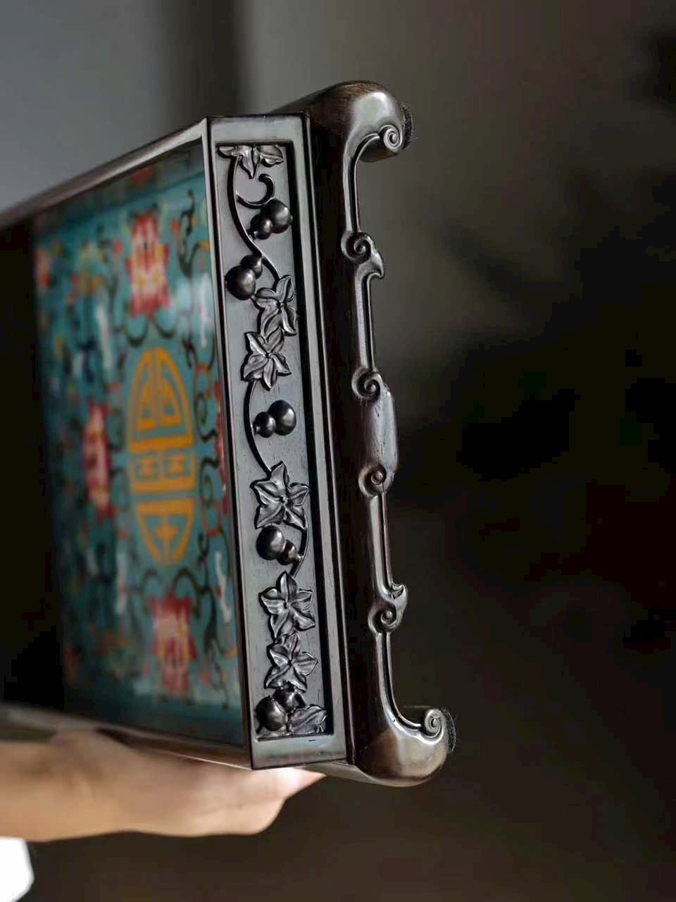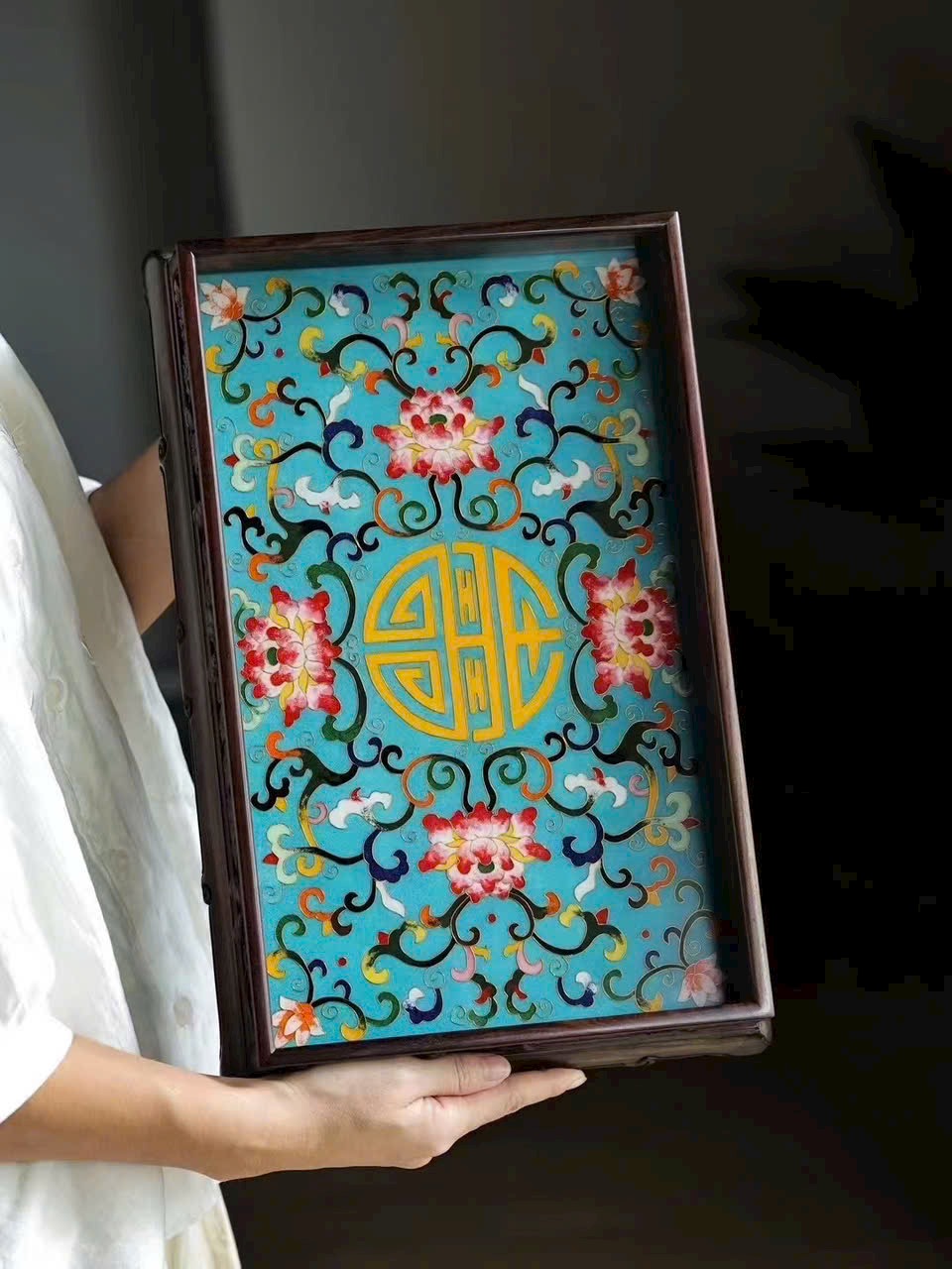 - Chất liệu: Khay gỗ trắc đỏ Lào, khảm đồng tráng men Cảnh Thái Lam
