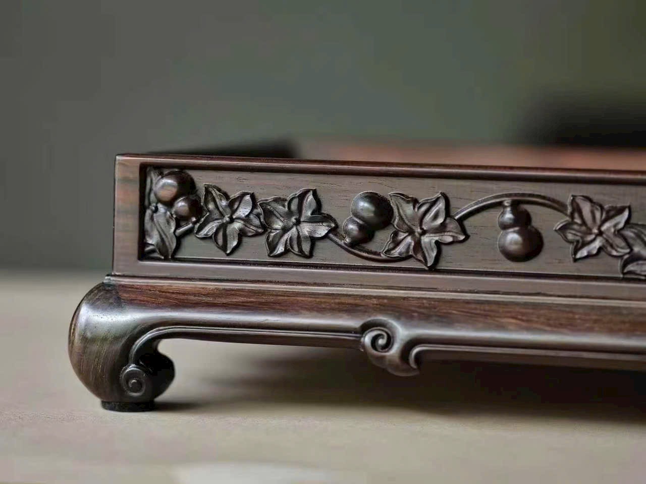 - Được chế tác tinh xảo bằng kỹ thuật mộng – mộng truyền thống trên chất liệu gỗ trắc đỏ lớn Lào, khay có hình chữ nhật với đường nét mượt mà, thanh thoát.