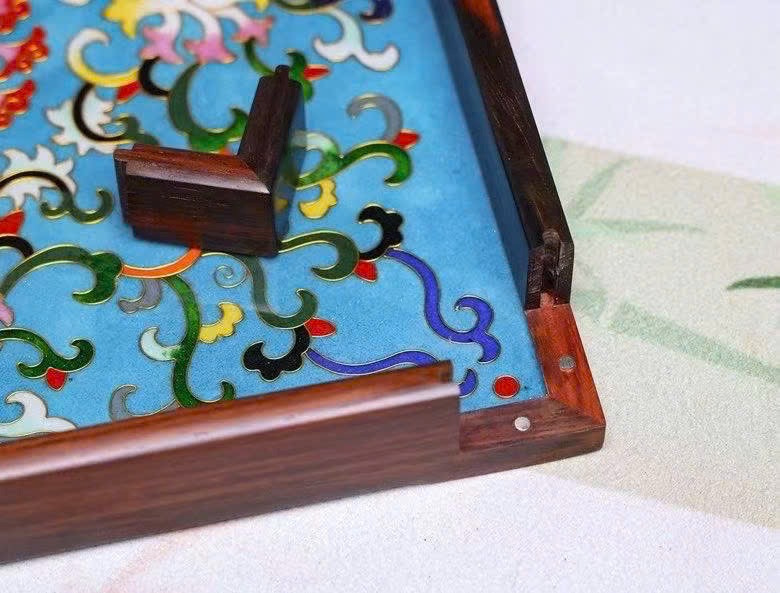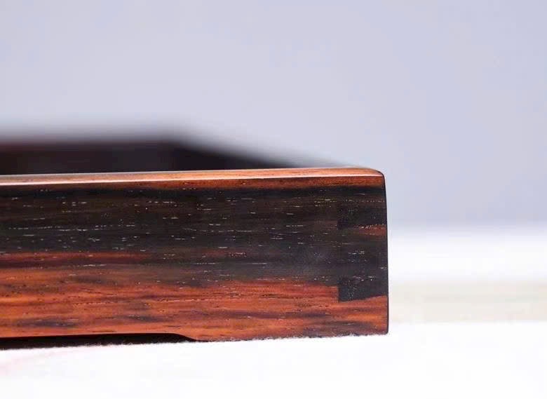Đặc điểm: Chế tác tinh xảo từ gỗ trắc Lào theo kỹ thuật mộng ghép, dáng vuông vức với đường nét trơn tru. Có thể dùng làm khay văn phòng, mang vẻ thanh nhã, trang nghiêm, vừa có giá trị thưởng ngoạn vừa có giá trị sử dụng.