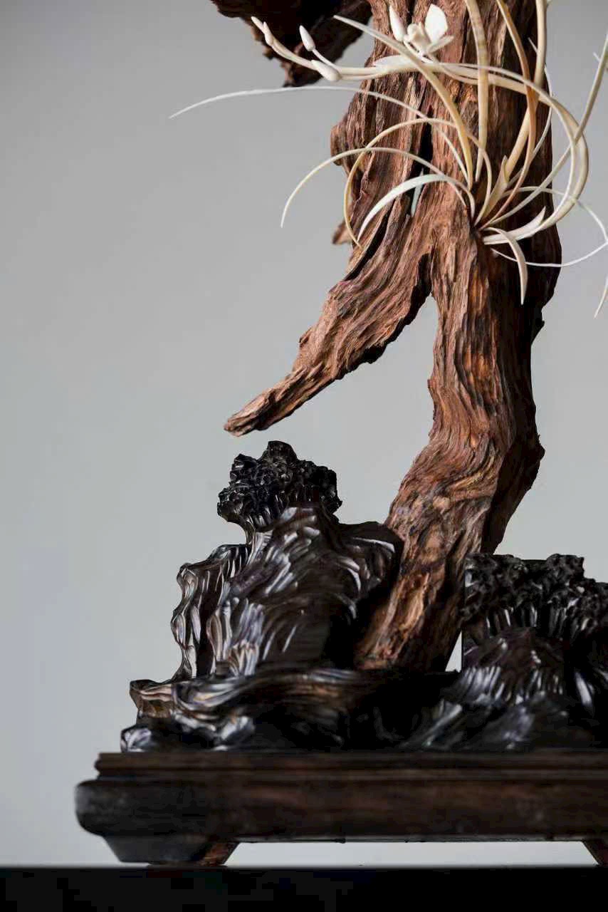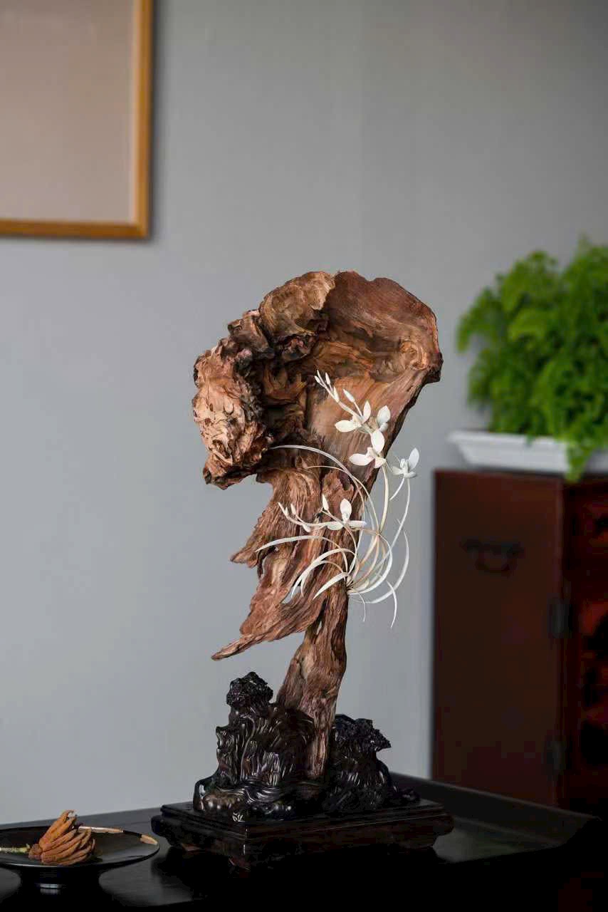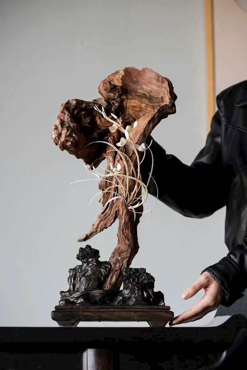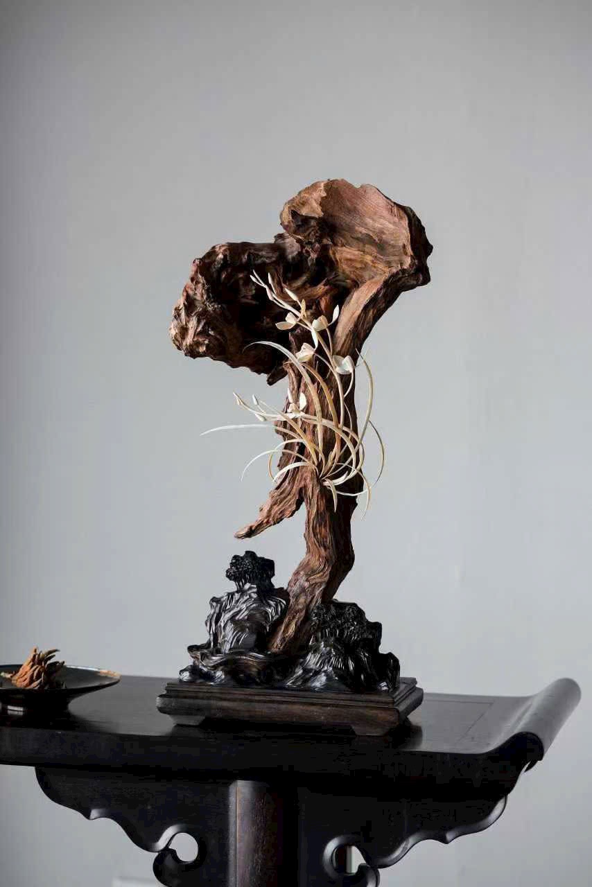 Thớ gỗ đen huyền như mực, ngà được xuyên tạc chạm thành khóm lan. Cánh hoa tầng lớp đọng sương, lan nép vào phiến đá gầy mà sinh. Đặt nơi trà tịch liền lan tỏa nét thanh nhã, gợi ý cảnh “ngồi lâu chẳng hay hương đã đầy phòng”.