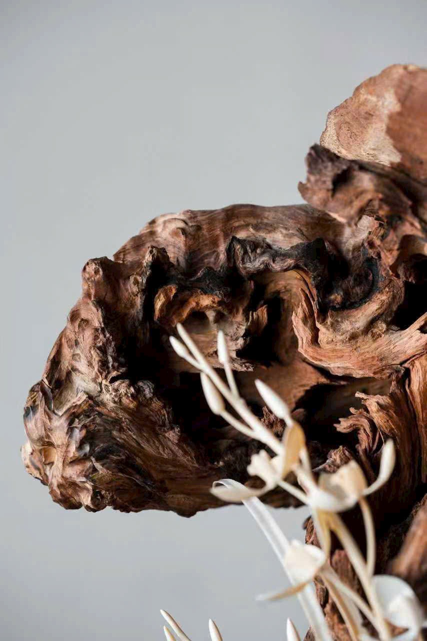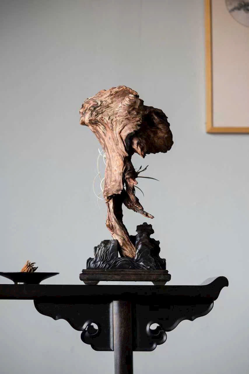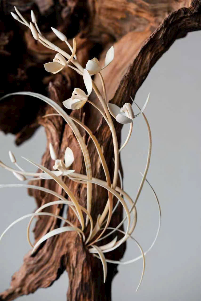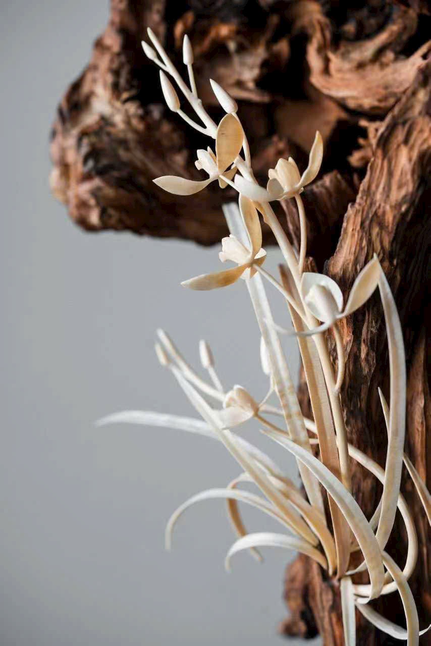 Thớ gỗ đen huyền như mực, ngà được xuyên tạc chạm thành khóm lan. Cánh hoa tầng lớp đọng sương, lan nép vào phiến đá gầy mà sinh. Đặt nơi trà tịch liền lan tỏa nét thanh nhã, gợi ý cảnh “ngồi lâu chẳng hay hương đã đầy phòng”.