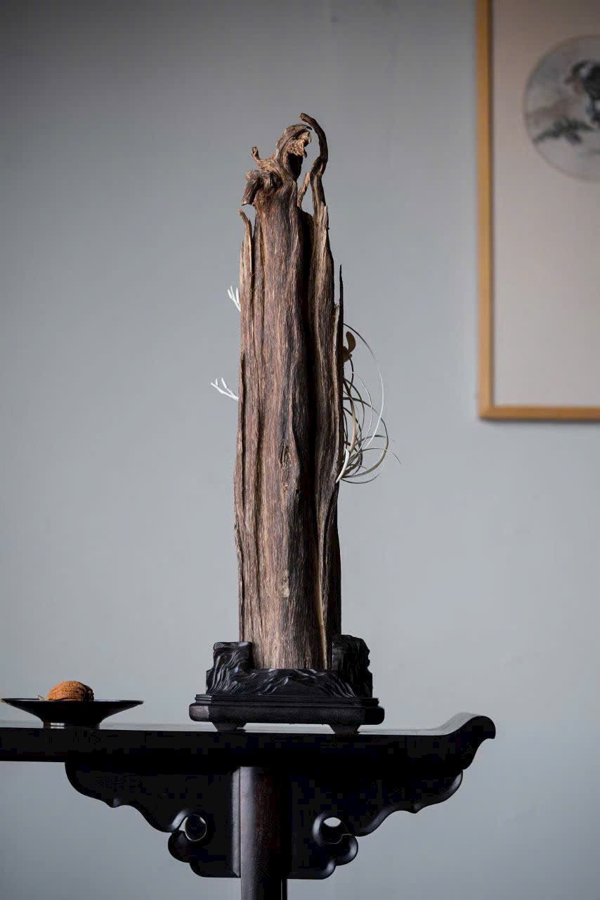 Trầm hương mang sắc trầm cổ, tỏa hương thanh nhã, trên đó khảm ngà ma mút chạm hình lan thảo lay gió.