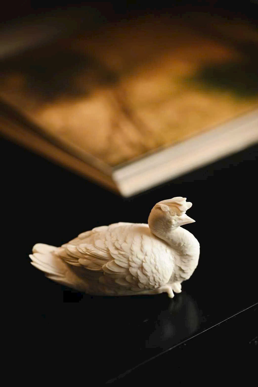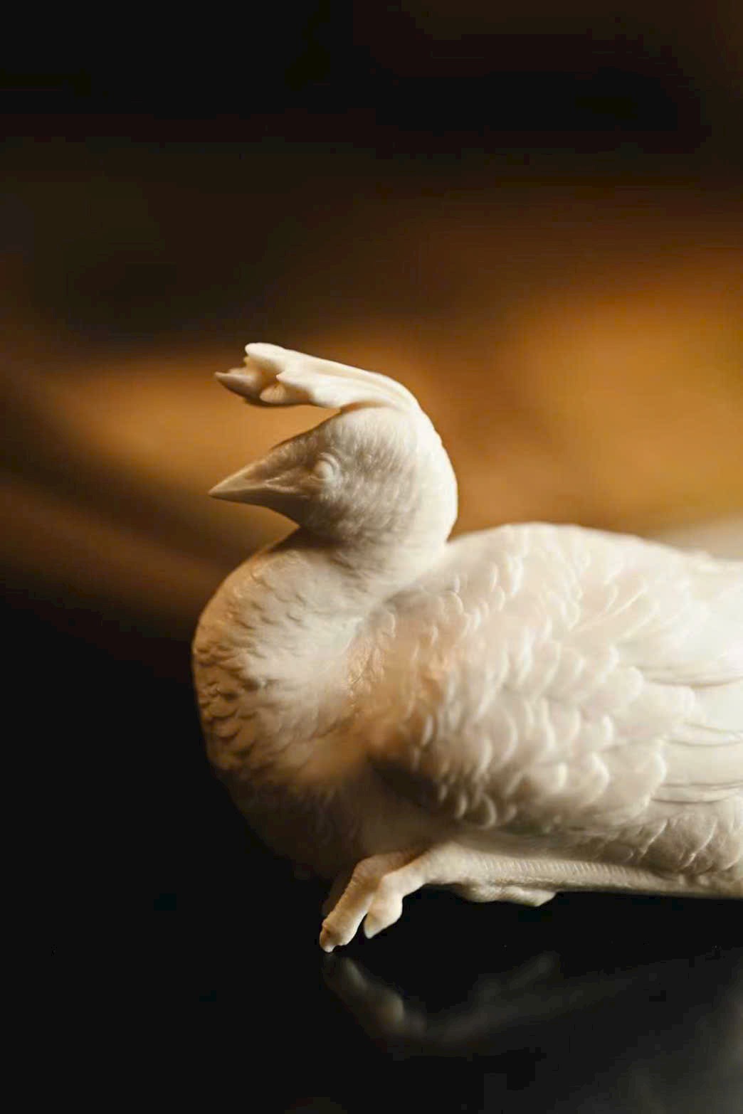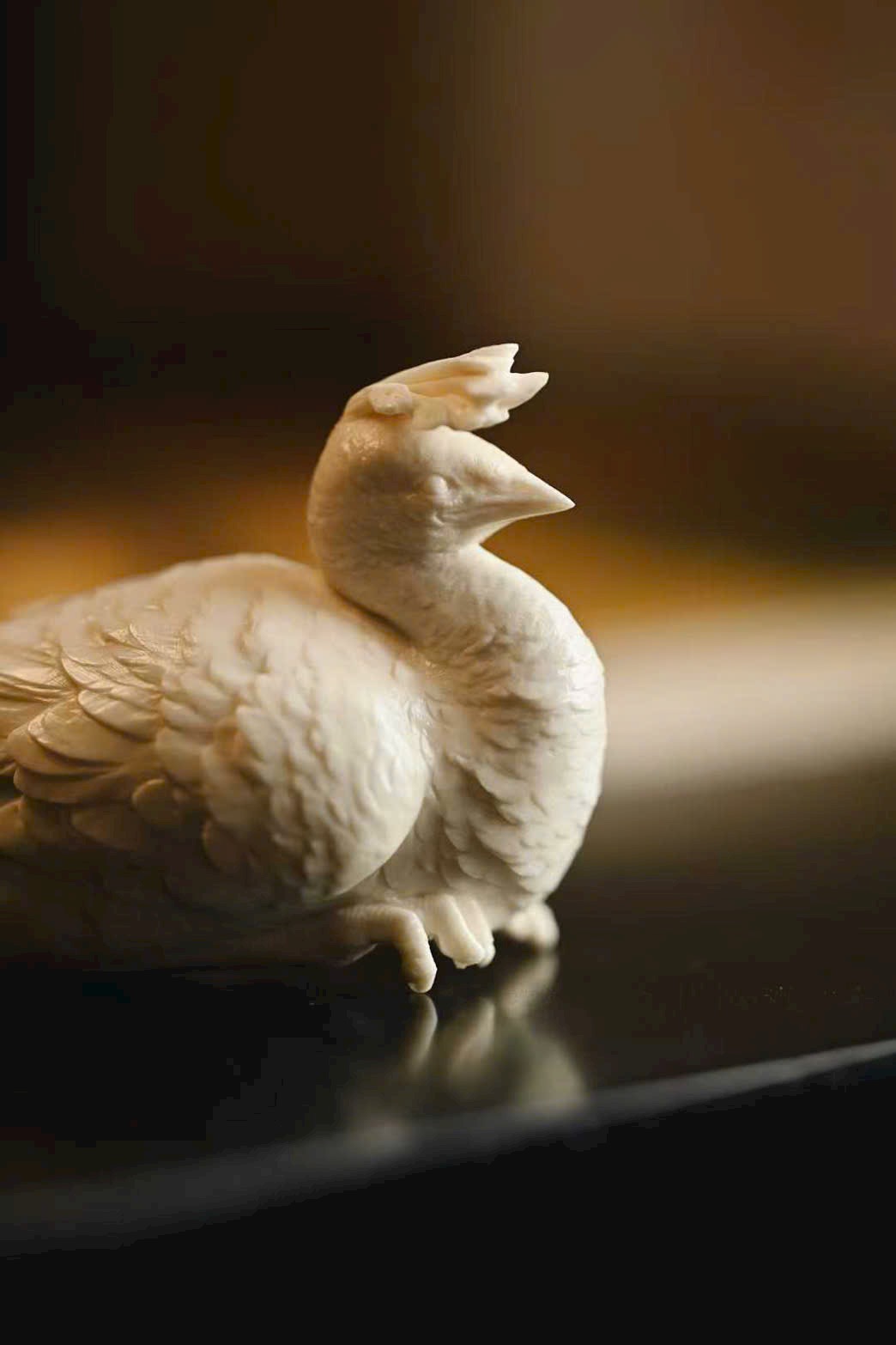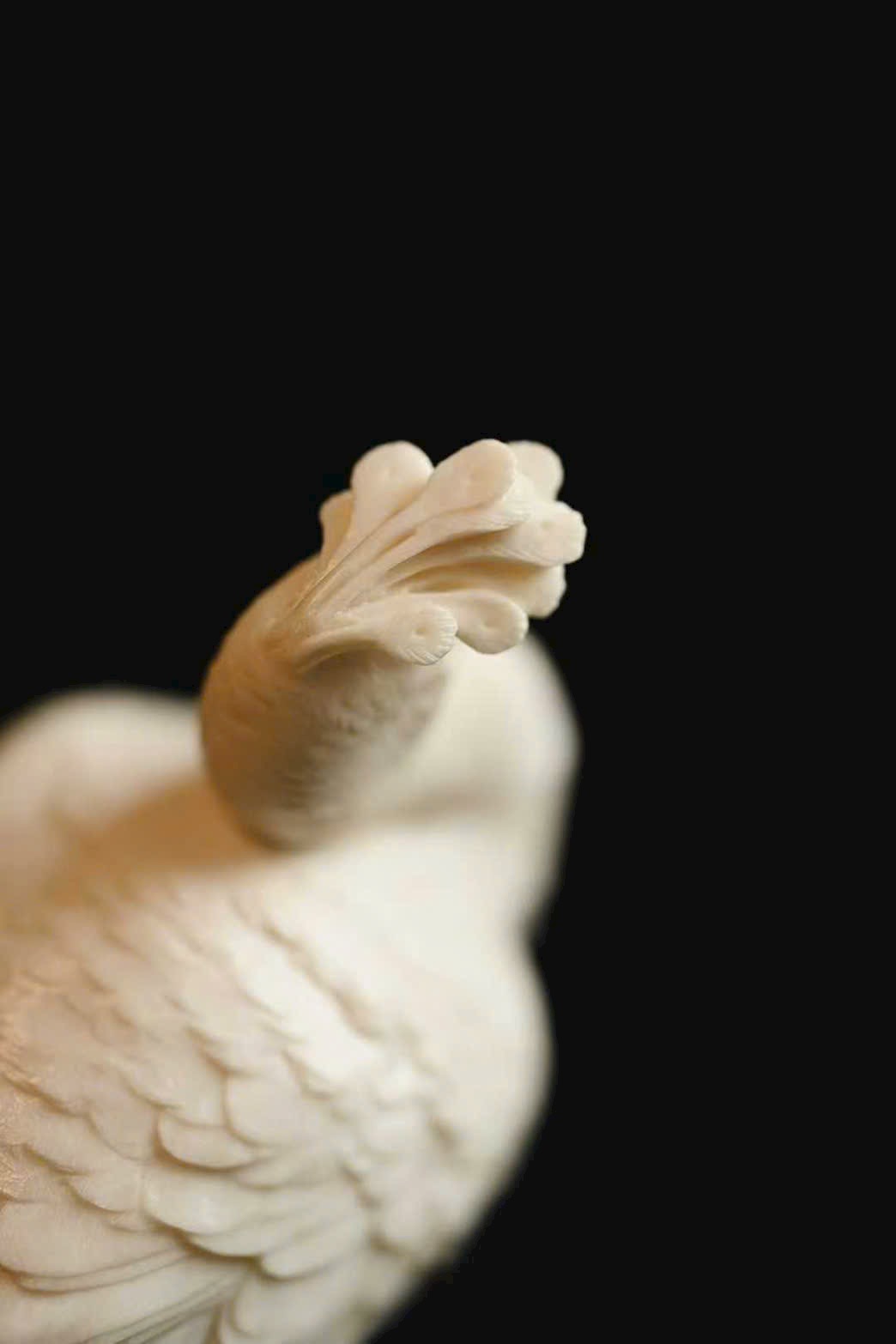 Tạo hình thẳng khỏe, vững dáng, chim công thần thái tập trung, ánh mắt kiên định, toát lên trọn vẹn vẻ cao quý. Phần đuôi lông dày mà không rối, lớp lang rõ ràng, tổng thể mang ý vị thanh nhã, đặt trên án kỷ giúp không gian thêm trang trọng, cát hòa.
