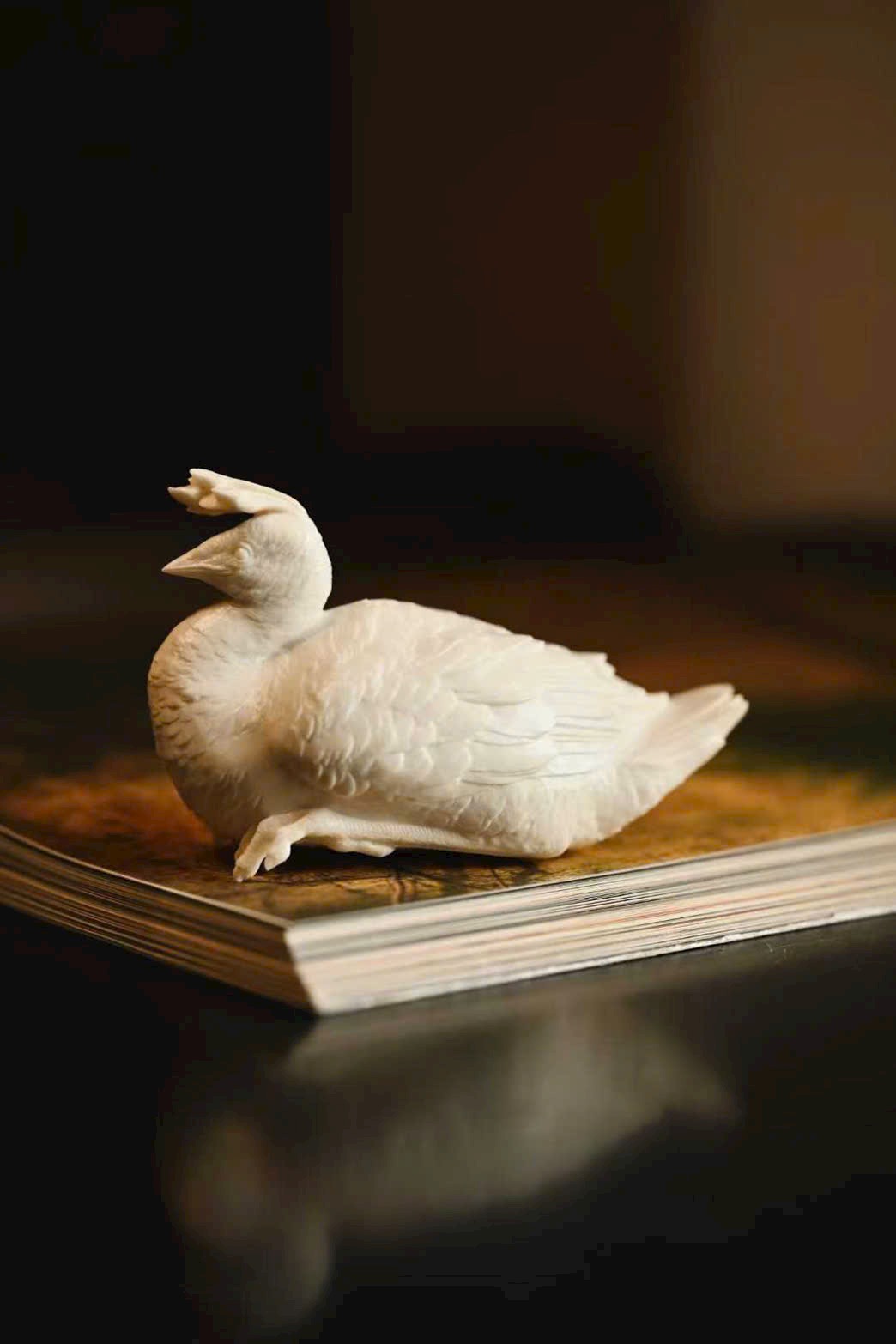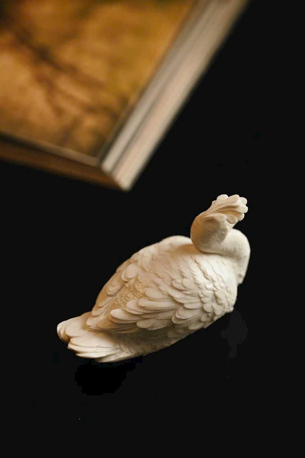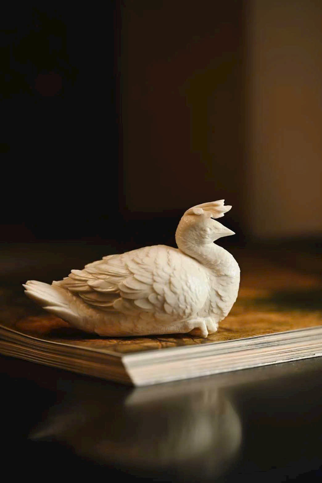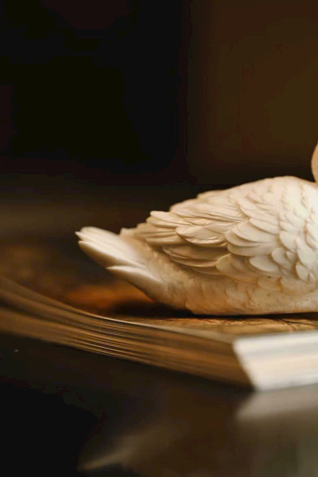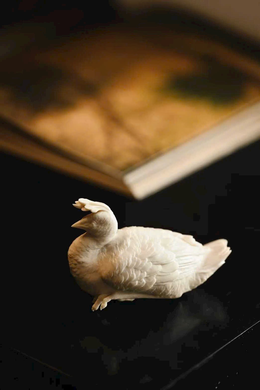 Tạo hình thẳng khỏe, vững dáng, chim công thần thái tập trung, ánh mắt kiên định, toát lên trọn vẹn vẻ cao quý. Phần đuôi lông dày mà không rối, lớp lang rõ ràng, tổng thể mang ý vị thanh nhã, đặt trên án kỷ giúp không gian thêm trang trọng, cát hòa.