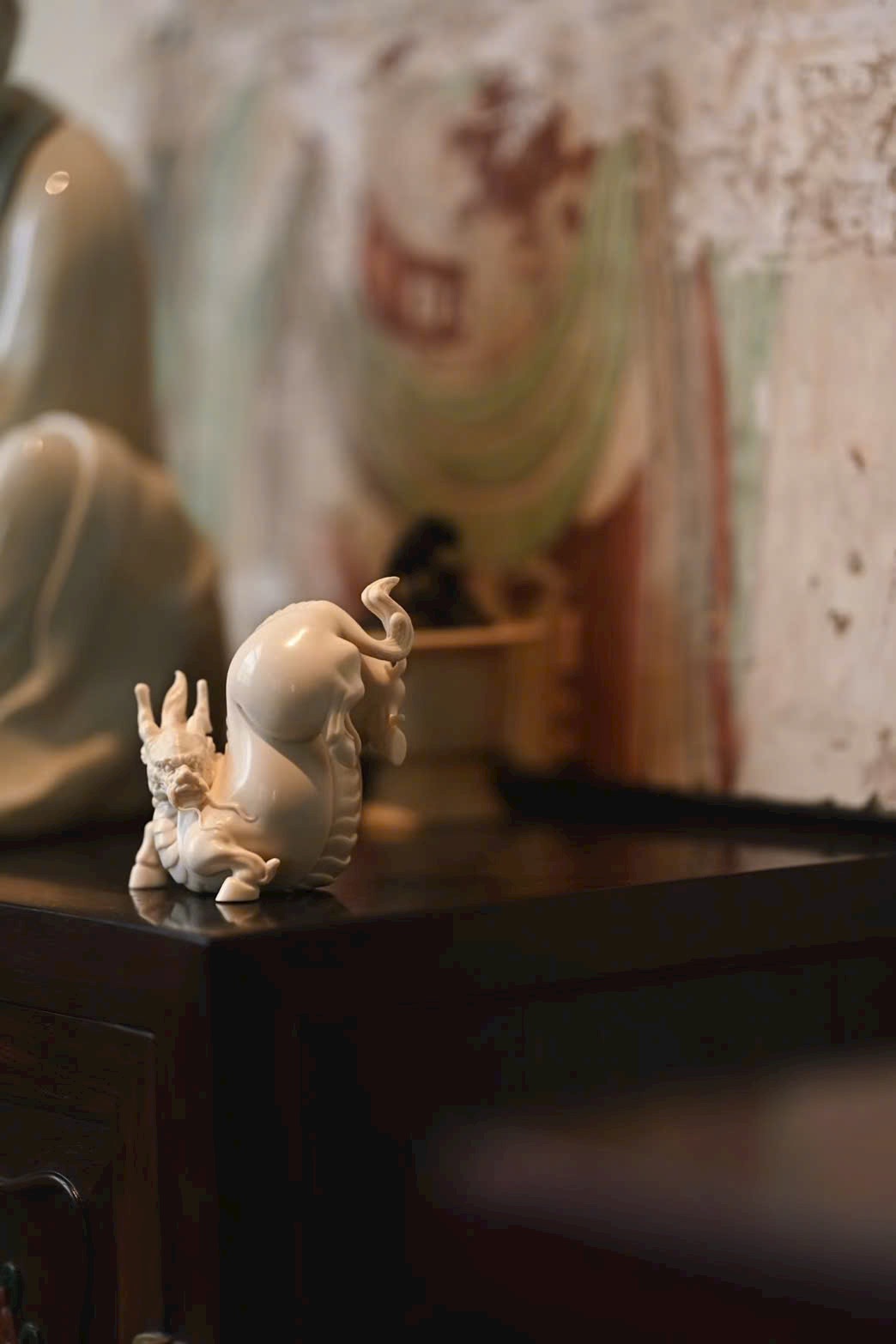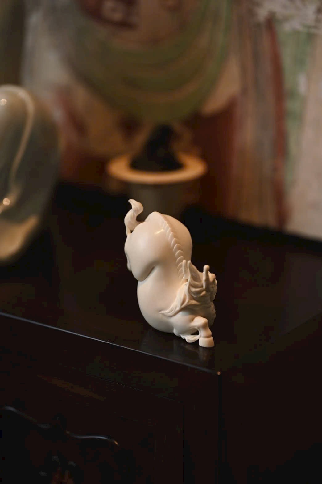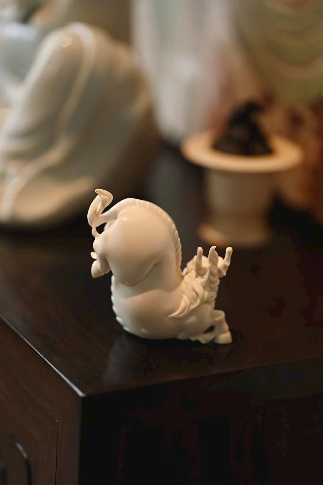 Kì lân đôi mắt sáng rực, bờm cổ tung bay, khí thế uy mãnh nhưng vẫn pha chút dáng vẻ đáng yêu.