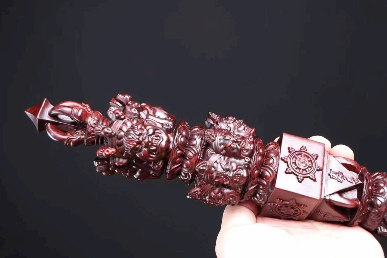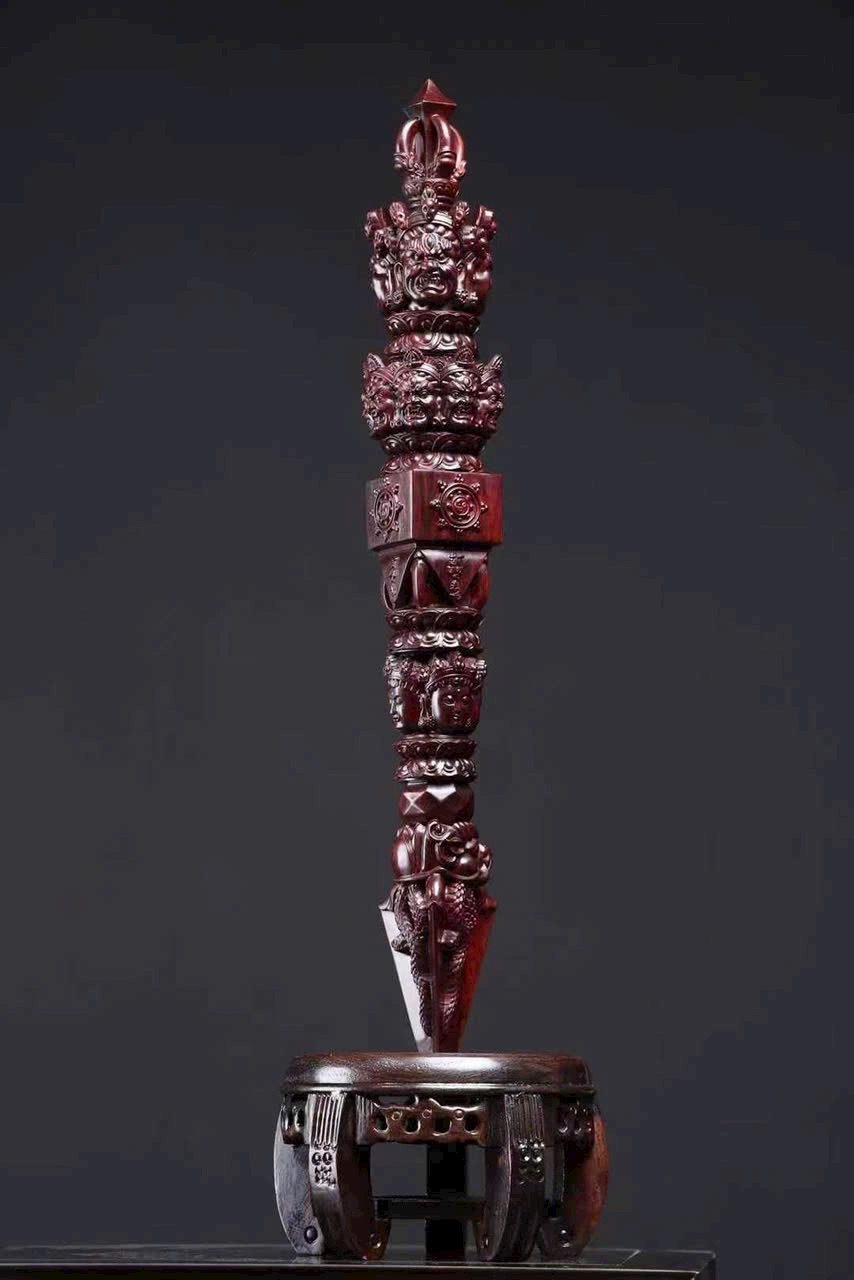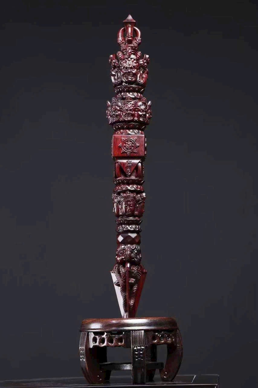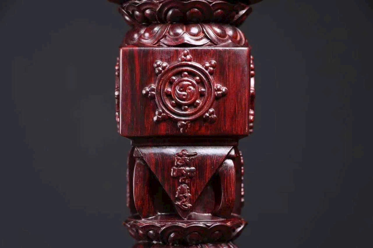 Chế tác từ gỗ tiểu diệp tử đàn Ấn Độ nguyên khối, kim cang xử mang hình thức cổ điển với tỷ lệ cân đối, từng đường nét chạm khắc sắc sảo, mạnh mẽ mà trầm tĩnh.
