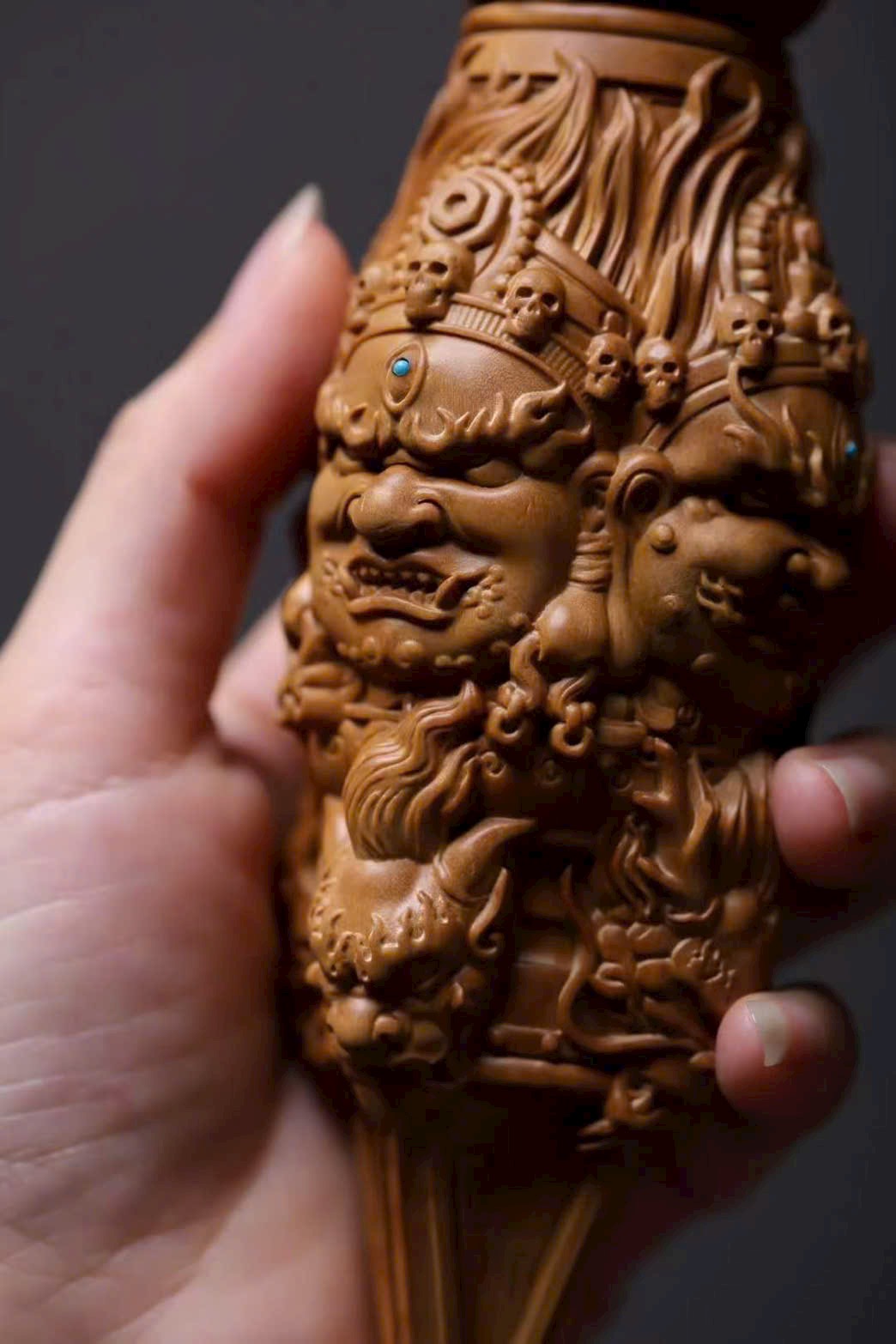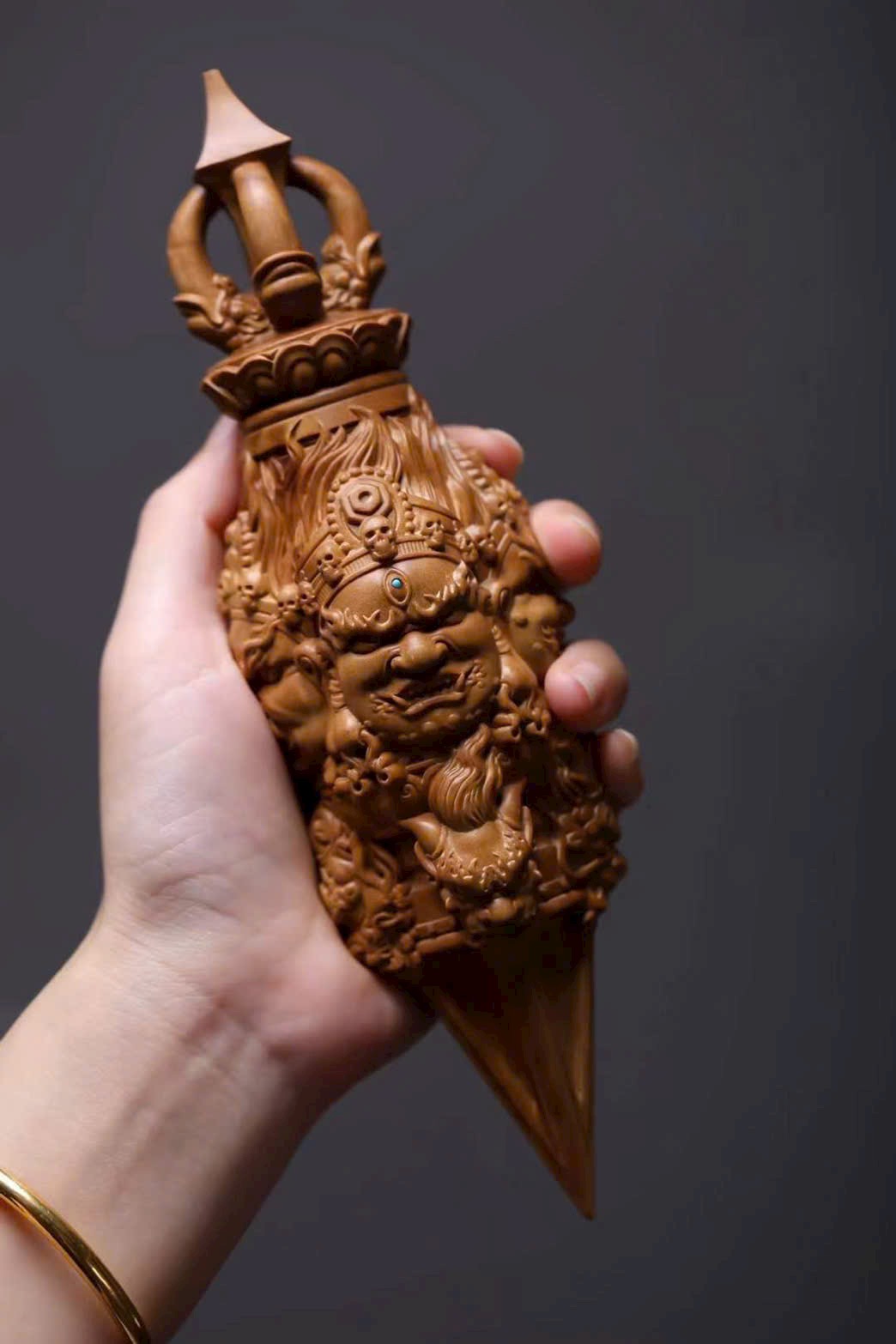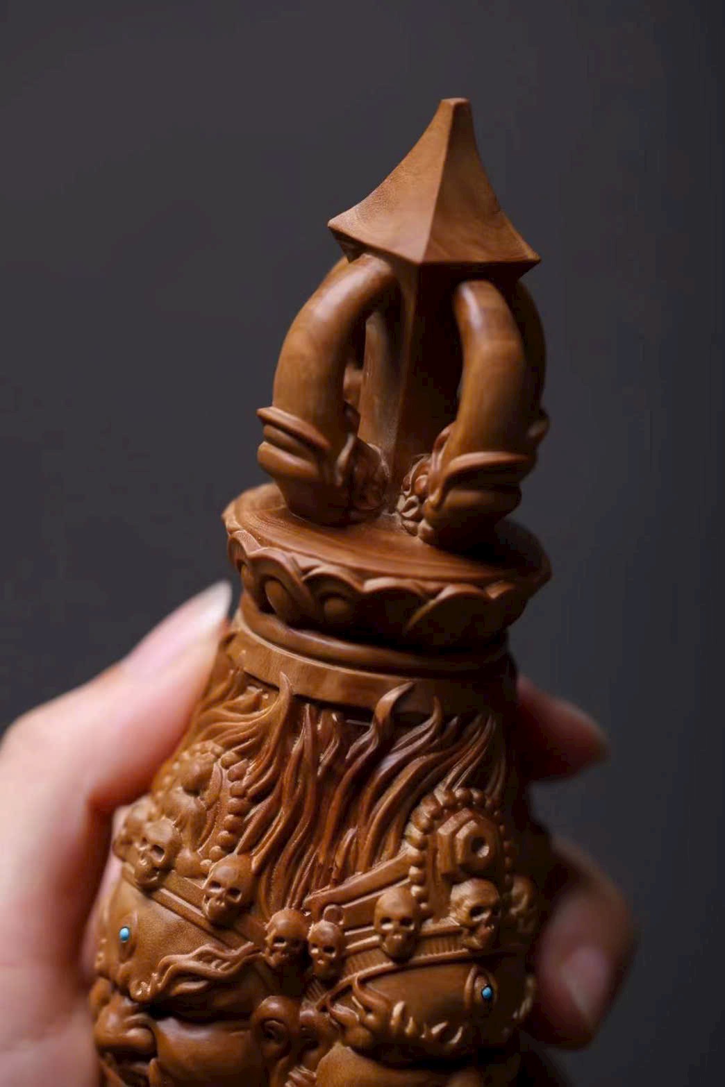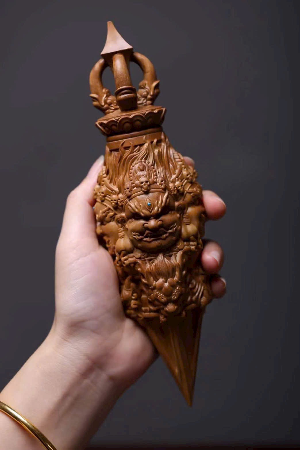 🌿 Tác phẩm làm từ đàn hương Ấn Độ (lão sơn), khắc hình Kim Cang Hàng Ma Chử – pháp khí Phật giáo tượng trưng cho sức mạnh trí tuệ, trừ tà diệt ác, hộ thân bình an. Họa tiết thần linh thể hiện ý nghĩa bảo hộ và trừ tai giải nạn.