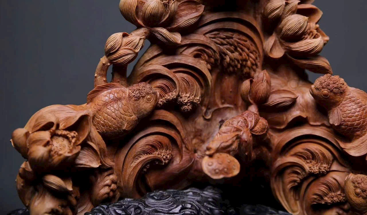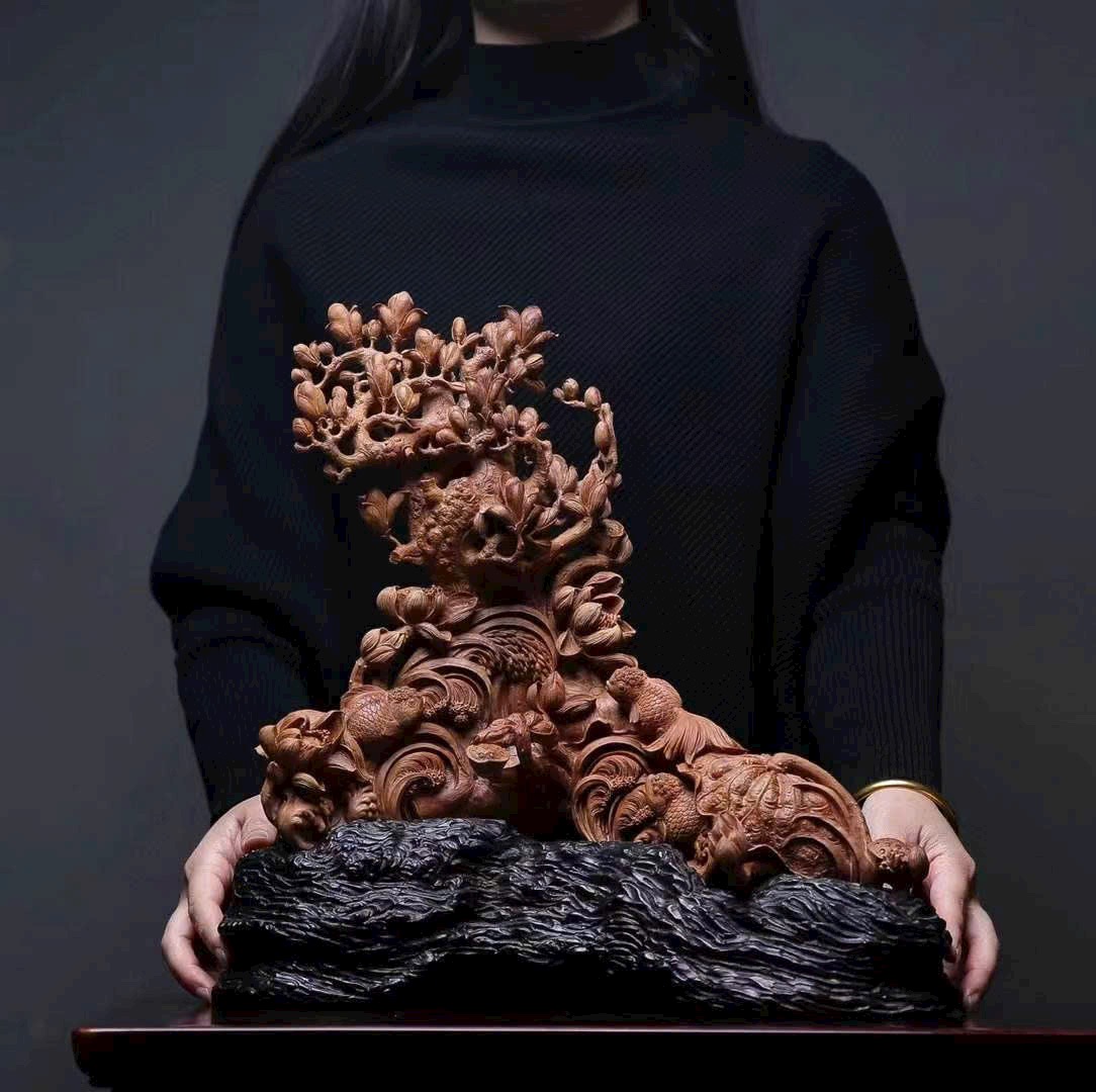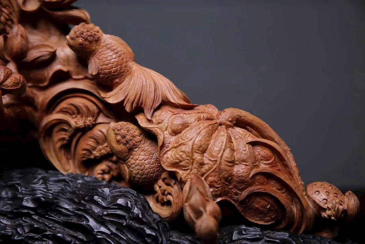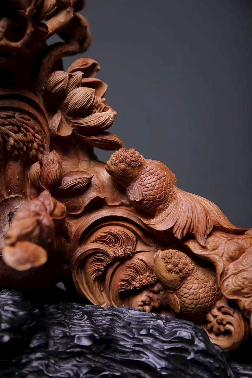 Từng đường chạm khắc như bút họa, tái hiện cảnh hoa nở rực rỡ, cá vàng tung tăng trong dòng nước – gửi gắm ước nguyện cuộc sống phú quý, tươi đẹp và viên mãn. Tác phẩm cũng là biểu tượng của tri thức phong phú, phúc lộc đủ đầy.