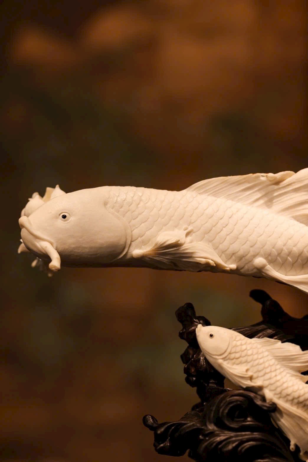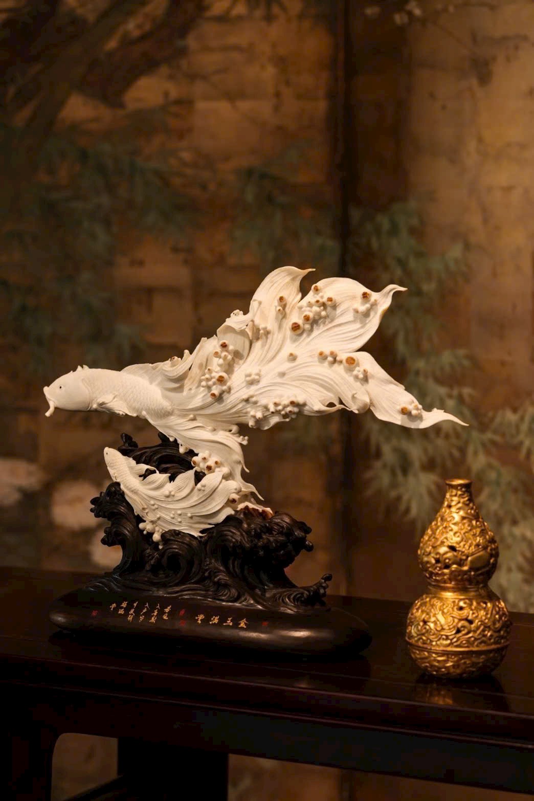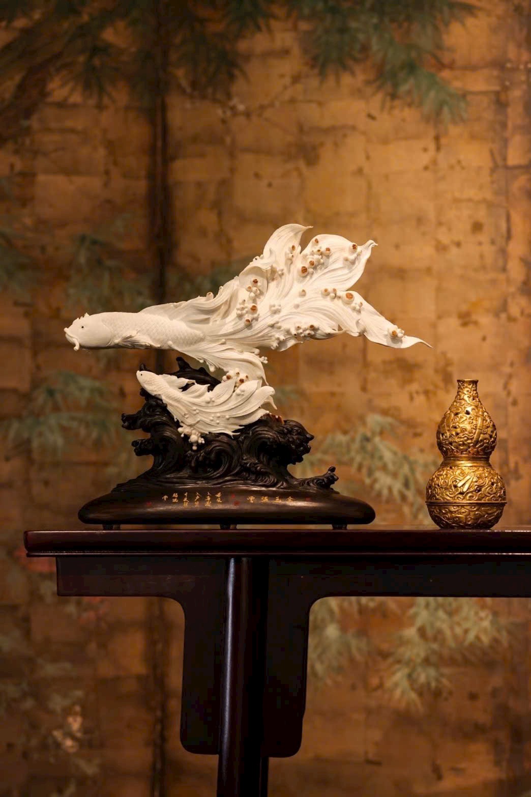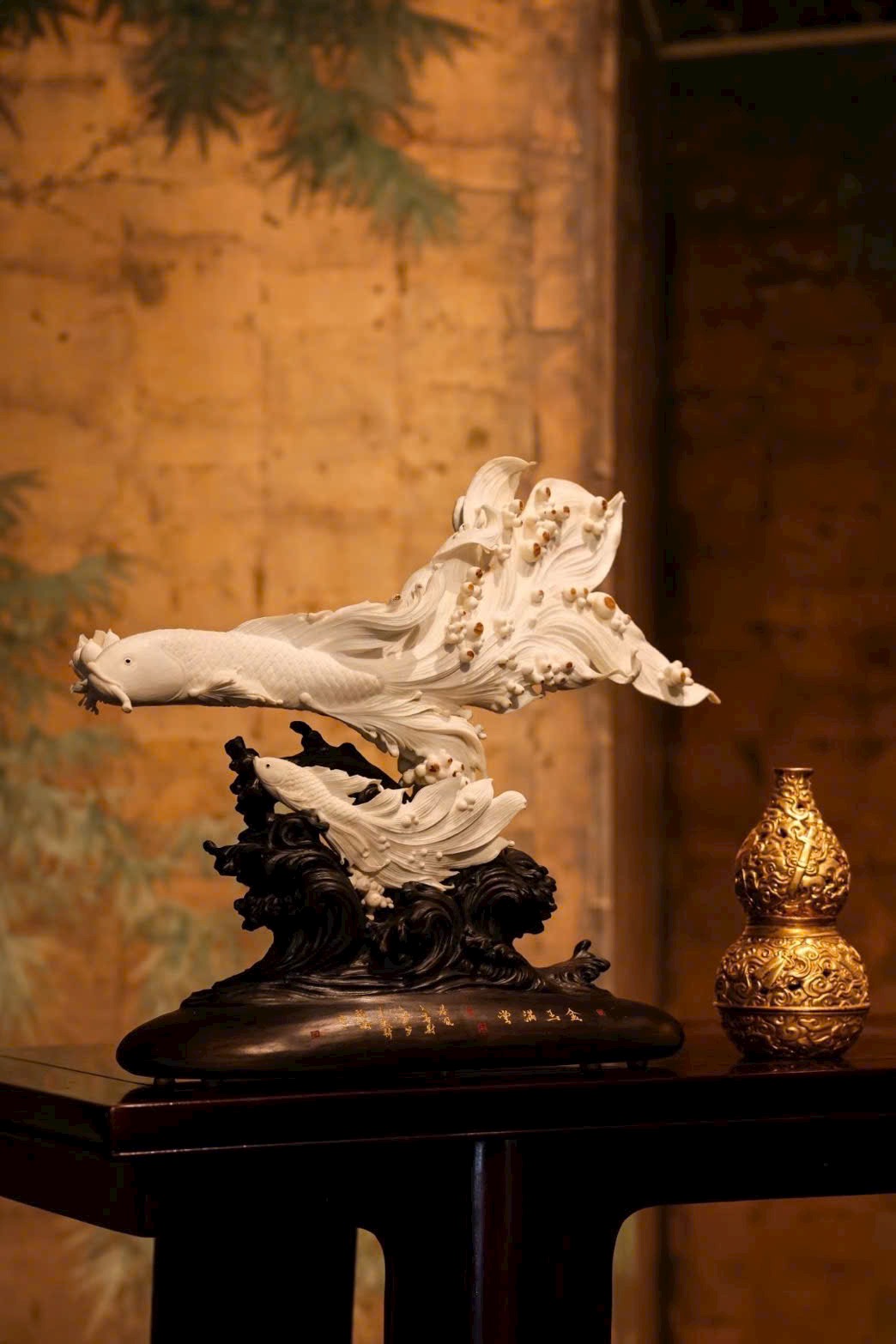 Tuyển chọn chất liệu gạc hươu thượng hạng, phối màu trang nhã thanh thoát. Hình tượng cá vàng được chạm khắc với thân hình đầy đặn, tròn trịa; vây cá dựng lên sống động. Cá vàng tung nhảy, thể hiện sinh động linh hoạt.