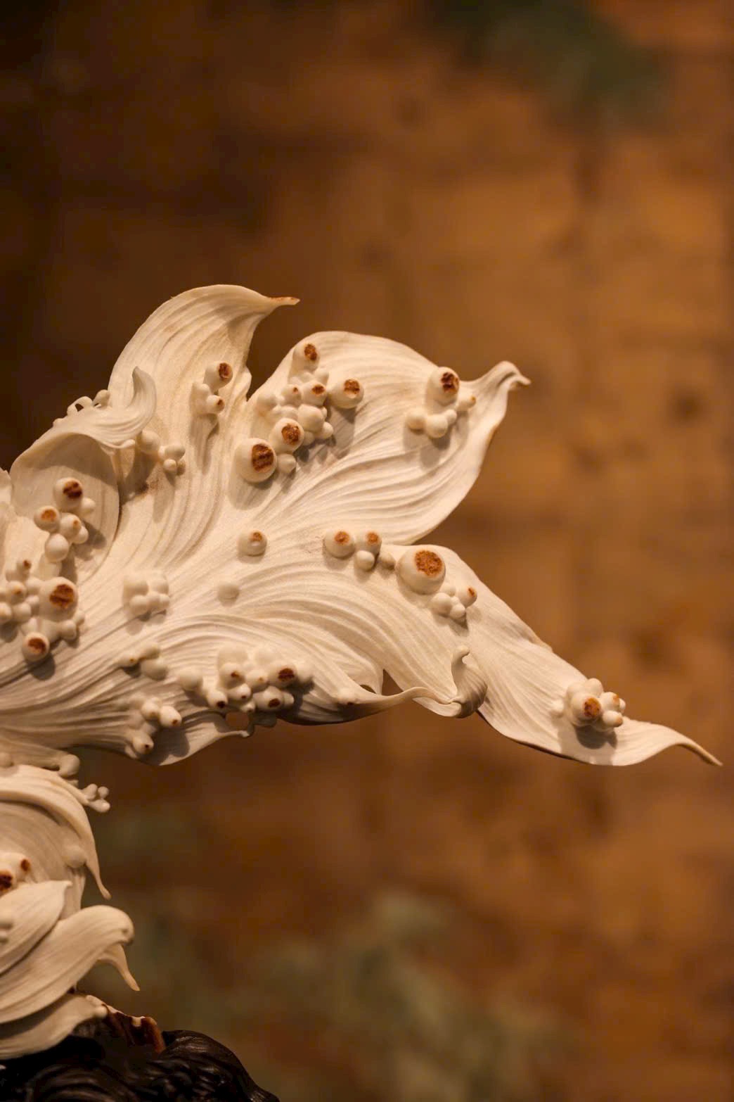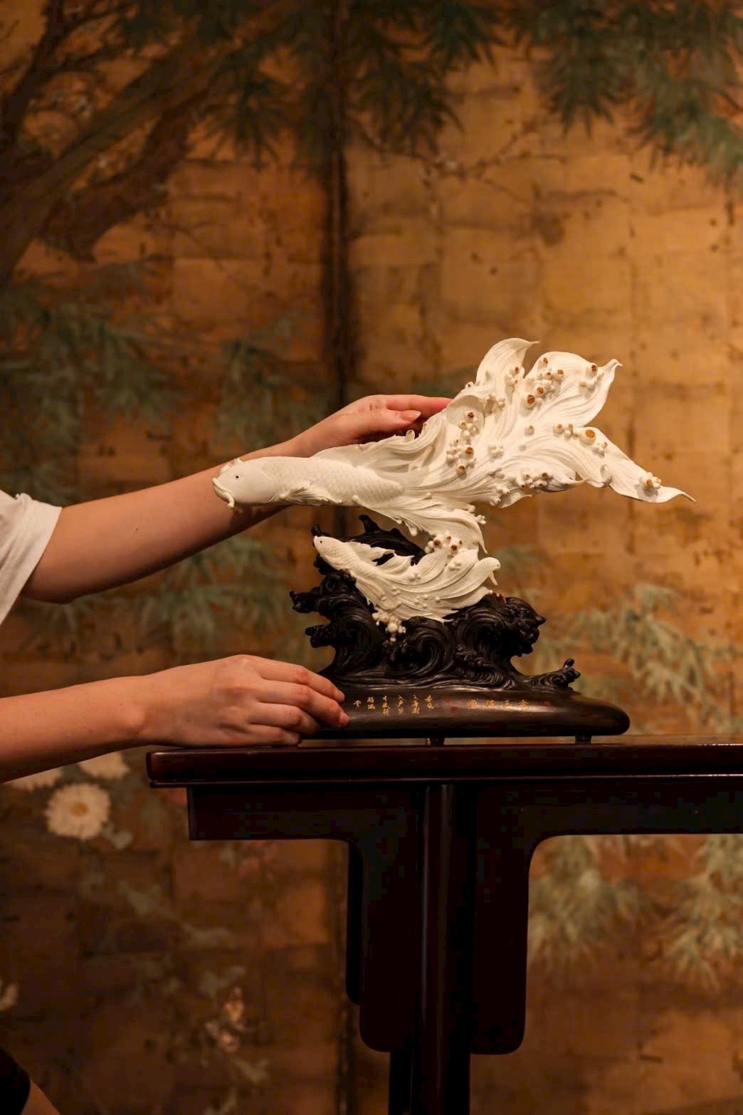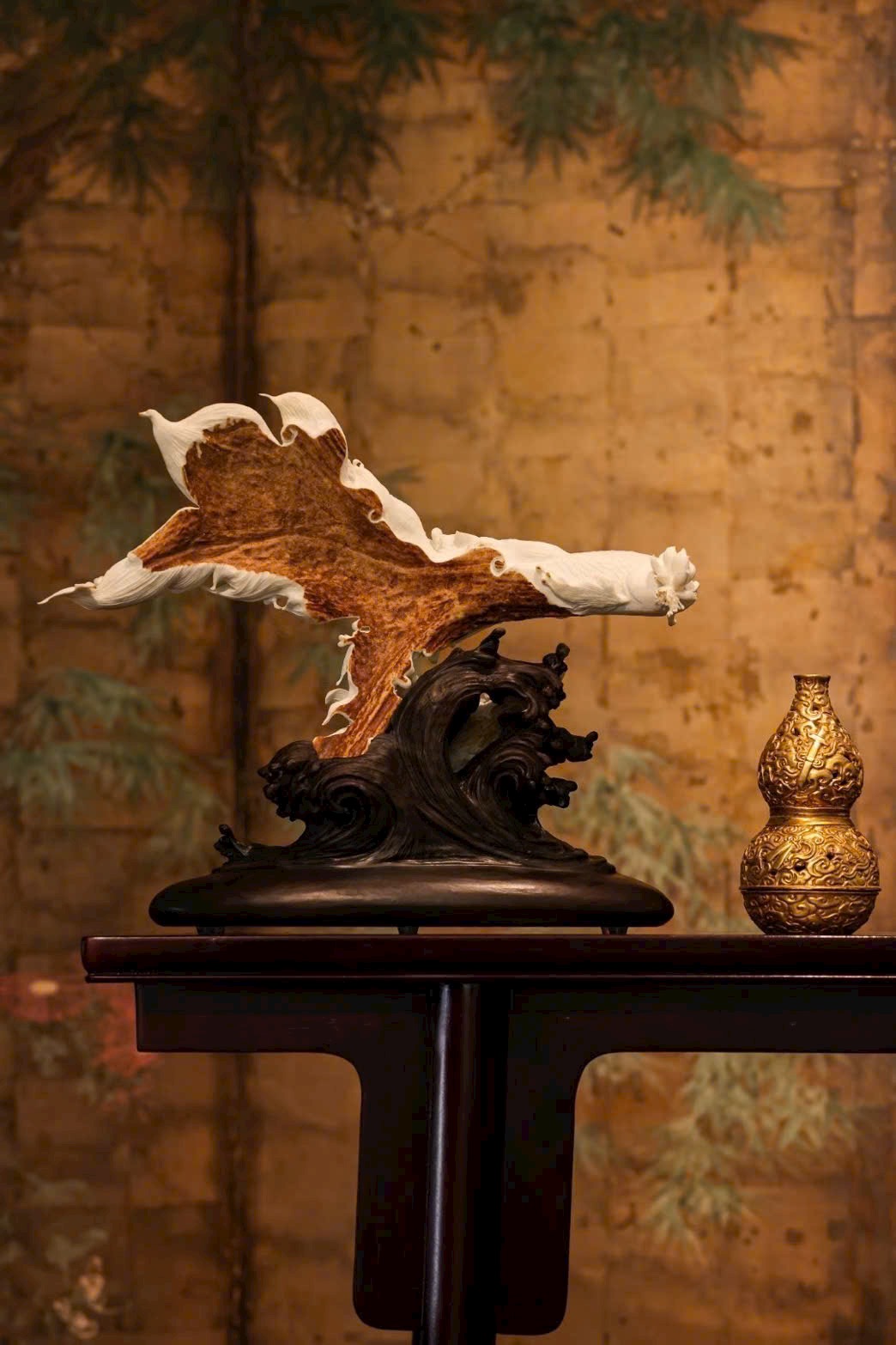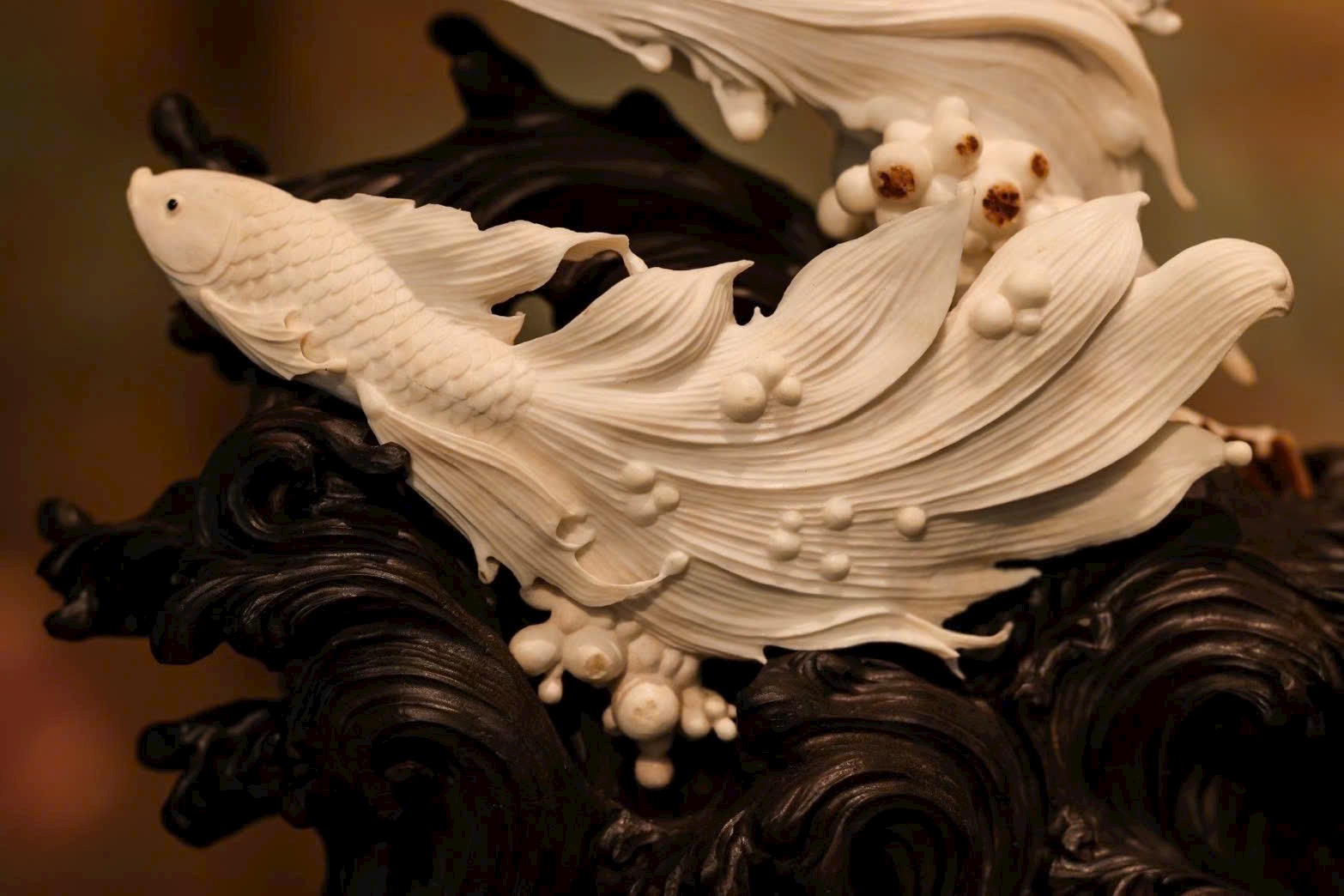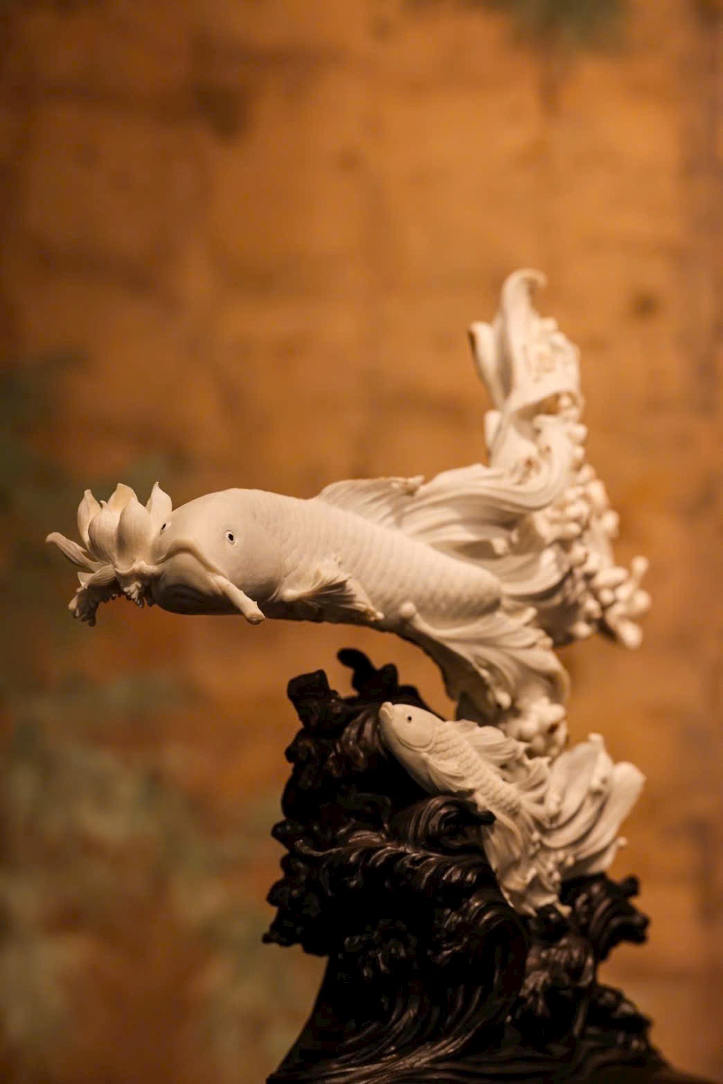 Tuyển chọn chất liệu gạc hươu thượng hạng, phối màu trang nhã thanh thoát. Hình tượng cá vàng được chạm khắc với thân hình đầy đặn, tròn trịa; vây cá dựng lên sống động. Cá vàng tung nhảy, thể hiện sinh động linh hoạt.