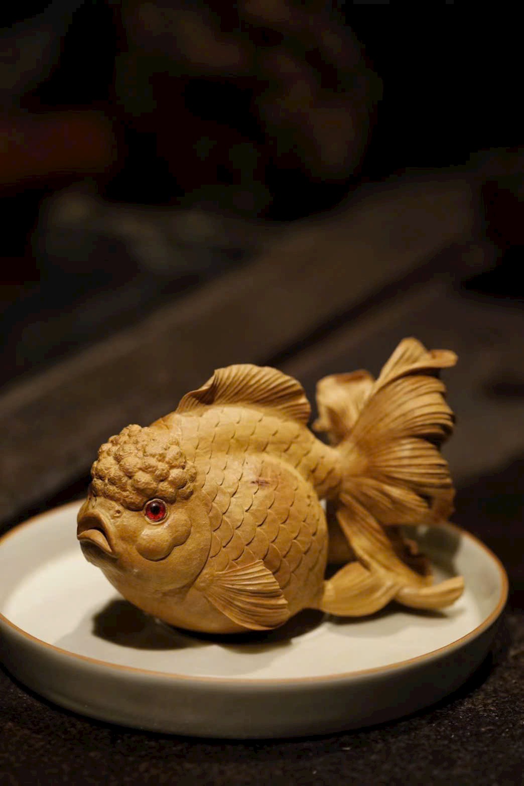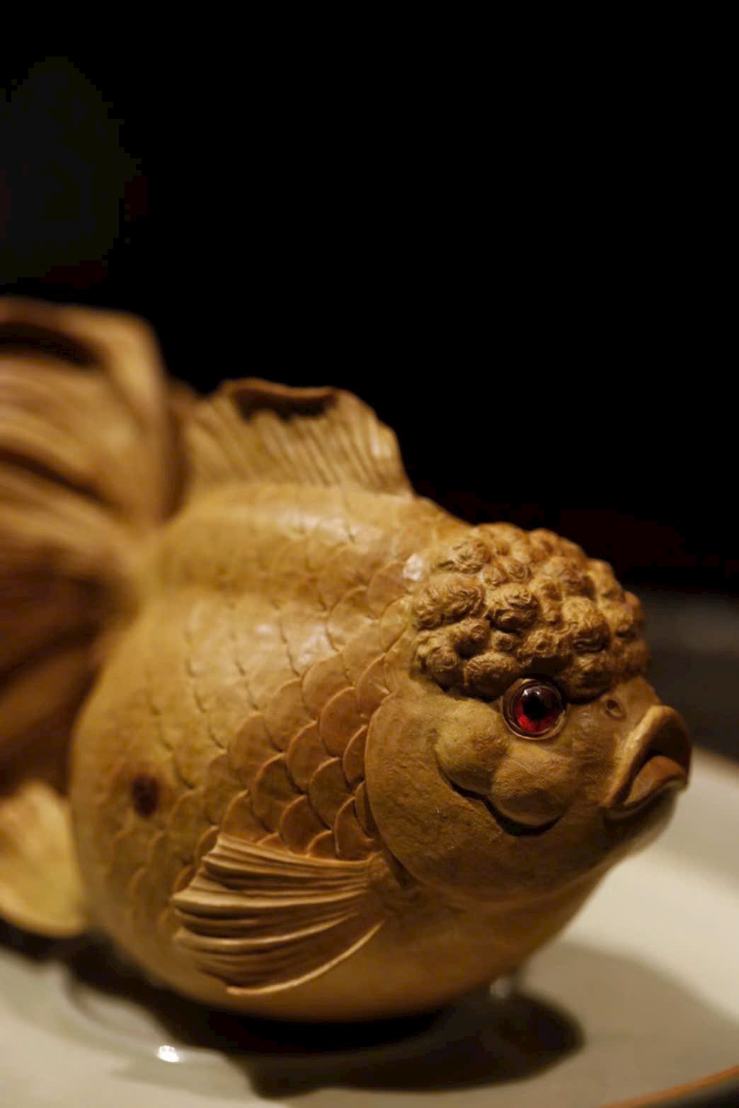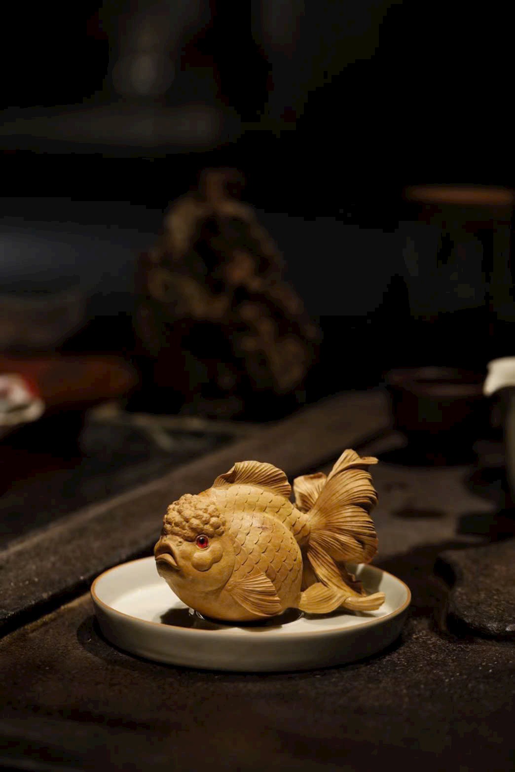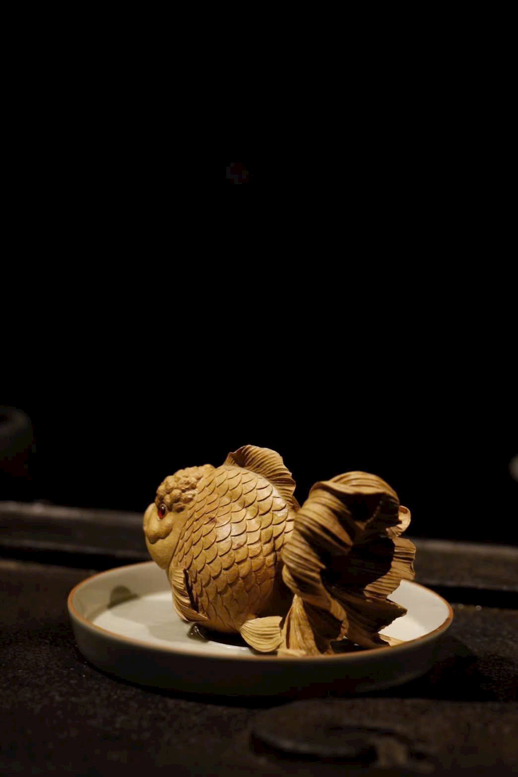 Thân cá vàng đầy đặn, vảy xếp lớp rõ ràng, đuôi xoè mềm mại như dải lụa, đôi mắt đỏ linh động sinh thần. “Ngư” đồng âm với “dư”, vì vậy cá vàng mang ý nghĩa “kim ngọc mãn đường, năm nào cũng dư dả”. Đây là món phẩm văn phòng vừa ngắm vừa chơi, đặt trên án thư đem lại điềm lành bền lâu.